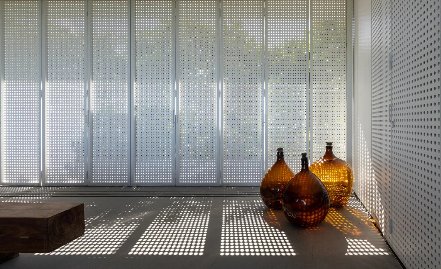 Under the pitched roof, measuring 60 meters long and 15 meters wide, a large terrace connects the gardens on both sides, surrounding a white box that, as a house within the house, accommodates three bedrooms, a small studio, a bathroom and a living area wrapped in timber and cement panels. Independently from the main structure, this volume can be opened up completely, because the perforated panels function as folding screens, blurring the boundaries between interior and exterior.