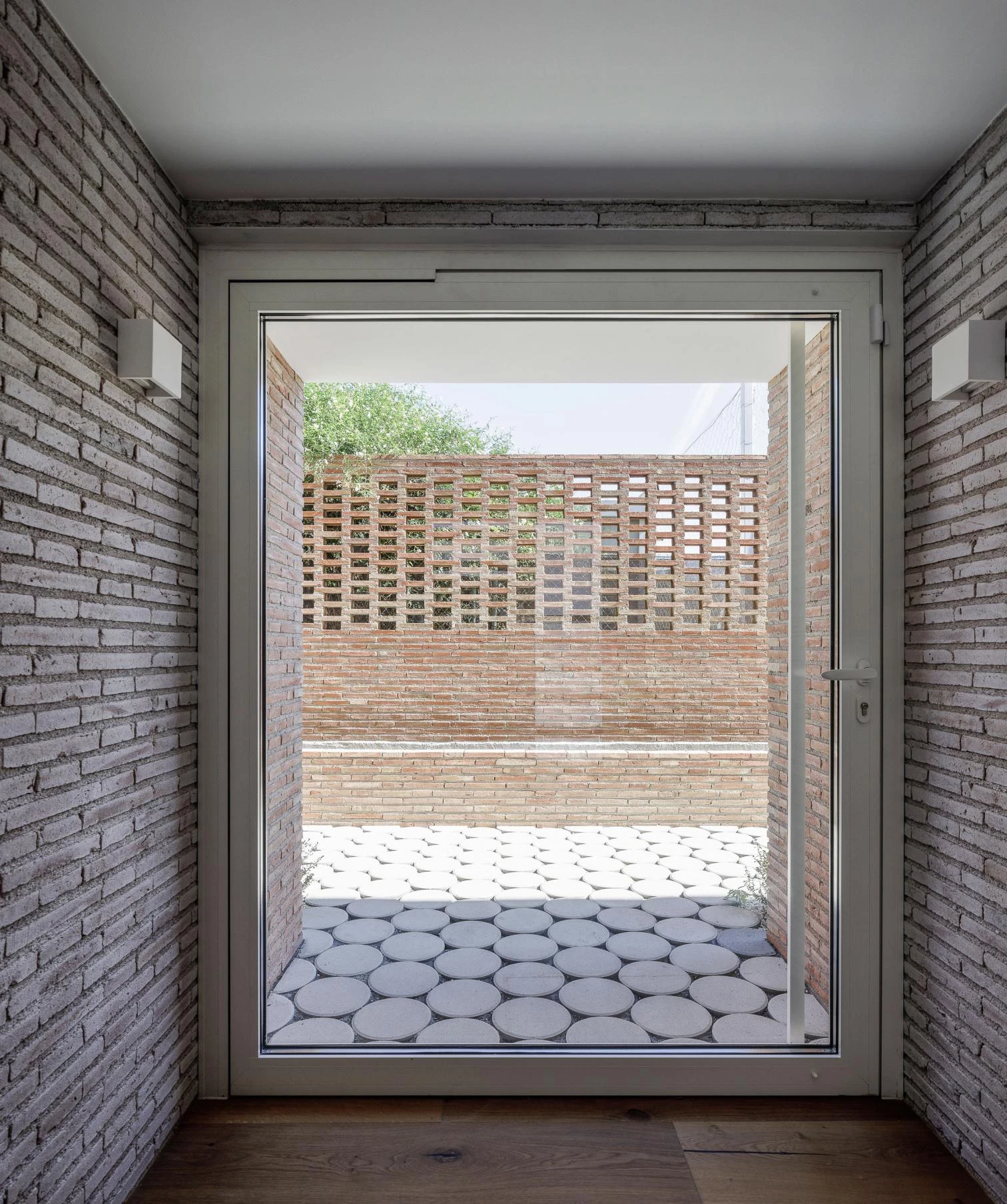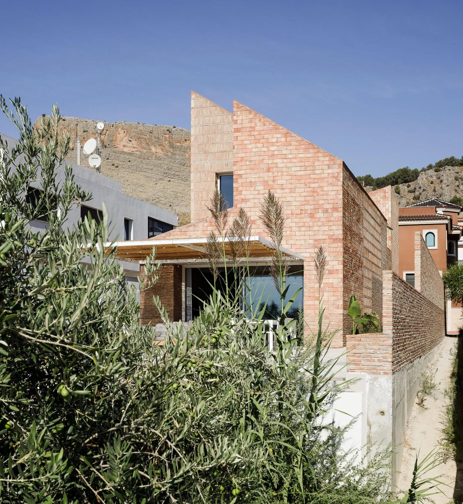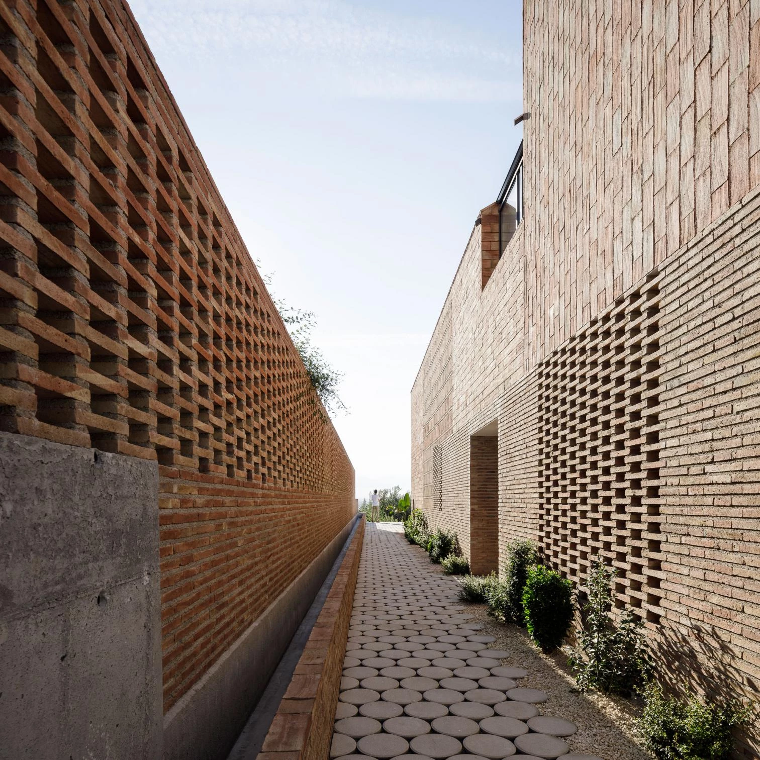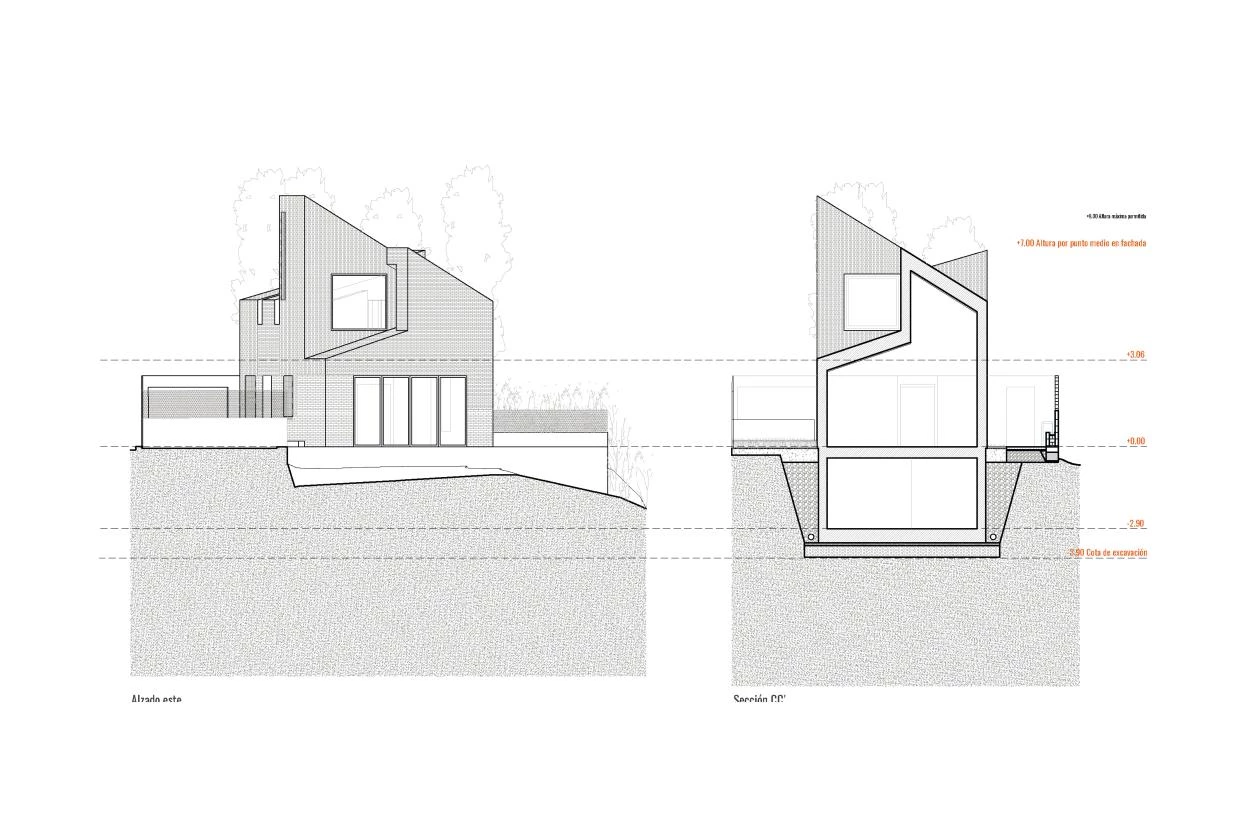 Executed with concrete and brick, the long volume adapts to the narrow site, which is conditioned by the ditch worker’s right-of-way on one of the long sides, required for his daily work maintenance of the irrigation ditch at one of the short sides. The elongated configuration also recalls tobacco drying rooms, accompanied here by the murmur of the water in the ditch. A series of sections establishes special relationships, in response to different boundary conditions. These include position, opaque walls varying in height, roofs sloping differently, and skylights, fretworks, and windows, which optimize incoming light and natural ventilation as well as views that at given points shoot through the entire house.