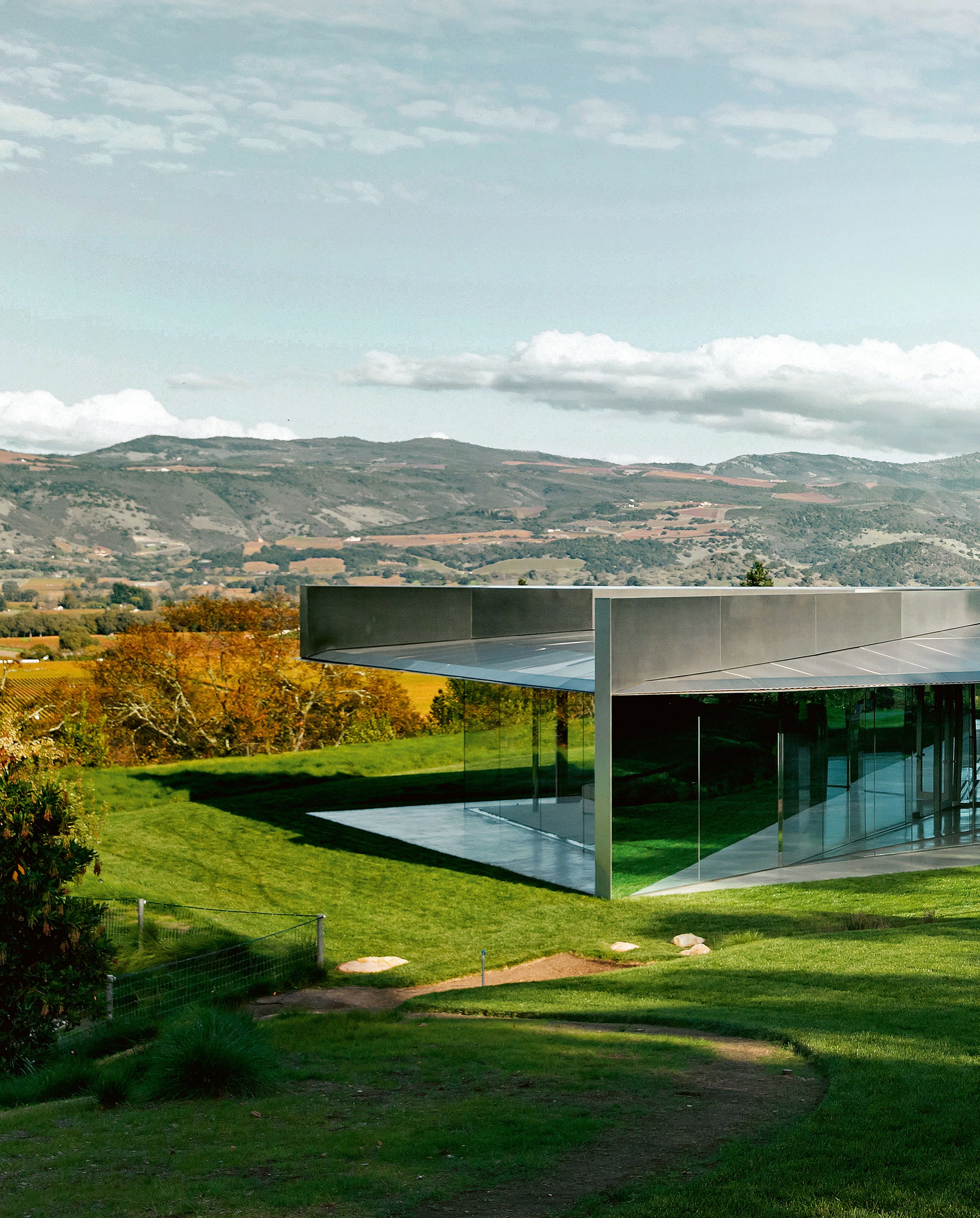 Developed over the course of a decade, the design of the Kramlich House went through different phases. The use of curved glass was envisioned from the beginning, but the initial courtyard-house schemes evolved into a pavilion with two underground levels that respond to the topography of the site and include an entrance tunnel. The unexpected construction of wine facilities next to the original location urged to look for a new site, this time up higher in the valley. However, the most significant moment was the interruption of the works in 2002, with the foundations completed, due to economic factors. The process was resumed two years later, and construction commenced in 2007 but with different program.