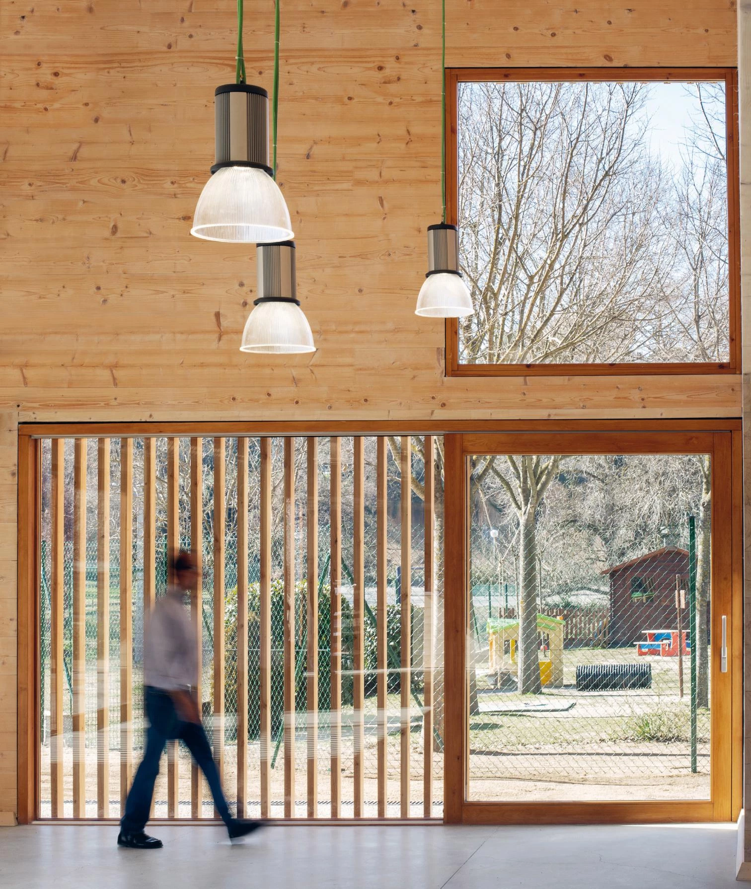Structural timber panels are used in all spaces and the roof, the height and slope of which varies depending on use: the activity rooms have higher ceilings while the circulation areas, offices, and services are lower.
