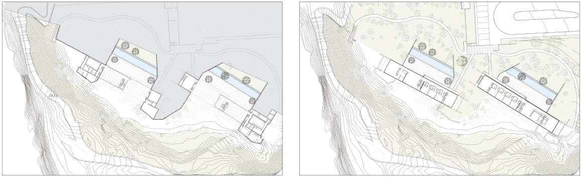 It was therefore essential to build two extended and compact prisms that would cover the full length of the terrain, celebrating the distant horizon. From afar the two pavilions meld together in a single clean and direct stroke, creating a contrast at the same time with the relief of the rocks and the undulating mountainscape.