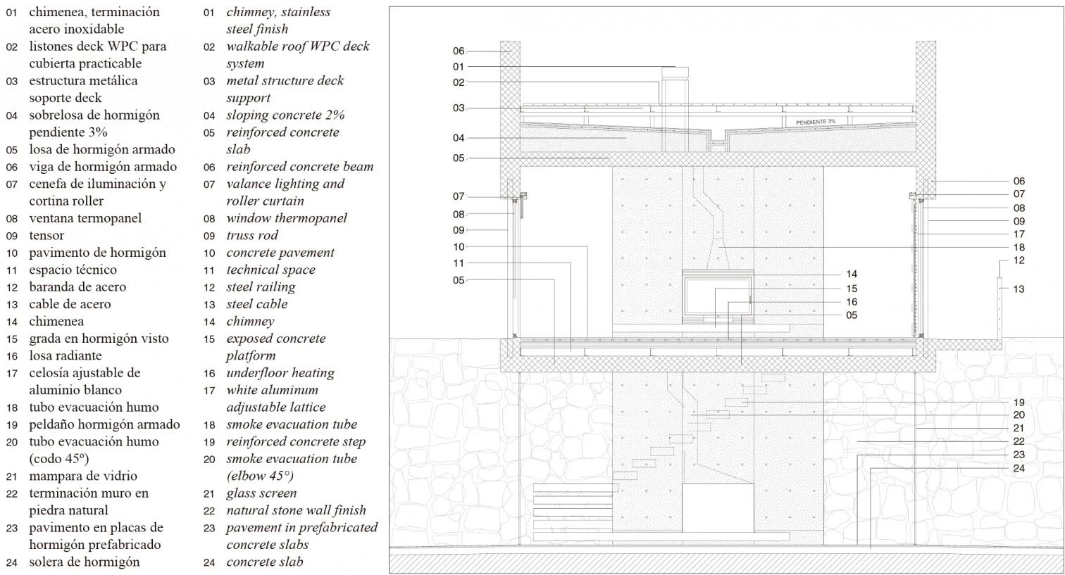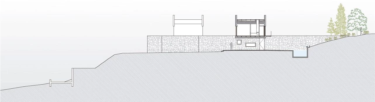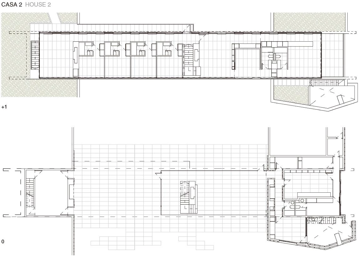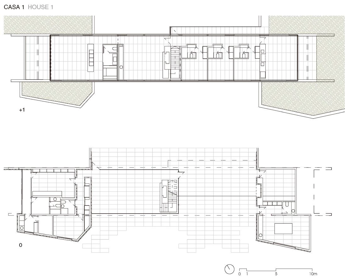 Under the bridge-pavilion an intermediate and tempered space, wrapped in glass for protection from the sea breeze, holds the more public and social program. As an extension of this space, in each house a patio was excavated and surrounded by stone walls that evoke the rocks by the seashore. This operation creates an introverted, generous space protected from the wind and open to the northern sun. A pond articulates the rational order imposed by the house with the rustic landscape that descends from the small hill created by the excavation.