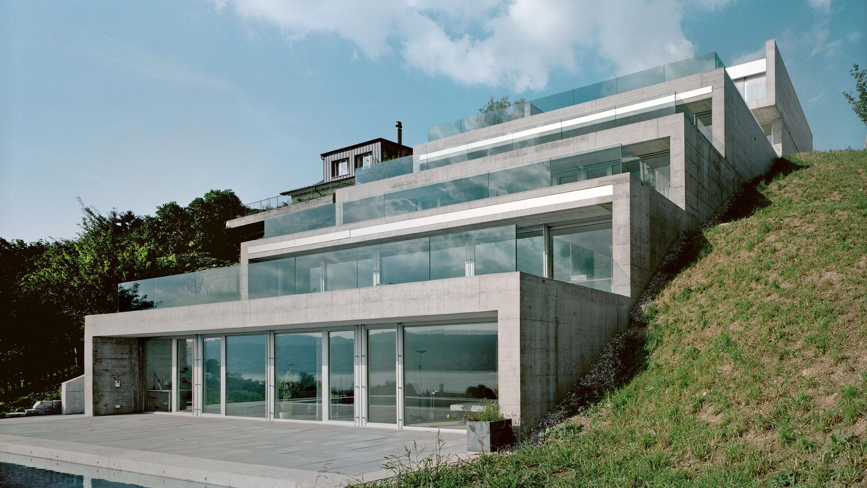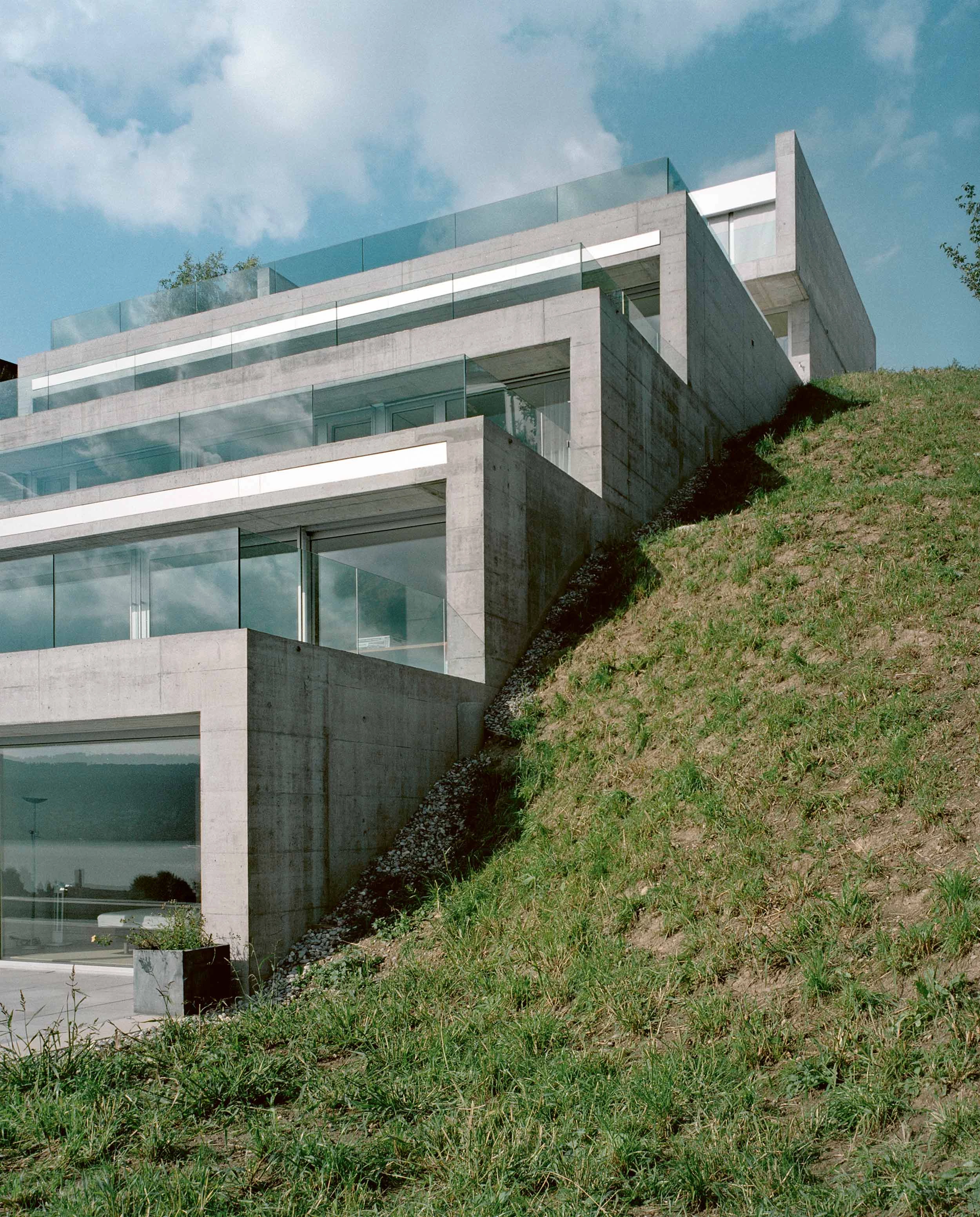 The high price of land in Switzerland turns the single-family dwelling type into a privilege within reach of only a few. In view of these circumstances, row houses emerge as an excellent alternative. The project for the construction of three dwellings in the city of Meilen, located by the shores of Lake Zurich, attempts to recover the essence of this type resorting to a radical strategy. A sloping plot above the railway station is defined by a terraced profile that descends towards the east. Six partially buried concrete boxes seem to sprout from the terrain. Thick opaque walls cover three of their four sides drawing a solid boundary with their nearby context, also screening them from neighbors. Sixteen-meter-long girders allow the southern facades to be spanned without columns. Only the east facade is transparent thanks to a large window which stands as the frontier between the rooms and a large balcony that reaches out to the extraordinary landscape. The upper section of the plot contains the access piece with an elevator that renders service to the two dwellings located on the lowest level of the plot. Each dwelling consists of two concrete boxes: here the main living areas and the kitchen are on the upper level, and the lower level accommodates the bedrooms...[+][+]