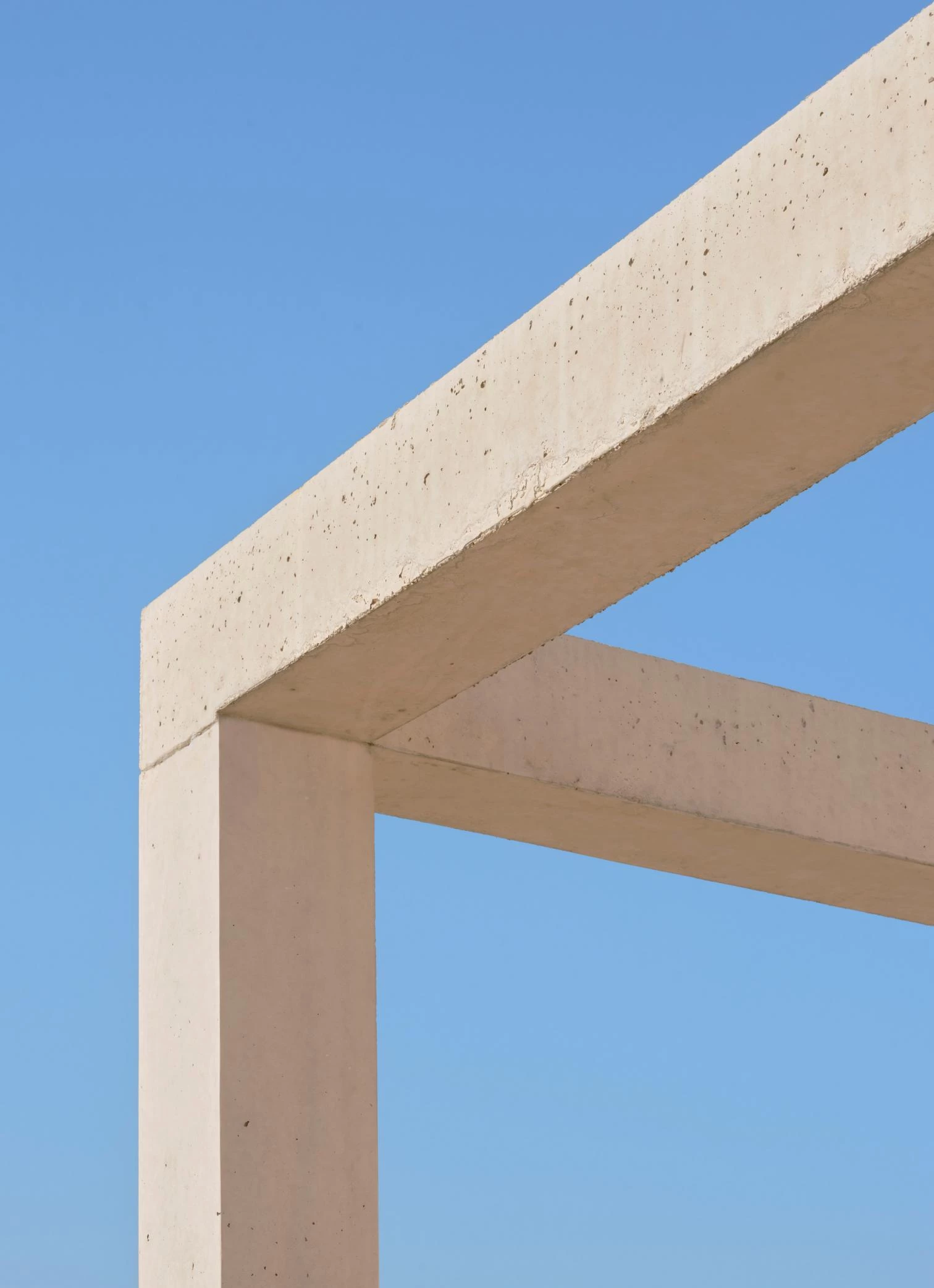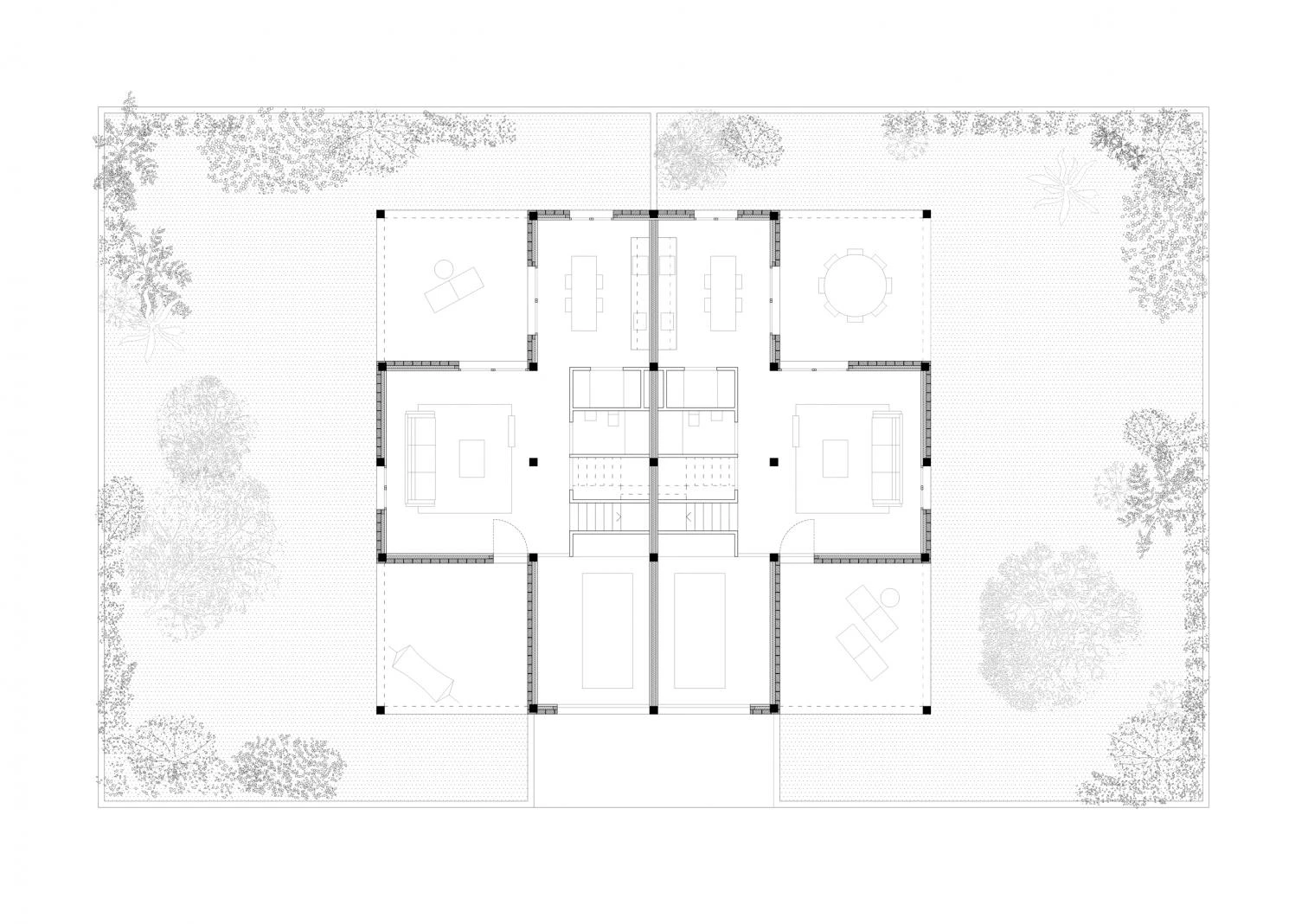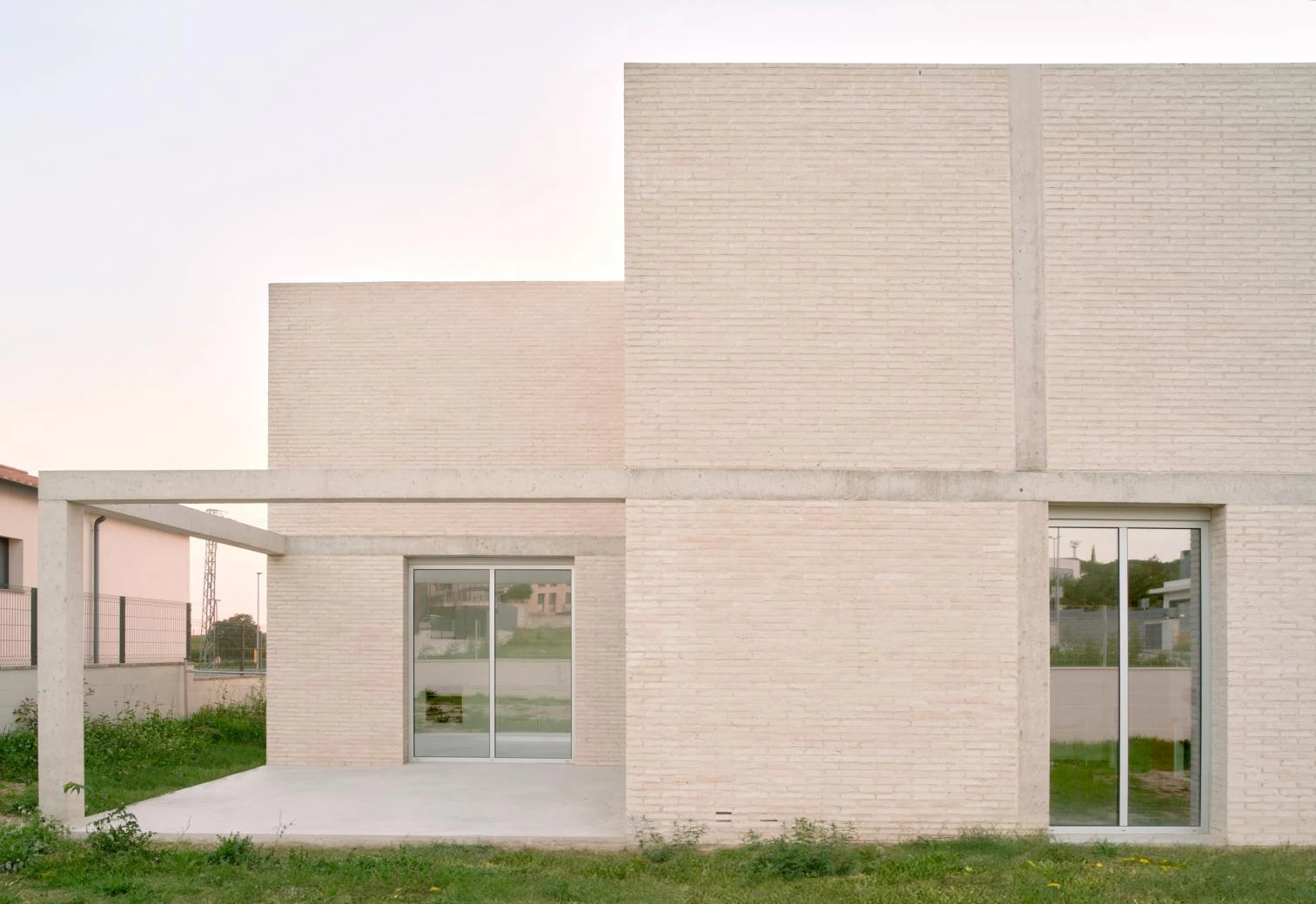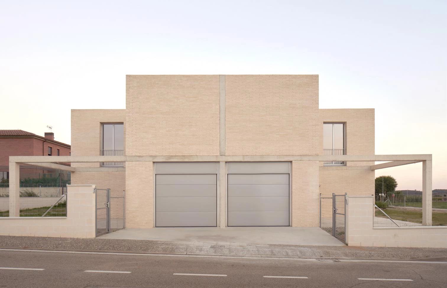 These semi-detached houses are located in a neighborhood on the outskirts of a town near the city of Girona. Each dwelling faces two opposite sides and is joined back-to-back to its partner, in the manner of Janus the two-faced god. The union comes across as a single two-floor volume with a cross shape. The cross is inscribed in a square that encompasses the house and two open-air spaces framed by the exposed structure of concrete.