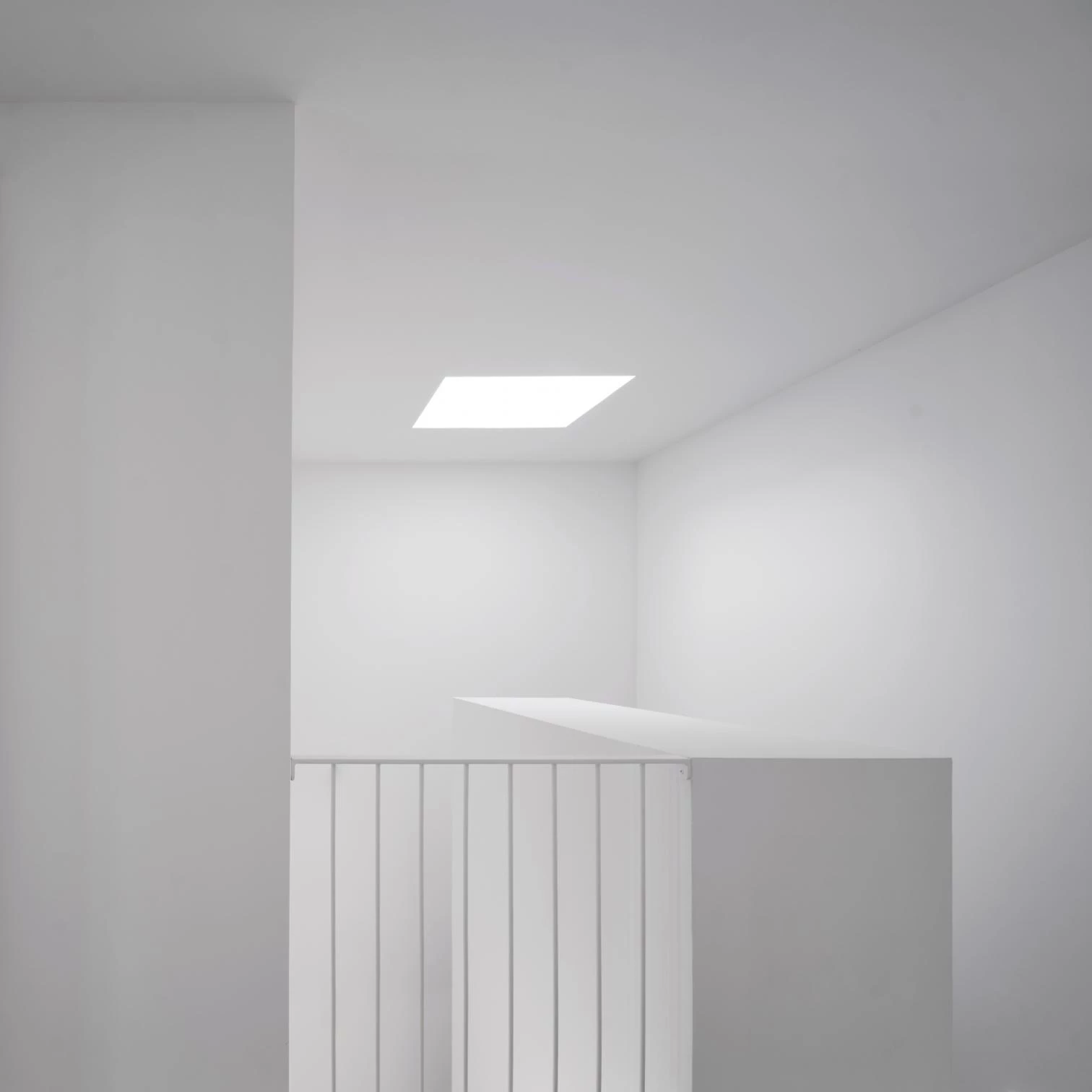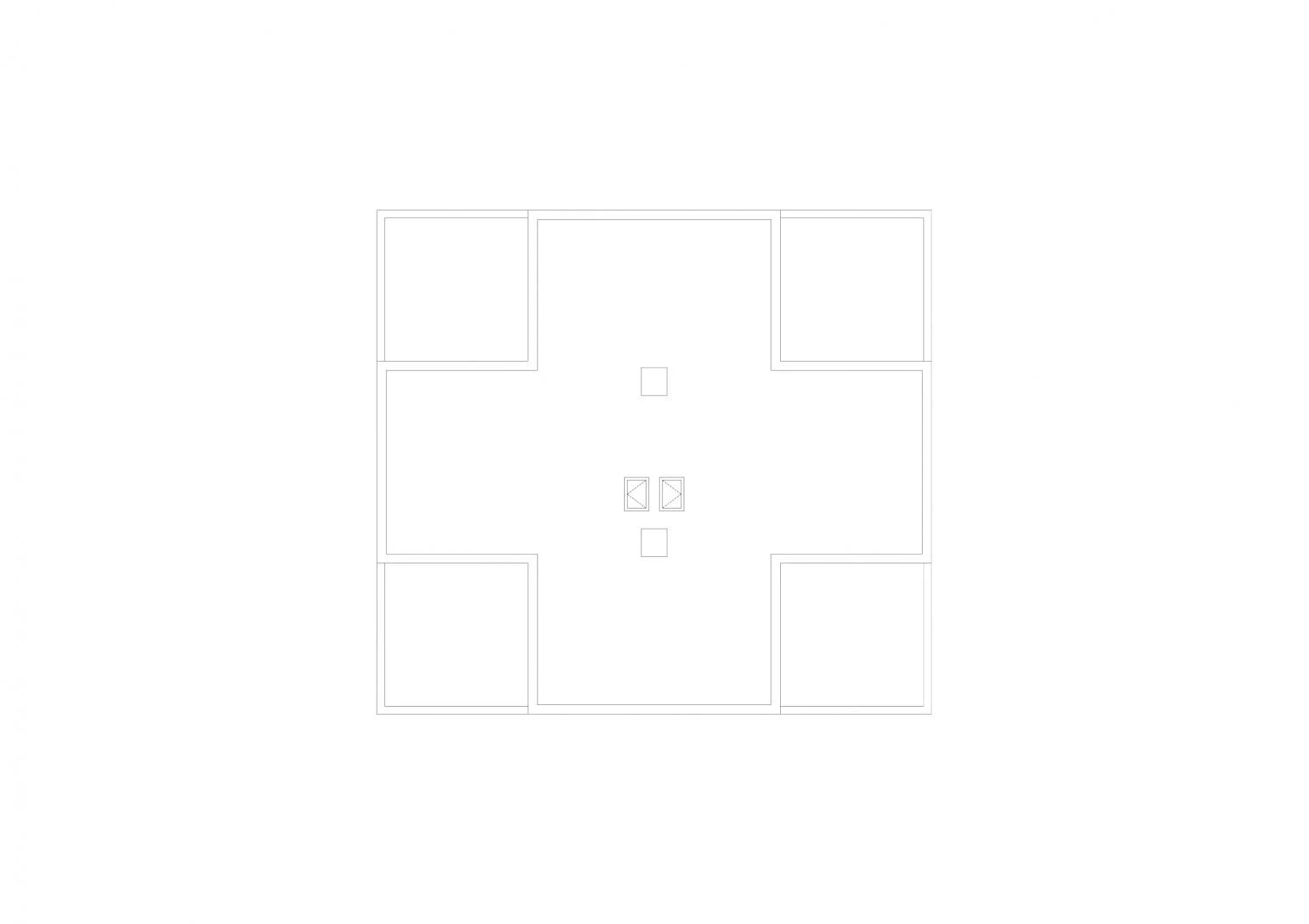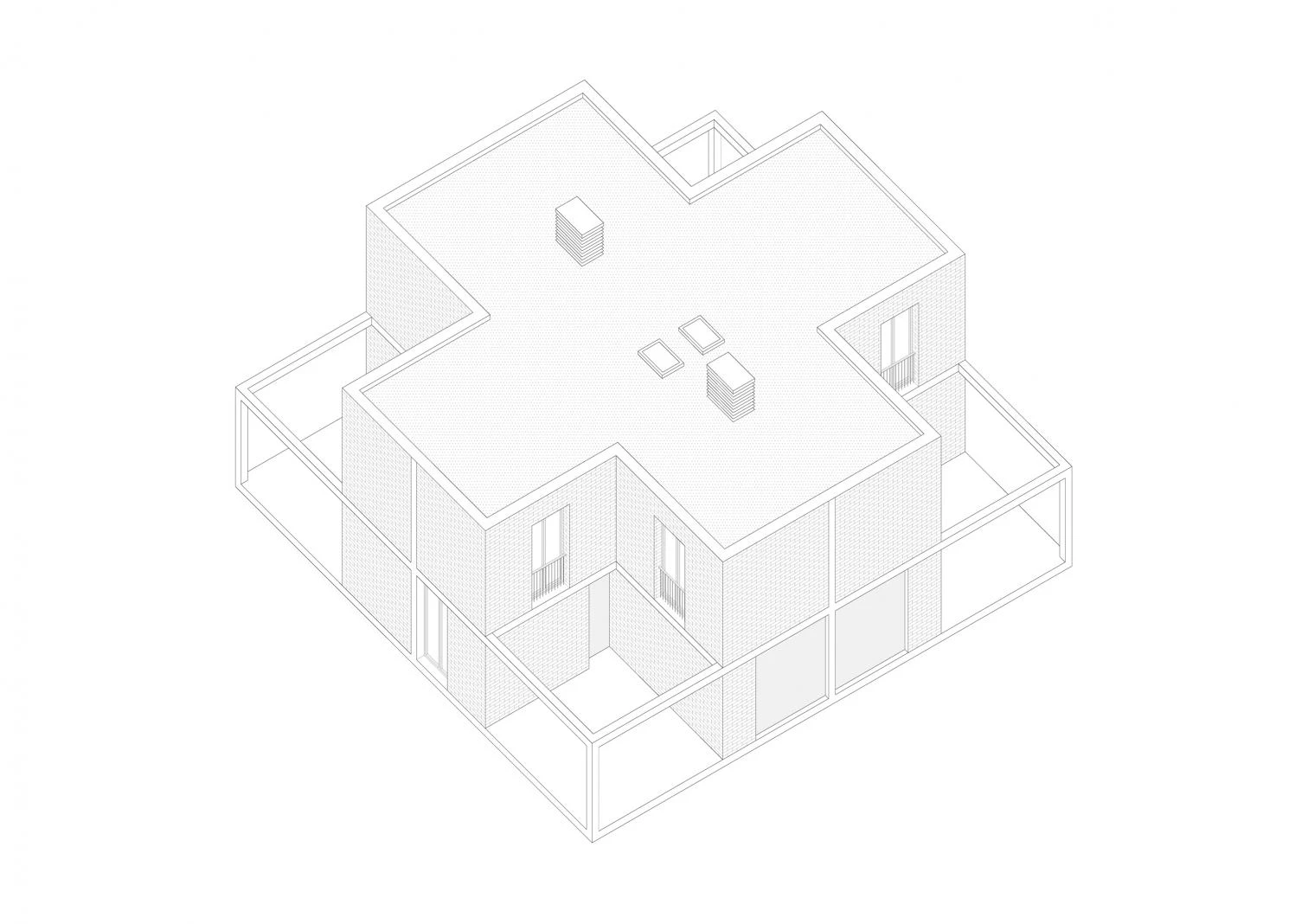 The facades combine a palette of subdued colors with concrete and unfaced bricks, and each side arranges its windows differently. From inside, these openings allow diagonal views across the exterior spaces. The cruciform geometry augments the corners and embraces the future pergolas. Upstairs, it makes for spacious, unhierarchized rooms that permit different uses.