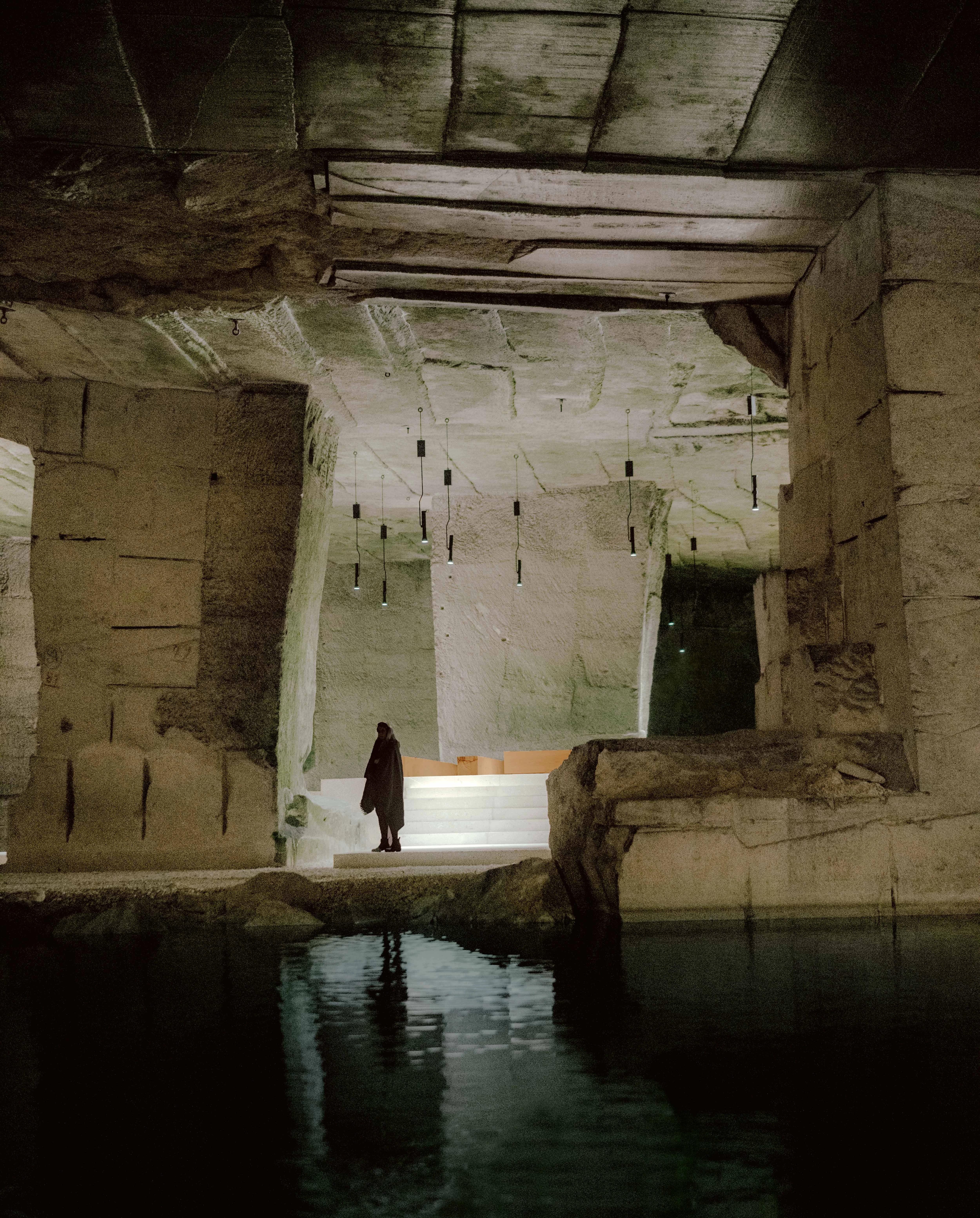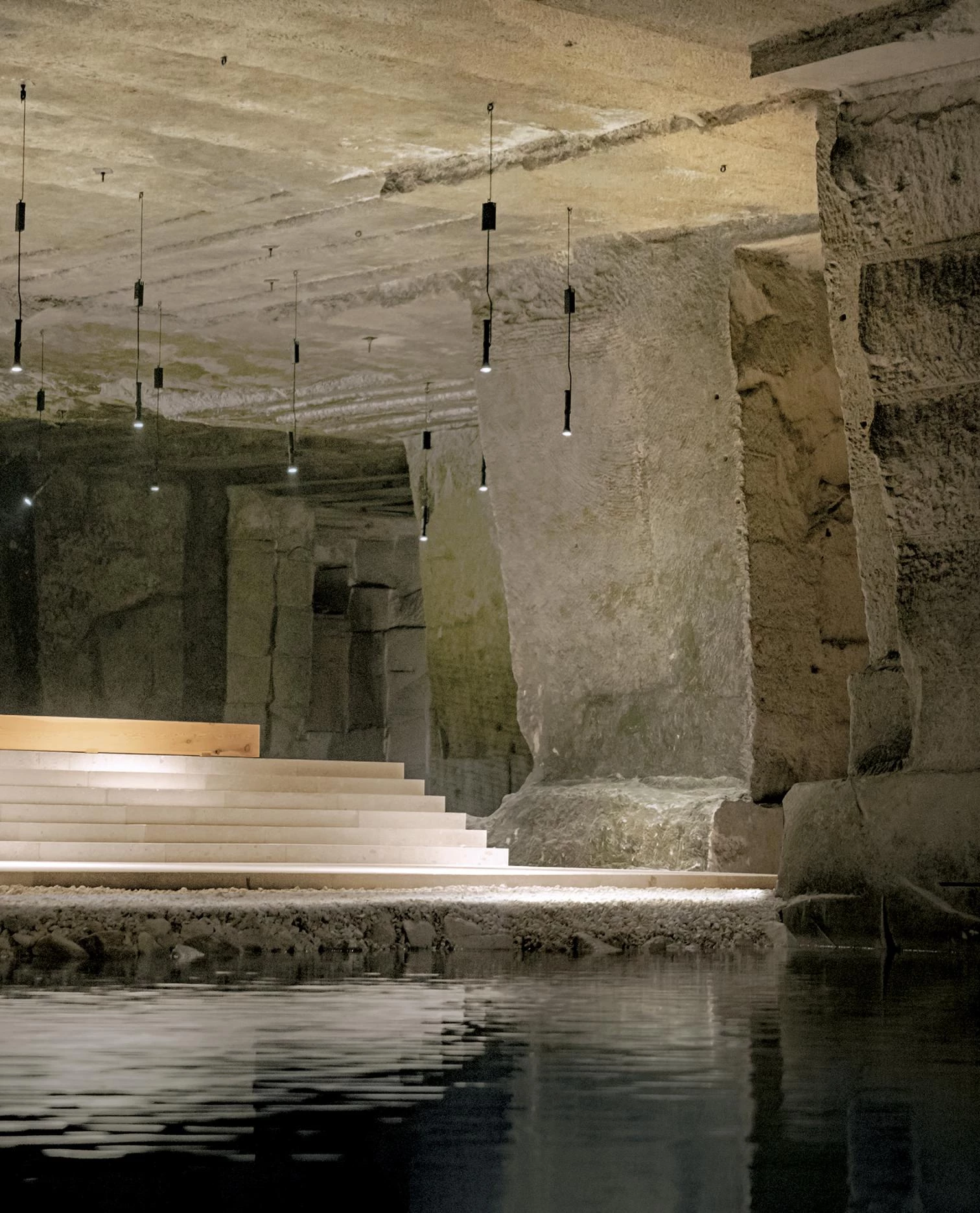 In the morning, sunlight penetrates the openings on the west side of the hill, illuminating the central space of this stone cathedral, but it is at dusk that the sun’s rays penetrate transversally, and thus deeper enough into the cave to be reflected in the water that lies behind the platforms. For the artificial lighting system, discreet fixtures were designed to hang from the ceiling as well as from overhead steel cables recalling those used in mines and quarries of the past.