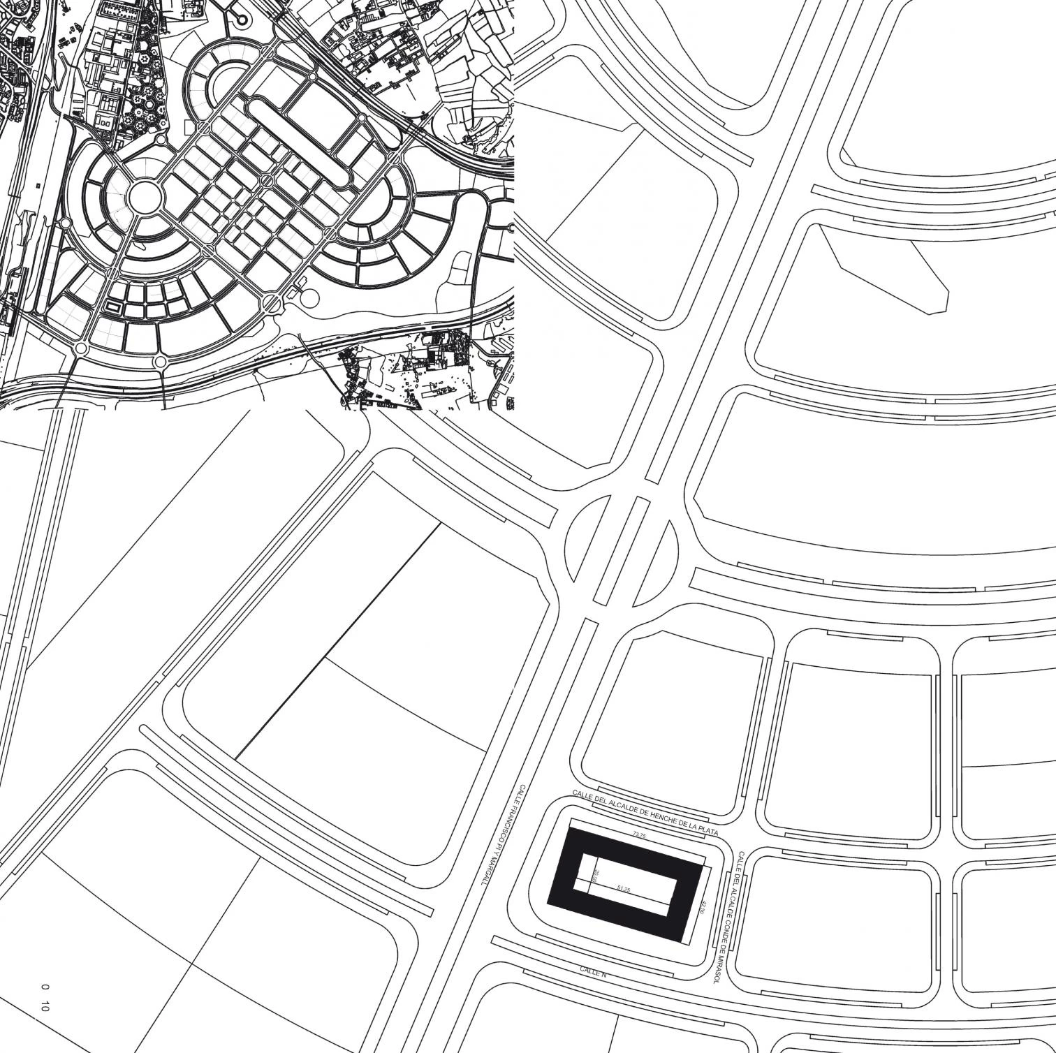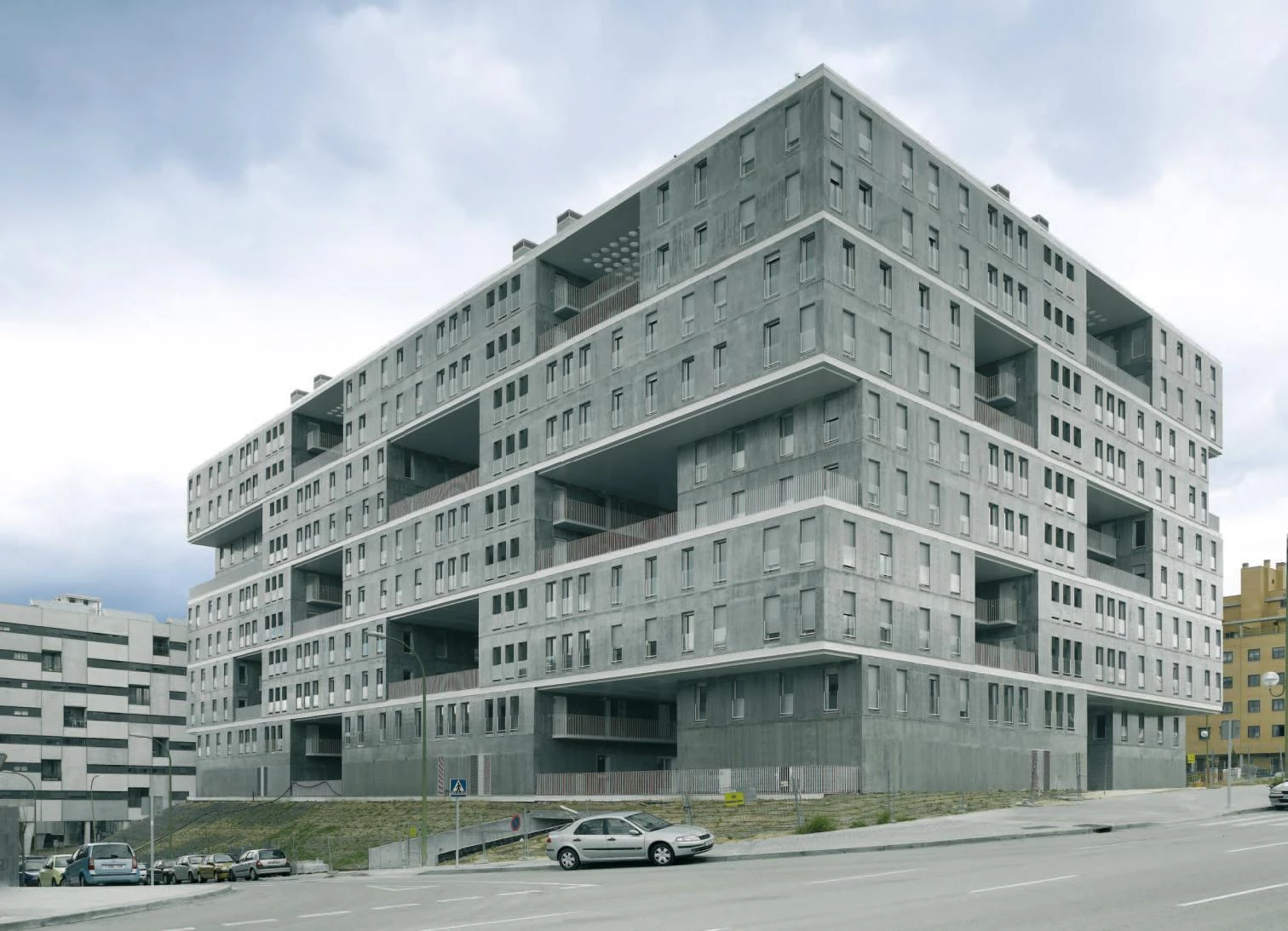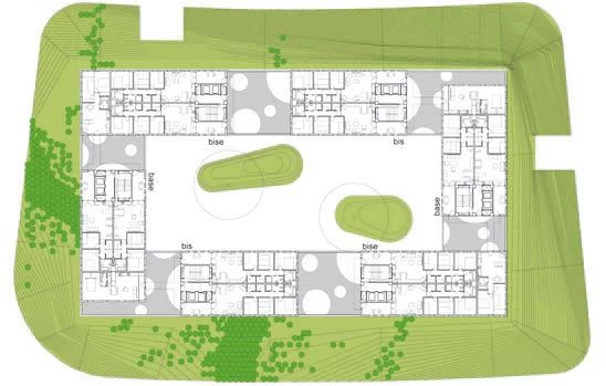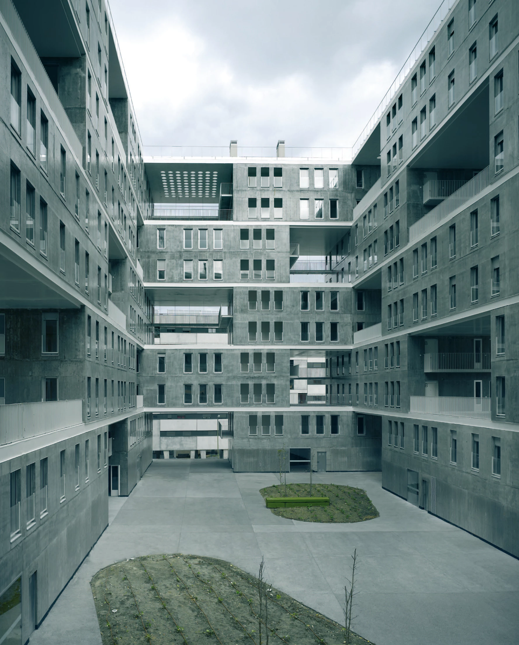 The built volume is slightly set back with respect to the street, generating a narrow strip carpeted with a green slope. The ground floor has twelve shops and six doorways to six stairways. Six arcades link the central courtyard with the street through all the facades, which ensures free-flowing itineraries and contact with city life. The unevenness of the surrounding roads allows placing entrances without ramps to the first and second basement where the garages and lumber rooms are located.
