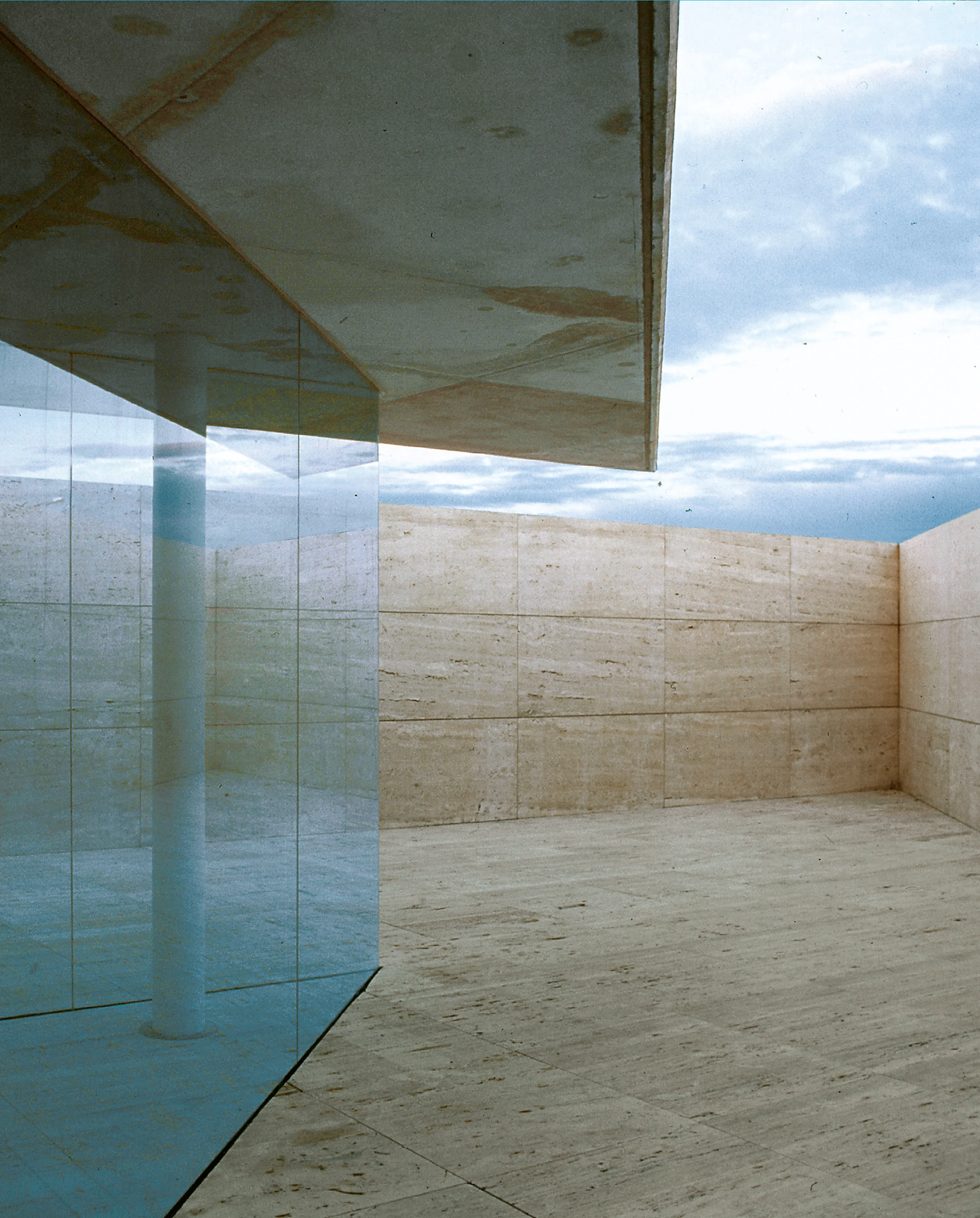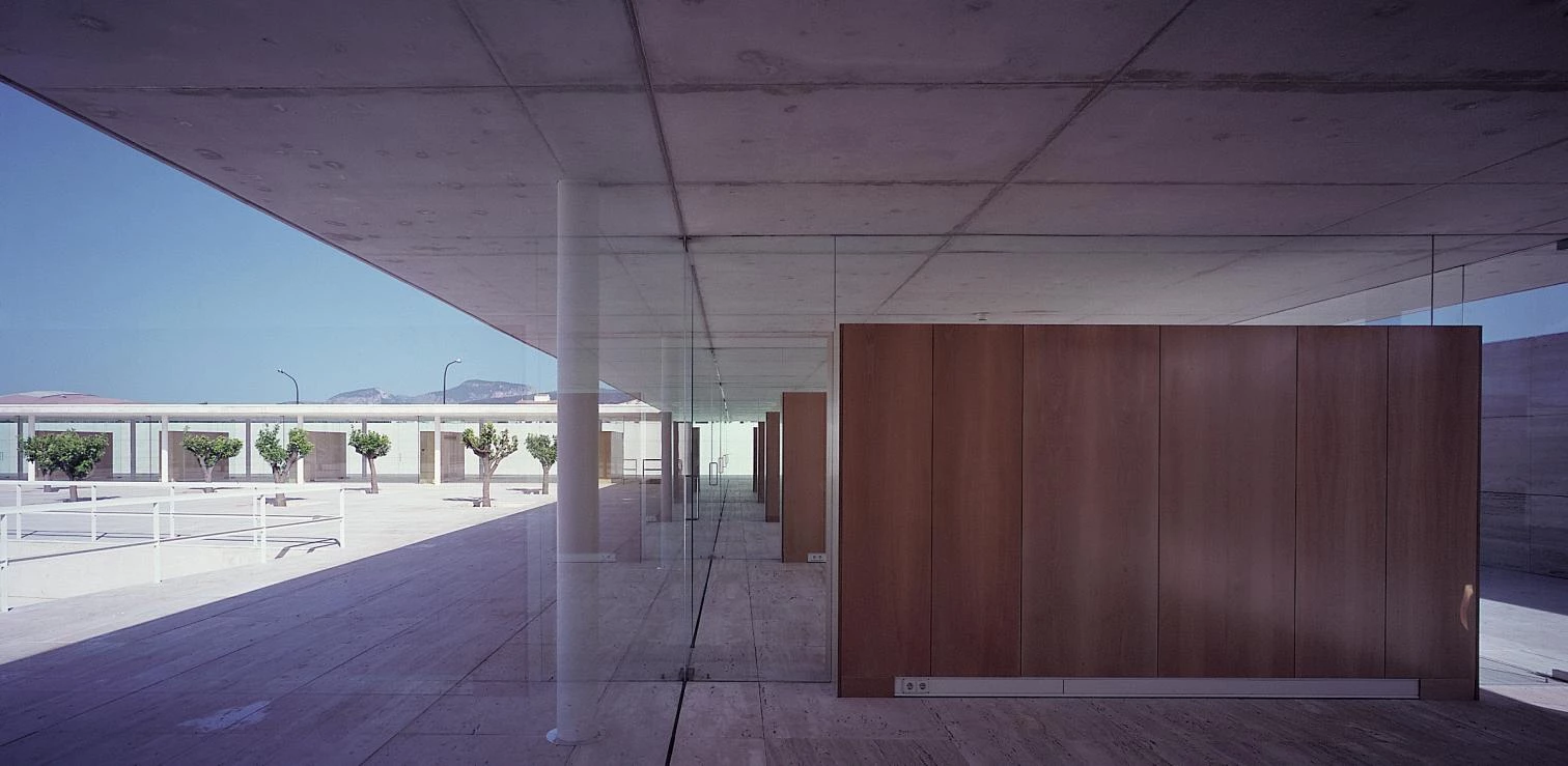 With the premises thus defined, a bay of offices runs parallel to each of the borders, leaving a free strip close to the low wall. The work areas around the courtyard receive direct sunlight; those along the edges of the parcel get reflected light. The exterior opacity is forgotten altogether as the travertine box opens its heart to the sky. Everything is arranged in a 6 x 6 meter grid, including the orange trees of the courtyard. White-painted cylindrical pillars are the nodes of this grid, and hold up a continuous flat slab that stretches on outward to protect the interior from excessive sunning. Frameless glazing and uninterrupted travertine flooring merge the offices with the garden. Indoors, transversal partitions of beechwood are conceived as furniture pieces. Detached from the ceiling and walls, they serve as storage niches besides concentrating all electrical and air conditioning equipment.