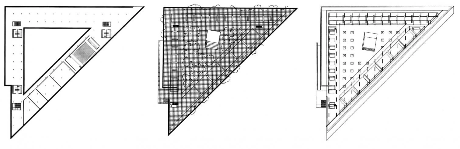 A corridor of offices runs round the triangular border of the site to create a travertine-paved garden with orange trees.