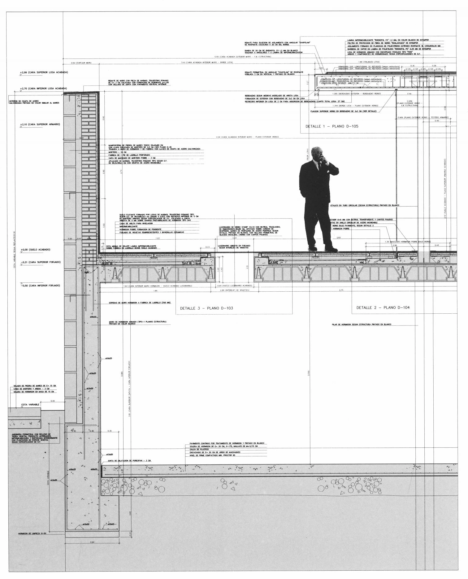 The basement takes up the entire breadth of the parcel. The homogeneity of the slab that covers it is broken only by the sunken meeting room that appears amid the trees, like an open-air agora. The twist of the tiers here are a counterpoint to the regular matrix that governs the complex. Storage rooms, depositories and files are assigned underground, toplit by glazed perforations integrated into the paving of the courtyard. Jasmines, wisteria and bougainvillea are planted in a box that surrounds the fence. With the sensuality afforded by this vegetation, the austerity of the geometric and constructive approach acquires the Mediterranean complexion perhaps desired by Mies van der Rohe, whose figure graces the sections of the project.