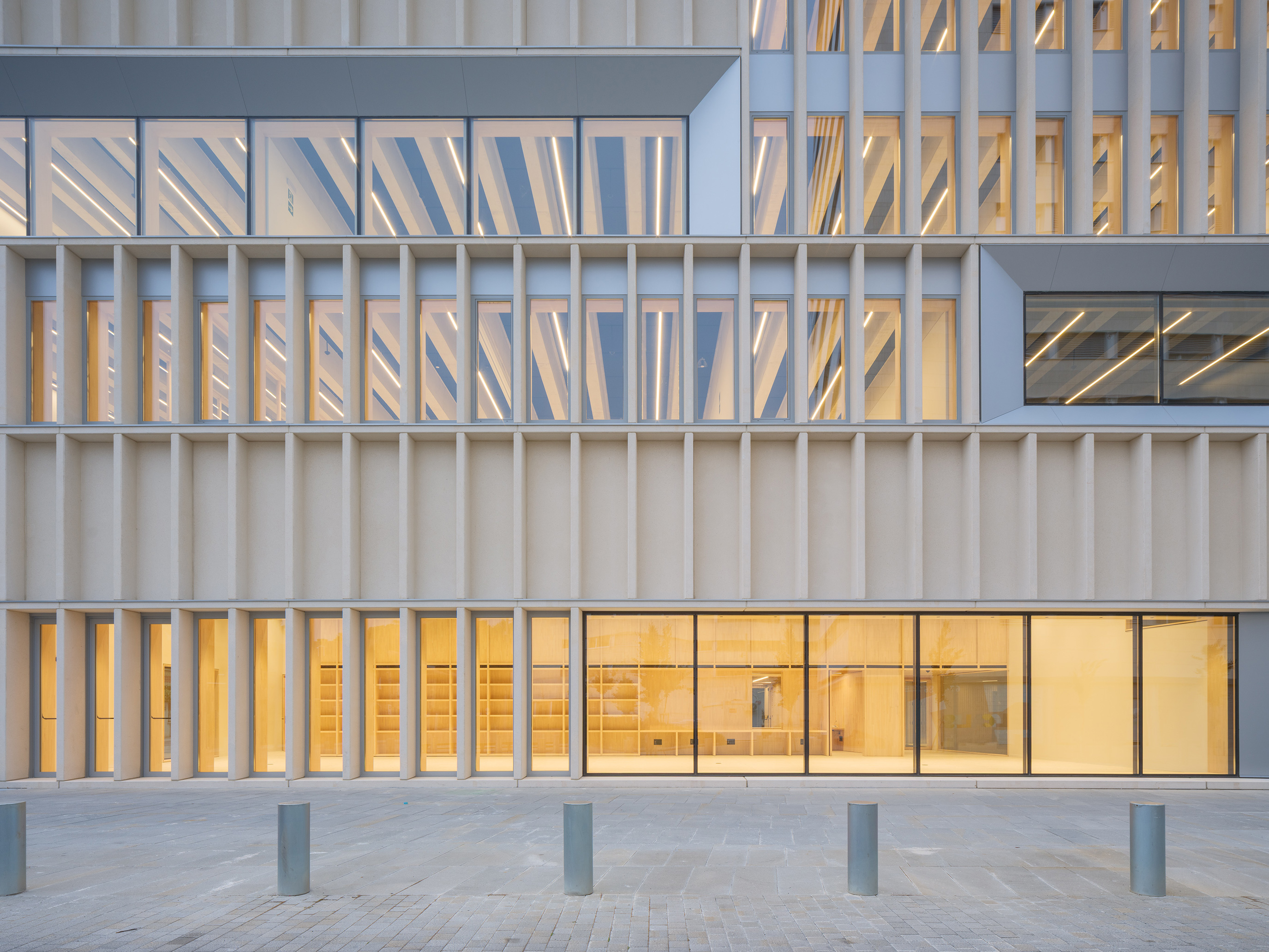 The buildings blend with their urban surroundings, dominated by towers, through carefully selected materials and proportions. The prefabricated concrete of the facade, with predominantly vertical elements and a tone that evokes the stone of nearby constructions, establishes a coherent visual dialogue with the context.