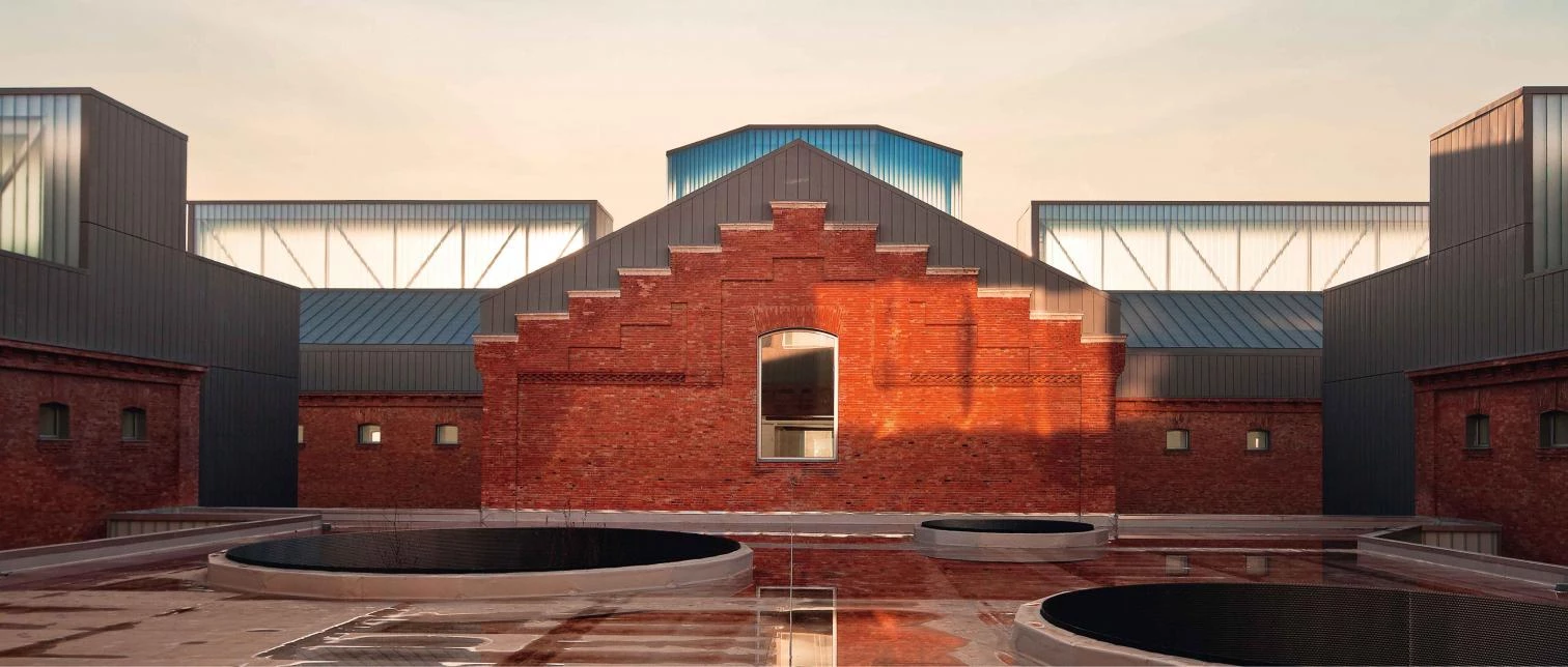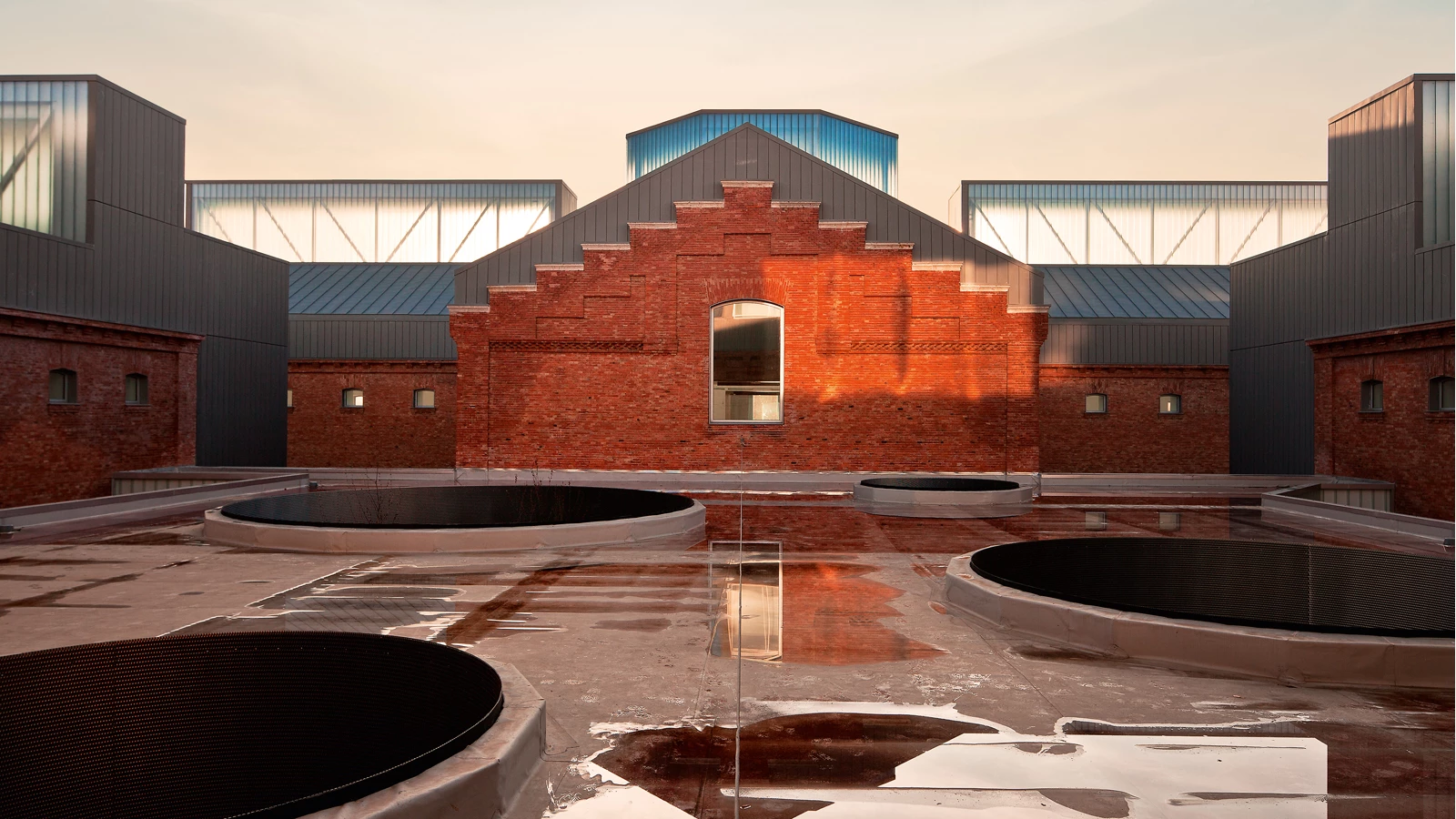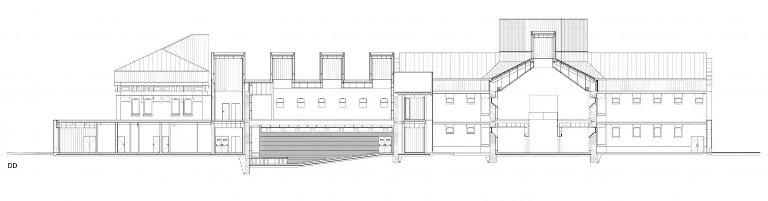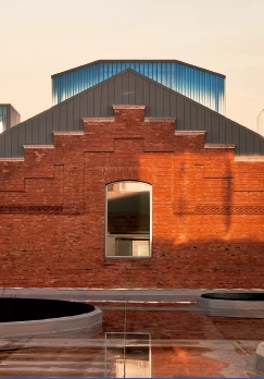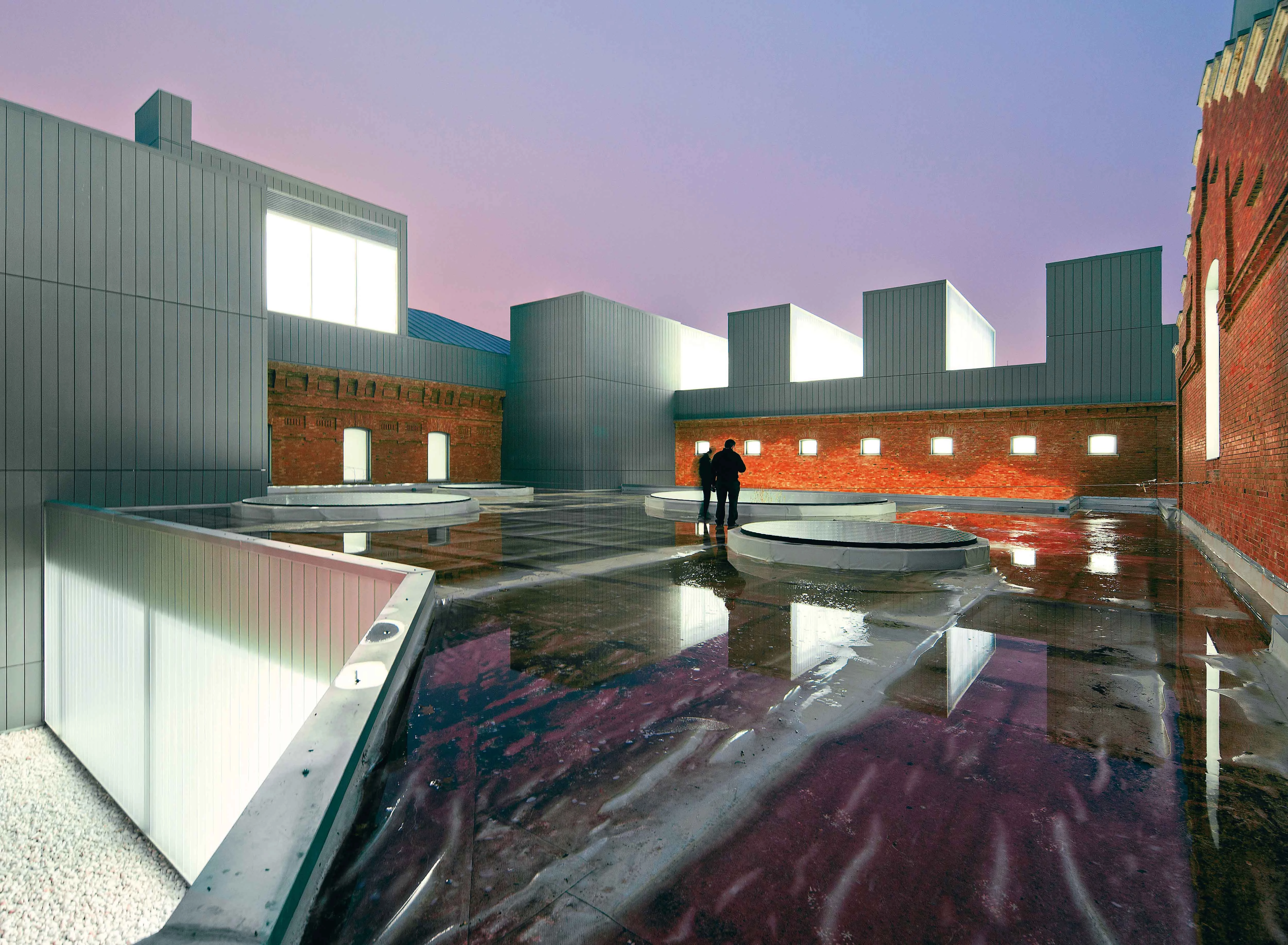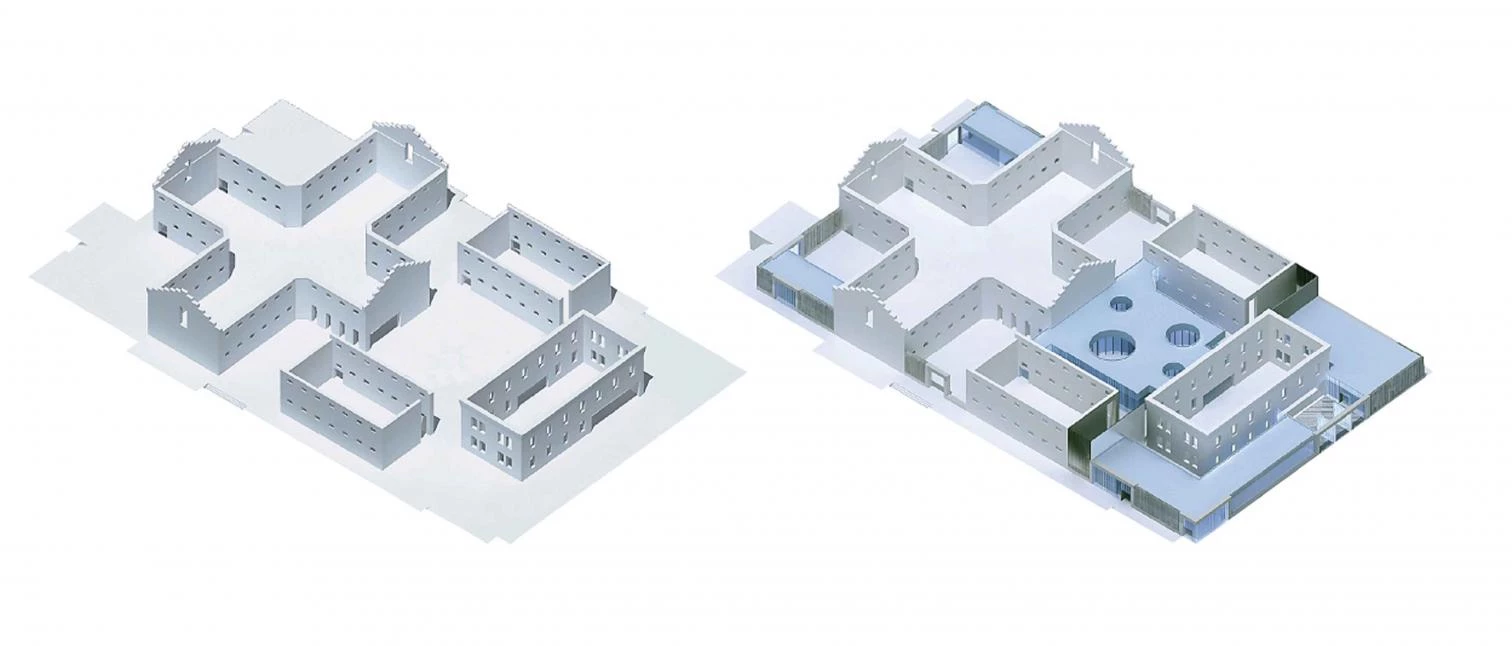 Once several of the smaller pavilions were demolished, the remaining ones were emptied and the existing brickwork restored. Next came building new pieces to fill the compound and finishing the zinc roofs.