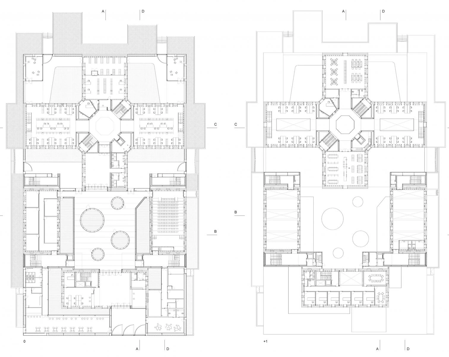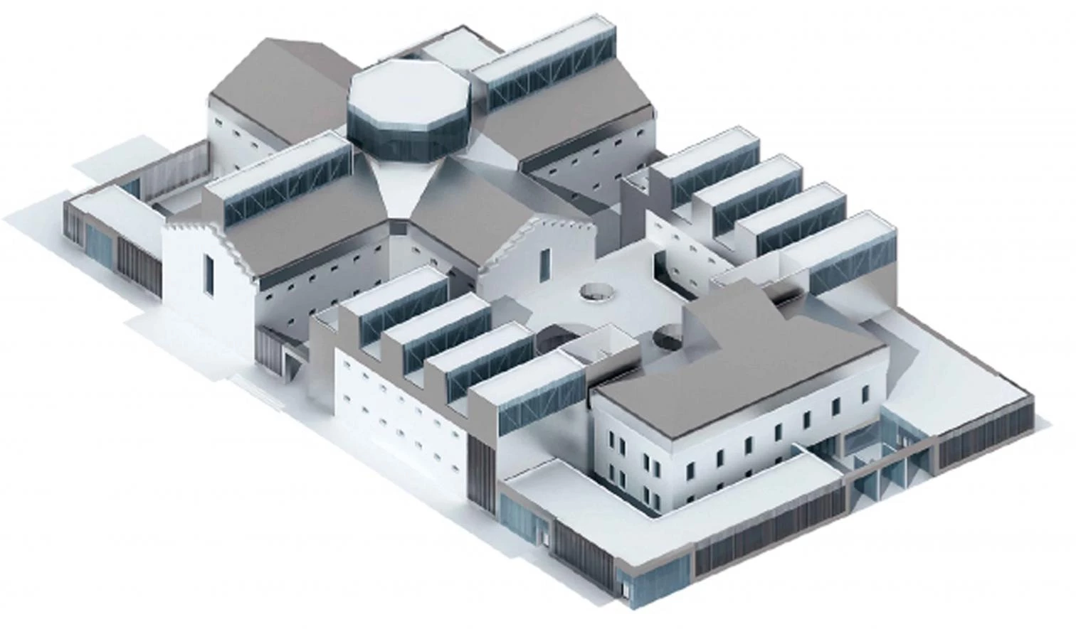 The new zinc roof surfaces, torn by running skylights, strike an intense contrast with the masonry walls and give the building a contemporary look. The refurbishment project involved not only the existing building, but also the spaces left amid the pavilions, which have been filled with new structures that provide the complex with an auditorium, multipurpose rooms and a library located in the central space of the old prison, beneath an octagonal skylight. The whole compound is organized around a central lobby that receives light through round courtyards.