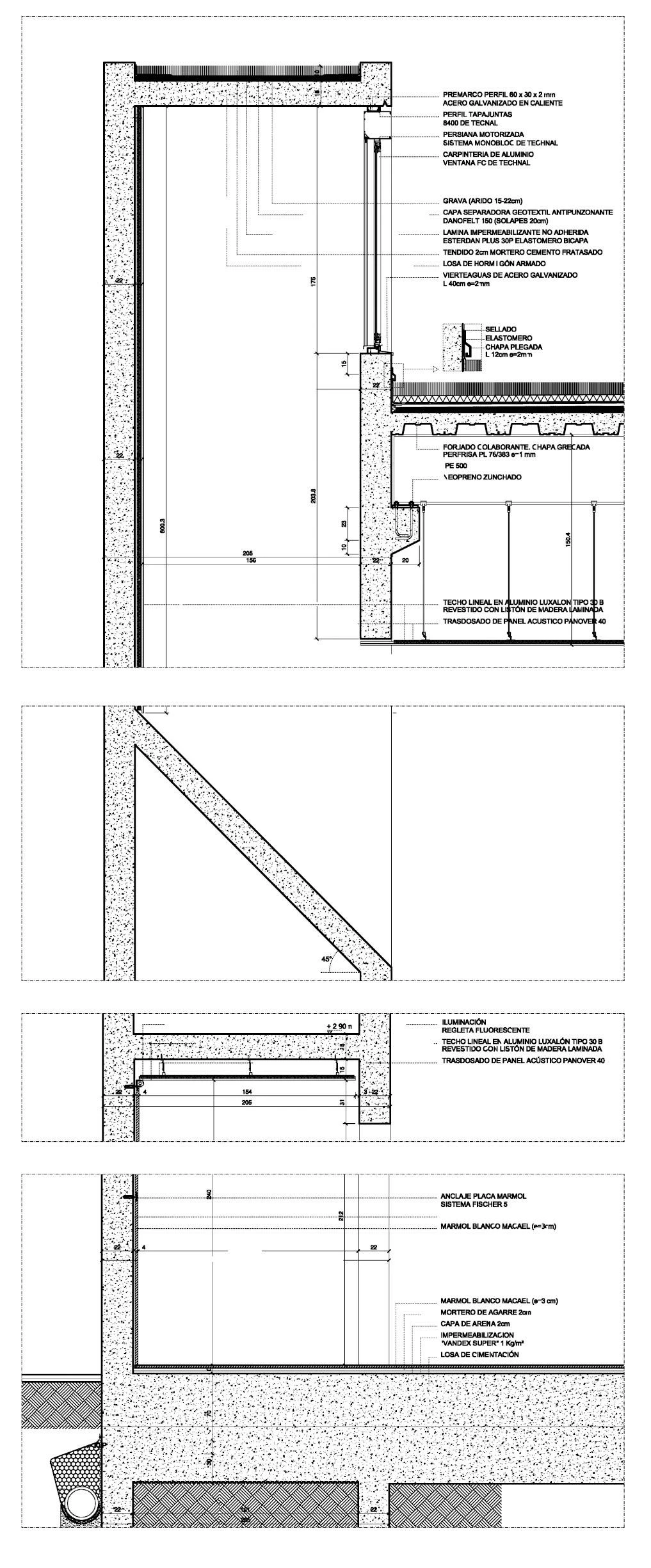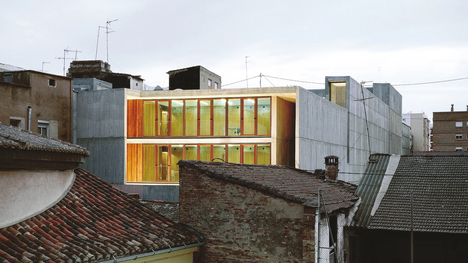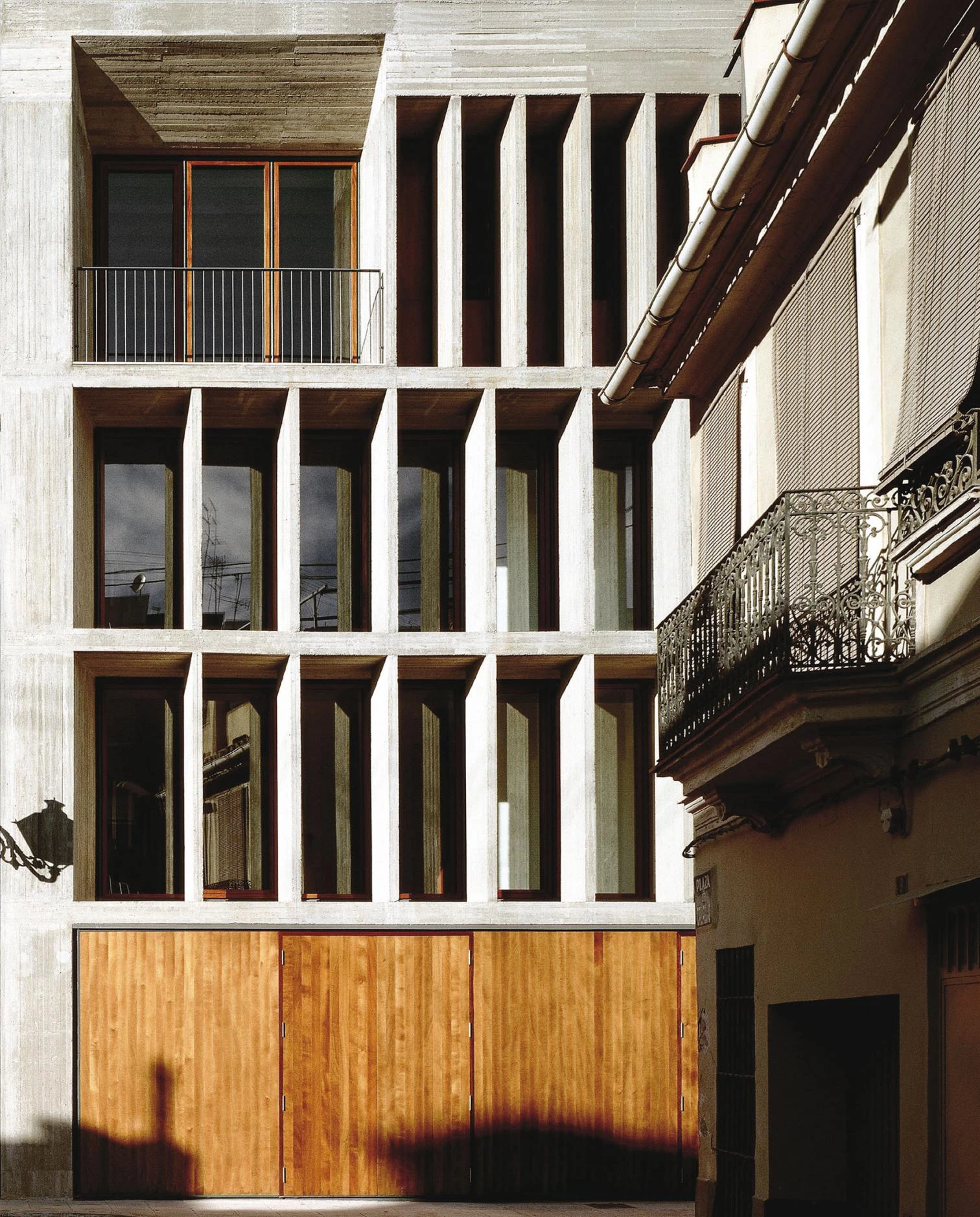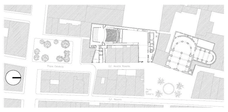 The program included the construction of an auditorium for four hundred people, a civic center and a service area in a plot whose perimeter is practically defined by party walls. The only two ends from which the volume looks on to the street have served to place the main entrance – which leads both to the halls and to the building’s facilities – and the service areas, while the main hall has been placed at the back of the plot. The double wall motif constitutes the center of the project: aside from housing the vertical circulation systems, it lets natural light into the most intricate places, including the auditorium. The encounter of these walls and the interior voids is what triggers spacial tension. The foyer also has a skylight that sends light in through a veil of thin wood strips. For its part, the design of the auditorium pursues the best acoustics: a rectangular layout – double square in its width-length relationship –, flat roofs and a height that ensures a volume of ten cubic meters per spectator. The cladding is made of wood: beech for the paving and laminated wood on the ceiling.