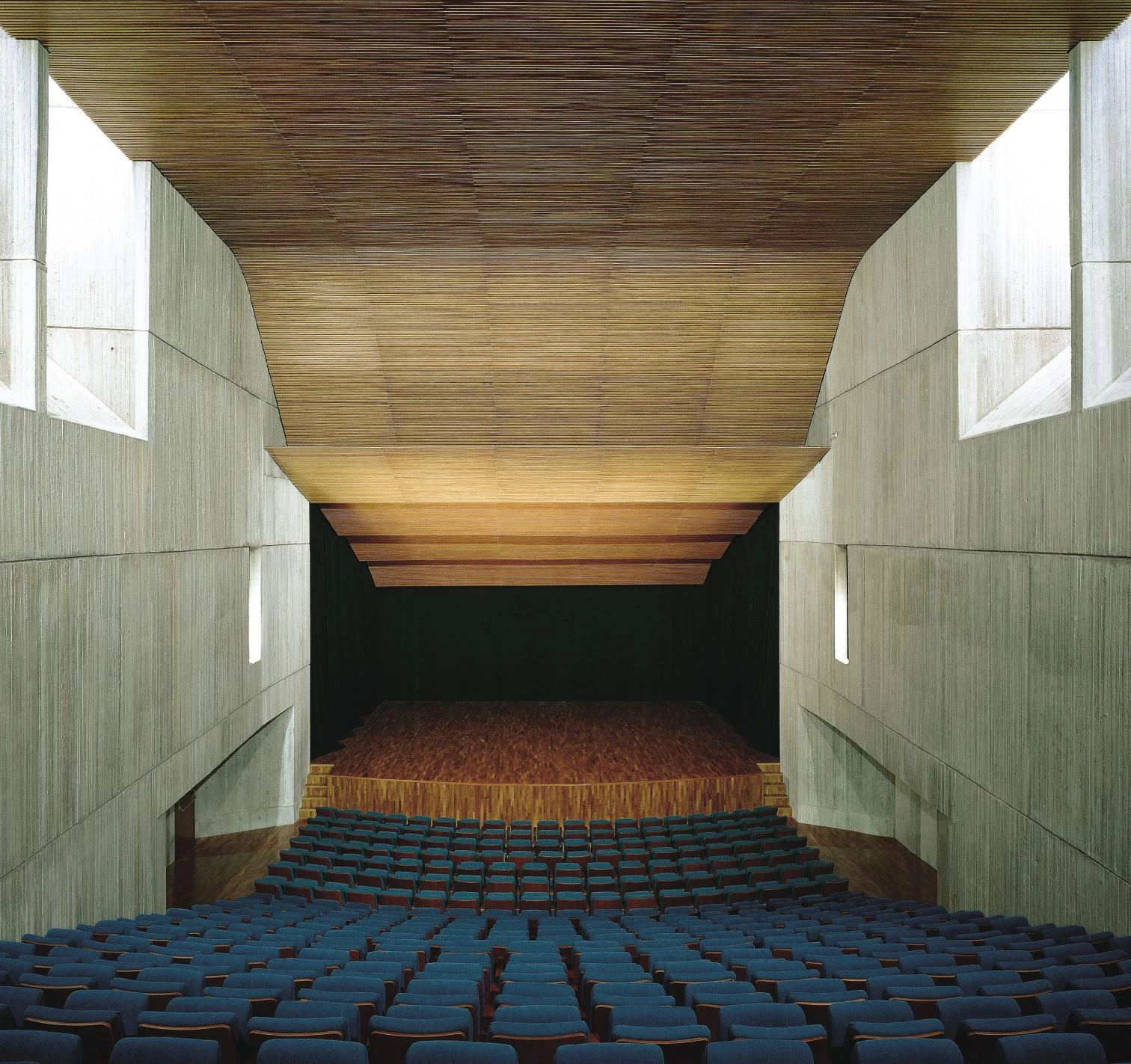 Thanks to the double walls it is possible even for the auditorium – with four hundred seats, all arranged frontally – to enjoy natural illumination. Materials such as wood and concrete are combined in its interior.