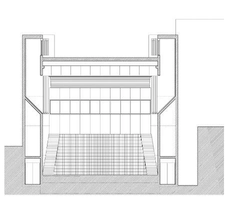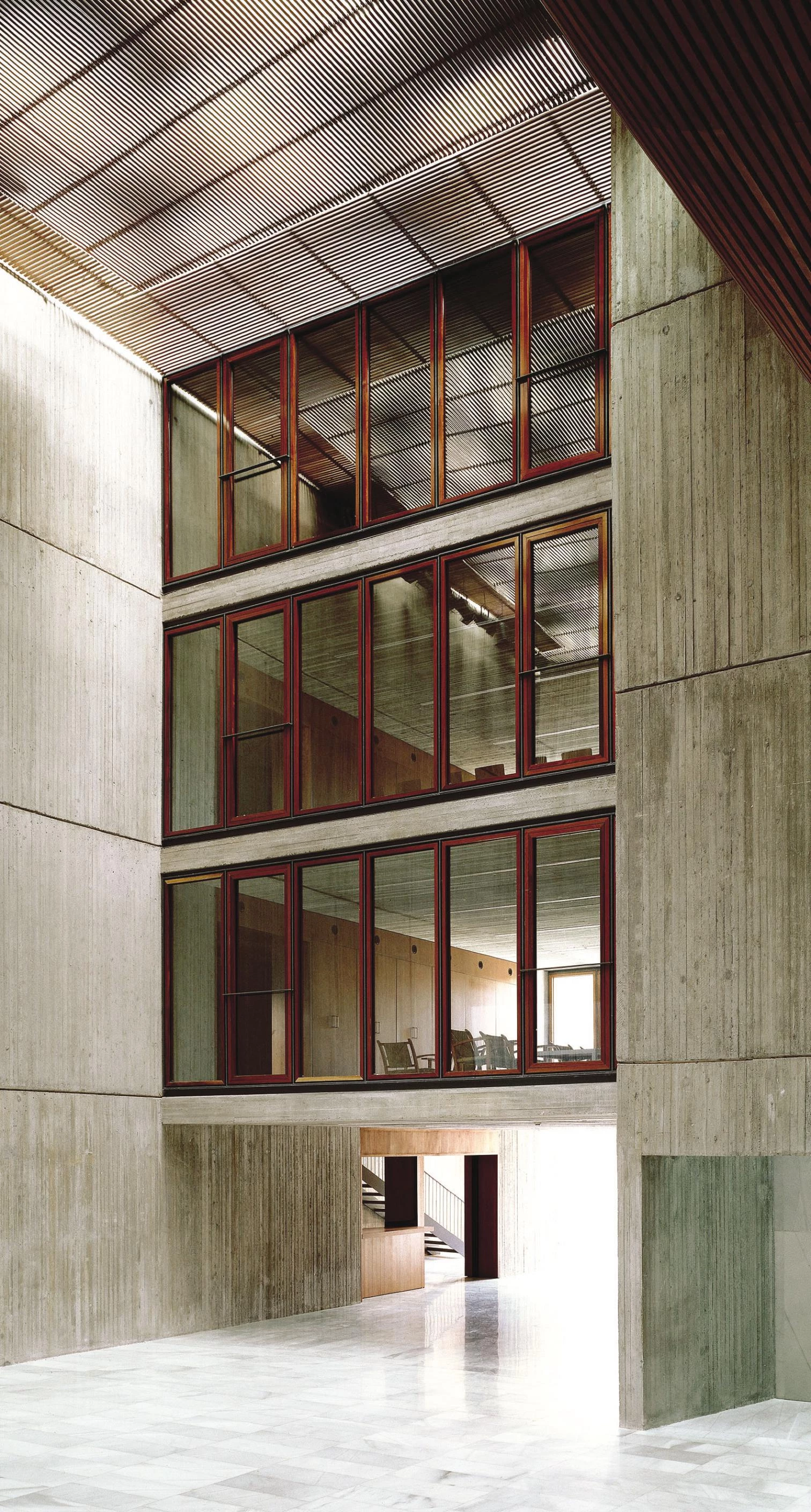 Three trays cross the foyer compressing the space at the entrance and housing the living (level 1) and conference areas (levels 2 and 3) of the civic center. Large windows transfer activity to this central lobby.