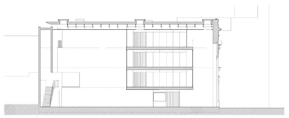 Over Rosario square, the facade of the old Ateneo has been maintained. The facade style, inspired by a classical model of triumphal arch, has been accentuated with a 3 x 10 meter sliding wooden door that takes up the full size of the central arch. The character of the neighborhood, represented by the lively sequence of small plazas, is further enhanced by the preservation of this element and by the program of the center.