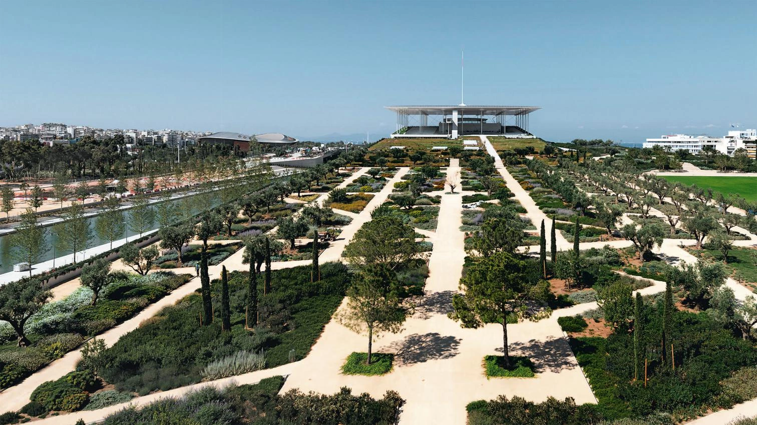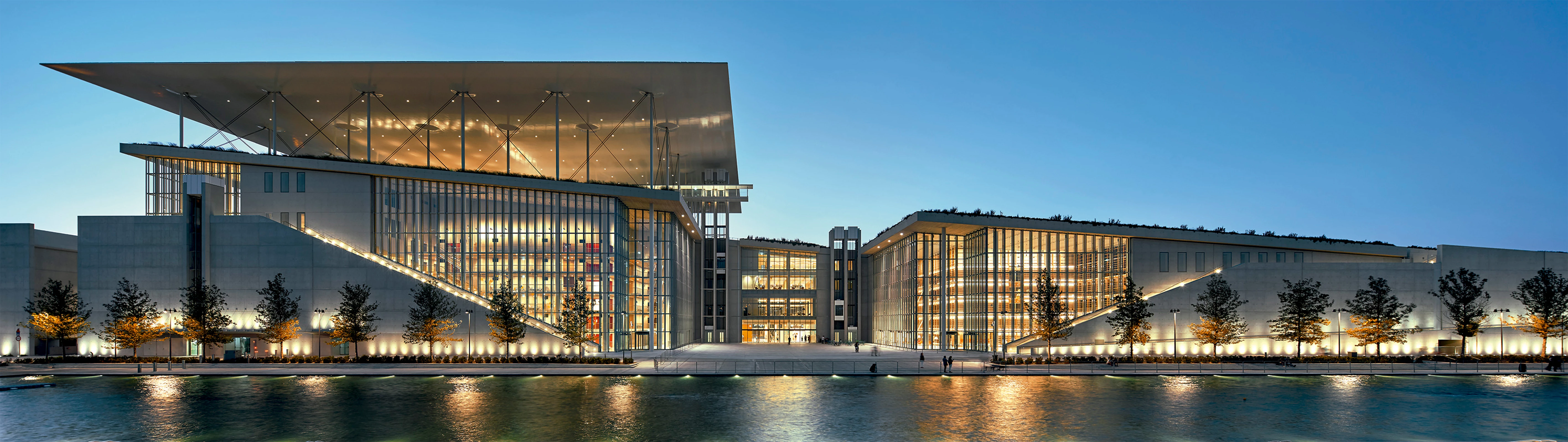 The entirely glass-walled library reading room sits on top of the building just underneath the large roof. A square horizontal transparent box, it enjoys 360-degree views of Athens and the sea. The site’s visual and physical connection with water continues in the park with a new canal that runs along a north-south, main pedestrian axis, the Esplanade.