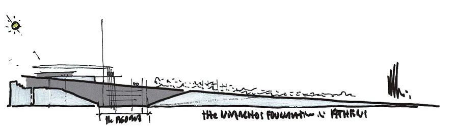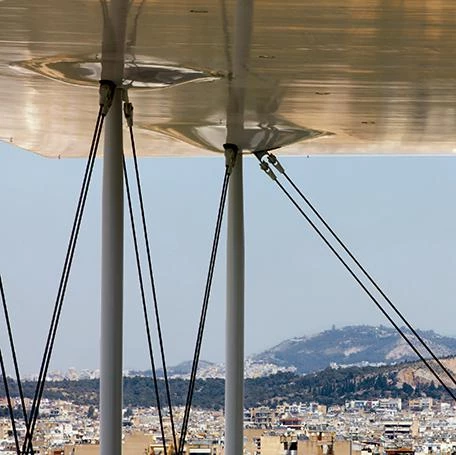 The reference to the temple is reinforced by a plinth conceived as a kind of crepidoma that raises it off the ground, as well as by the curtain of slender pillars that surrounds the building, and the immense flat roof hovering over the two volumes comprising the complex – one to house the National Library of Greece, and the other the Greek National Opera –, with an open space, the so called Agora, in between, providing access and connections between the two main facilities.