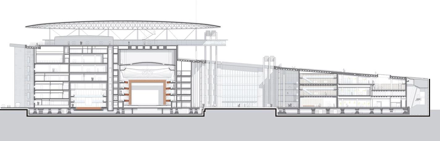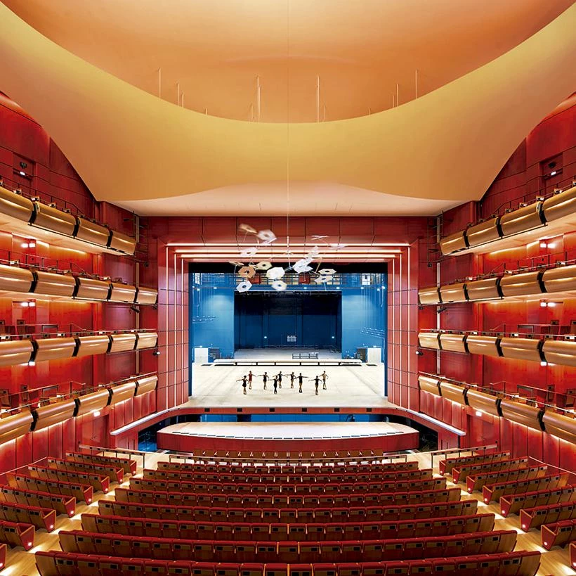 The opera house has two auditoriums, seating 450 and 1,400. The larger one imitates the arrangement of Italian-style theaters, with four tiers of boxes, a horseshoe orchestra, a proscenium arch, and behind this, an enormous stage box formed, vertically, of an orchestra pit, a basement storage, and the upper part of the flytower, and horizontally, of the stage, the rectangular area behind it, and two spacious wings allowing accumulation and quick changing of sets.