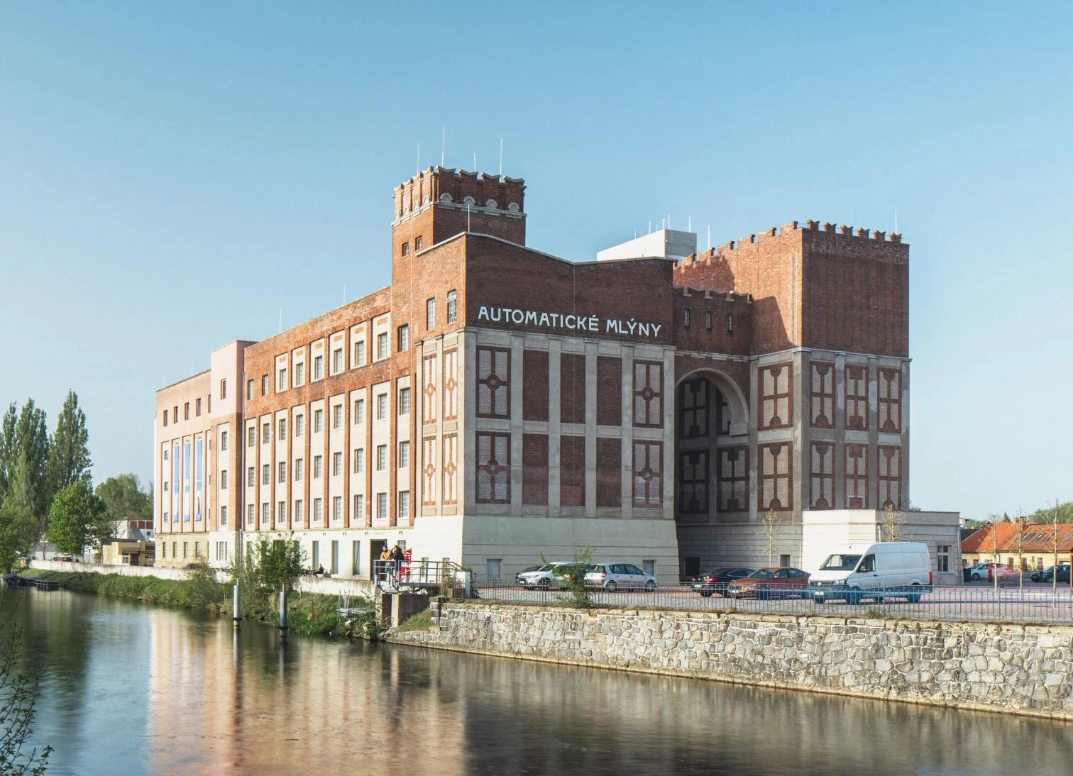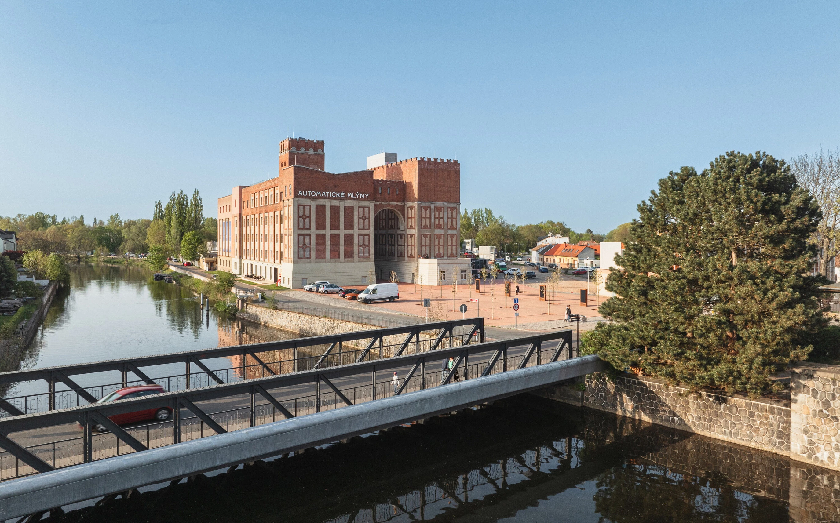 Standing on the banks of the Chrudimka River, the Automatic Mills of the city of Pardubice, a work of the Czech architect Josef Gočár, were built in 1909. A grain silo was added in 1924. The mills ran uninterruptedly for over a century, until 2013, and a year later the industrial complex was put on the Czech Republic’s list of national cultural monuments. Since 2016 it has undergone transformation into a cultural center. The renovated premises comprise several buildings and institutions: the regional Gočár Gallery, the city gallery for contemporary art GAMPA, the Sféra central workshops for schools,, the Pardubice Infocenter, and the Silo.