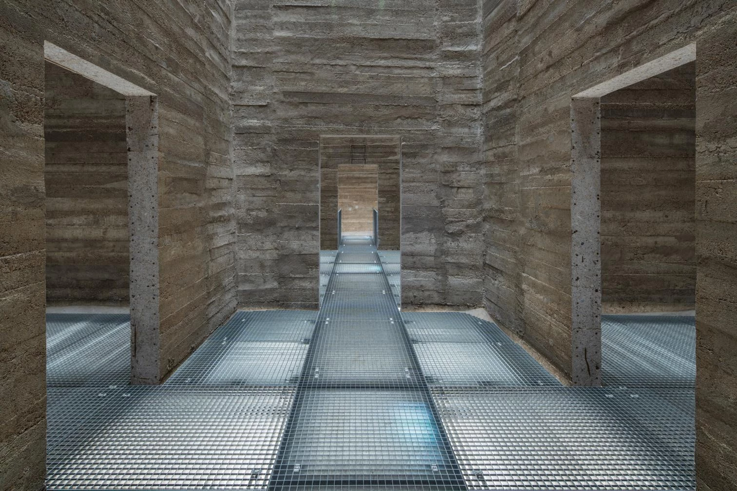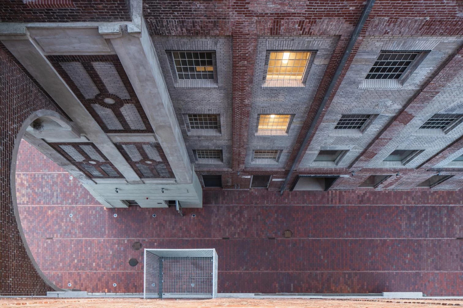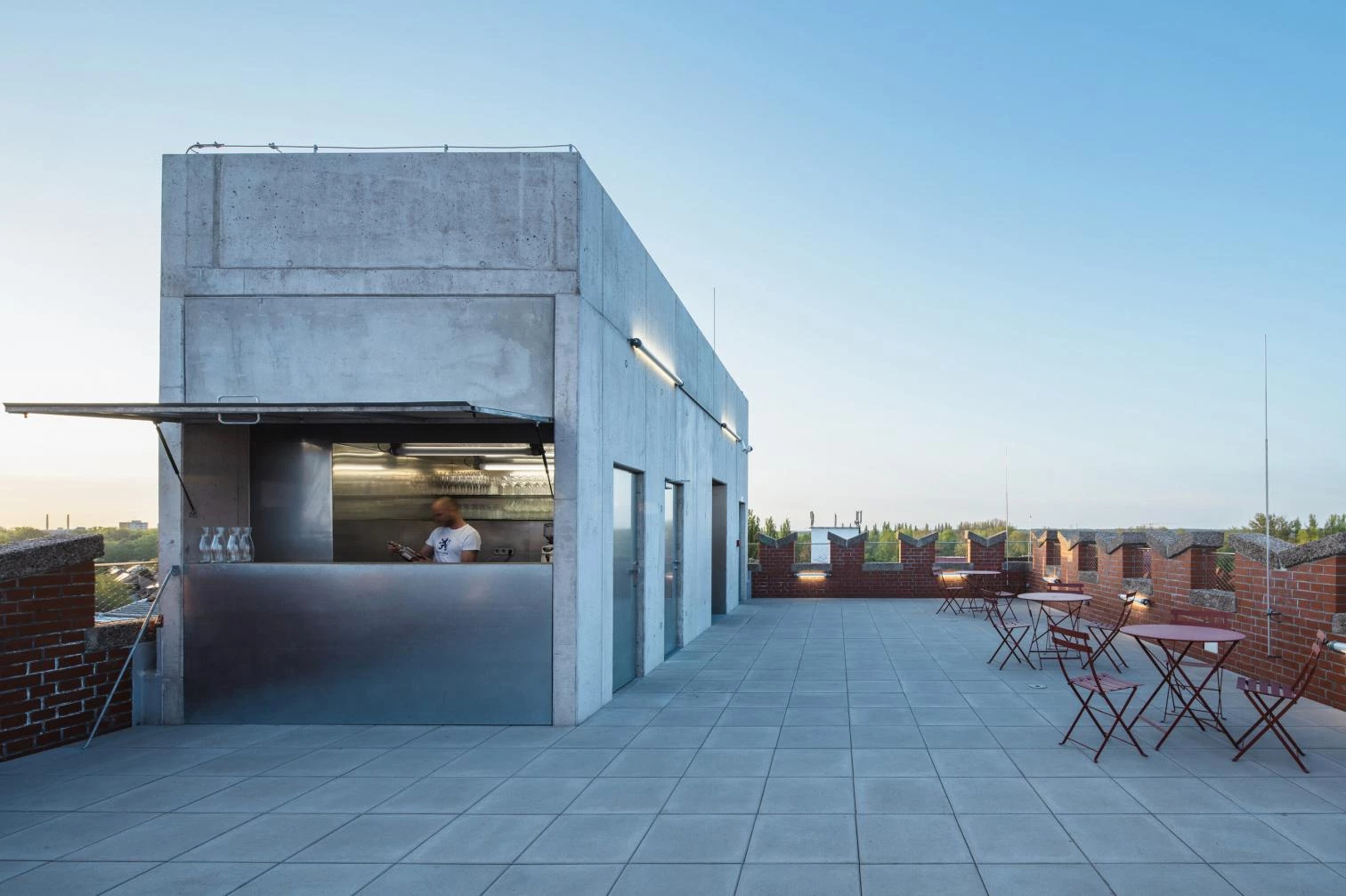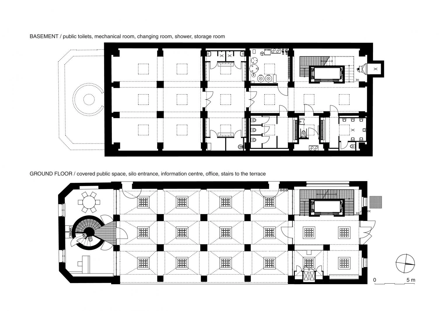 The Prokš Přikryl architekti was commissioned for the recent conversion of the Silo to include a multipurpose hall for events like theater performances, conferences, and concerts, and also exhibition galleries and a rooftop bar with views of the city. The ground floor was transformed into an indoor public space. There had in the past been an opening in the brick plinth here, and it is now back in place.