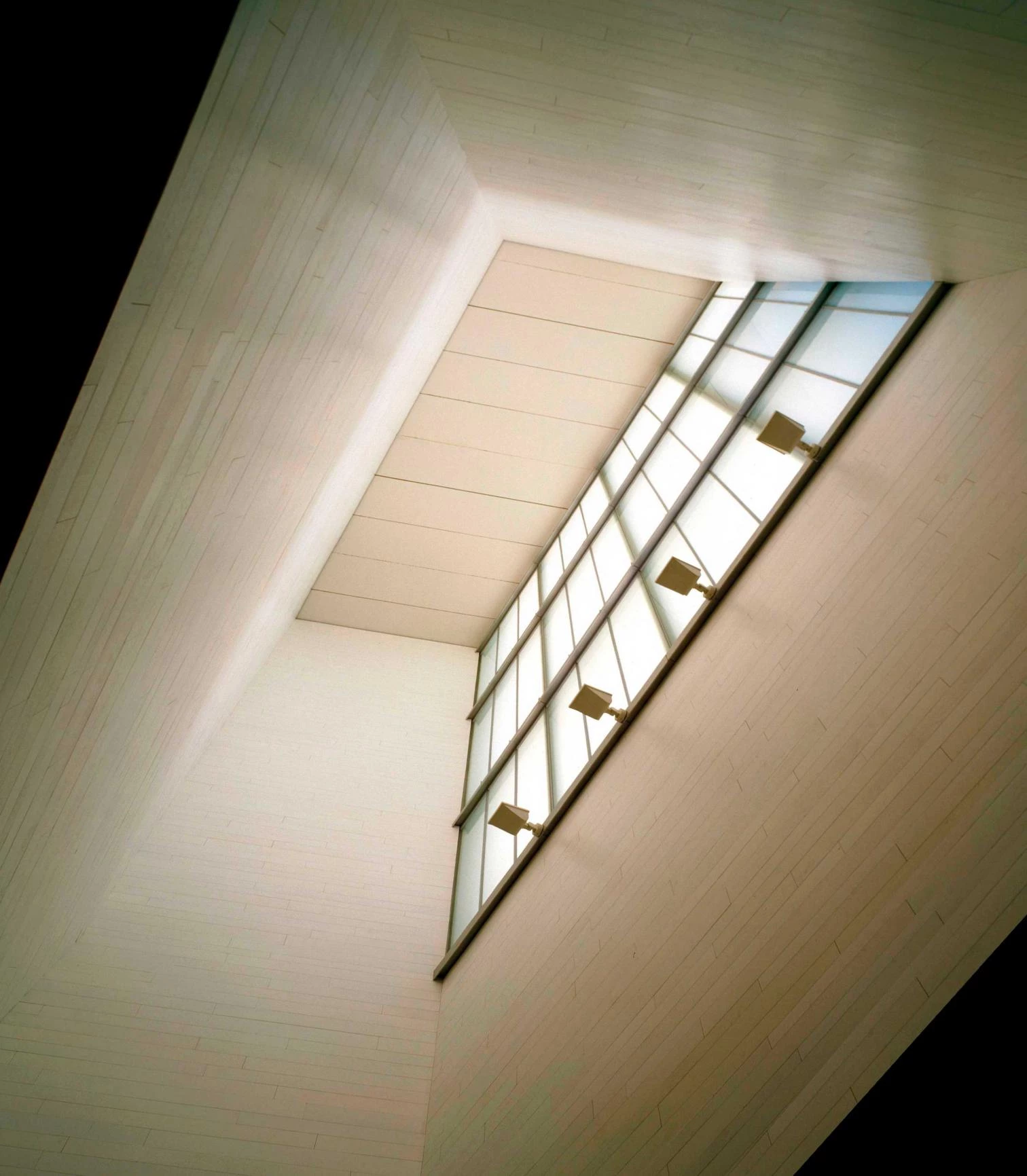 The interior space is defined by white concrete walls which constitute the structure along with five hundred prefab beams of the same material. Both the large windows that look onto the courtyards and the skylights are made with a double sheet of glass, the separation of which generates an intermediate space that permits cleaning and the complete darkening of the halls. The artificial illumination, of industrial character, is installed with electrified rails which function in specific cases. Each shed is materialized on the roof – fifth facade and reflection of the geometry of the floor plan – in two levels: one corresponds to the technical floors of the systems, built with titanium zinc, and the other to the voids between them, which are built as inverted roofs with a white gravel finish. The pavement is made of continuous concrete.