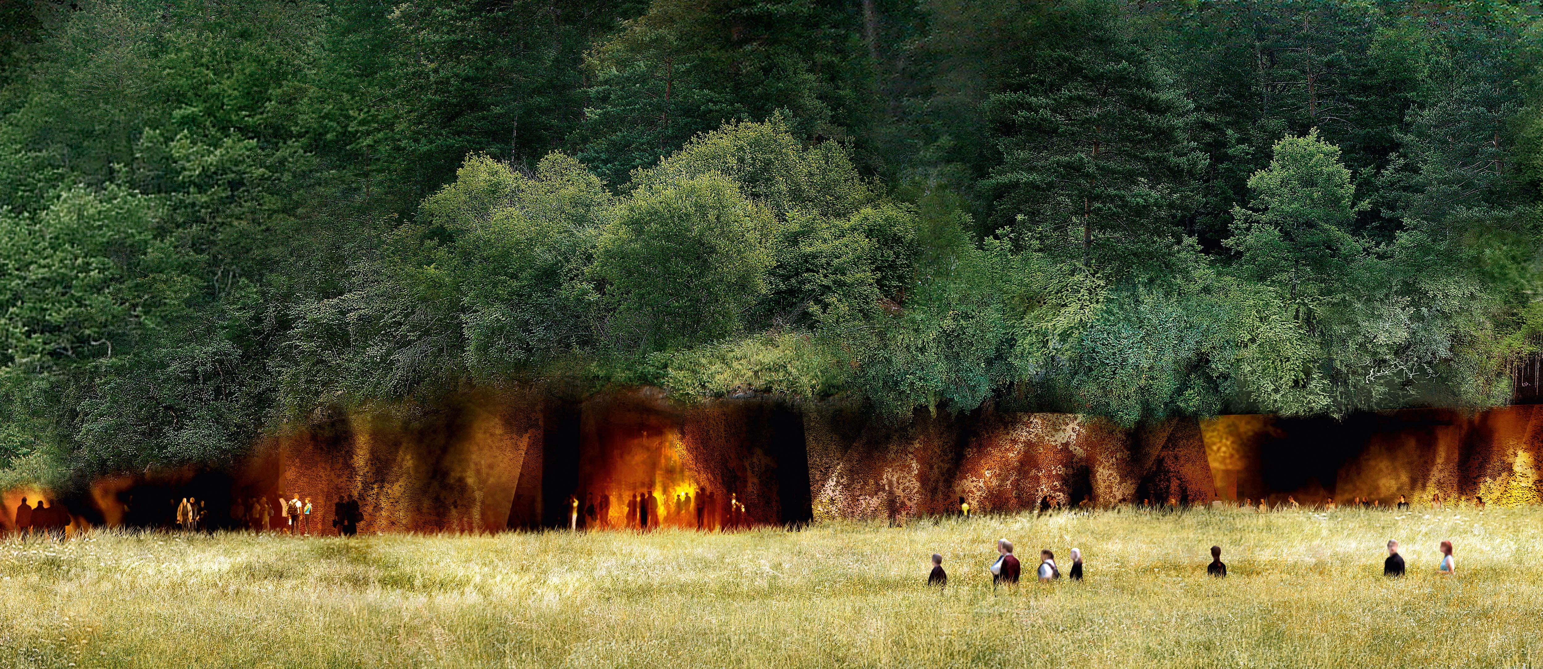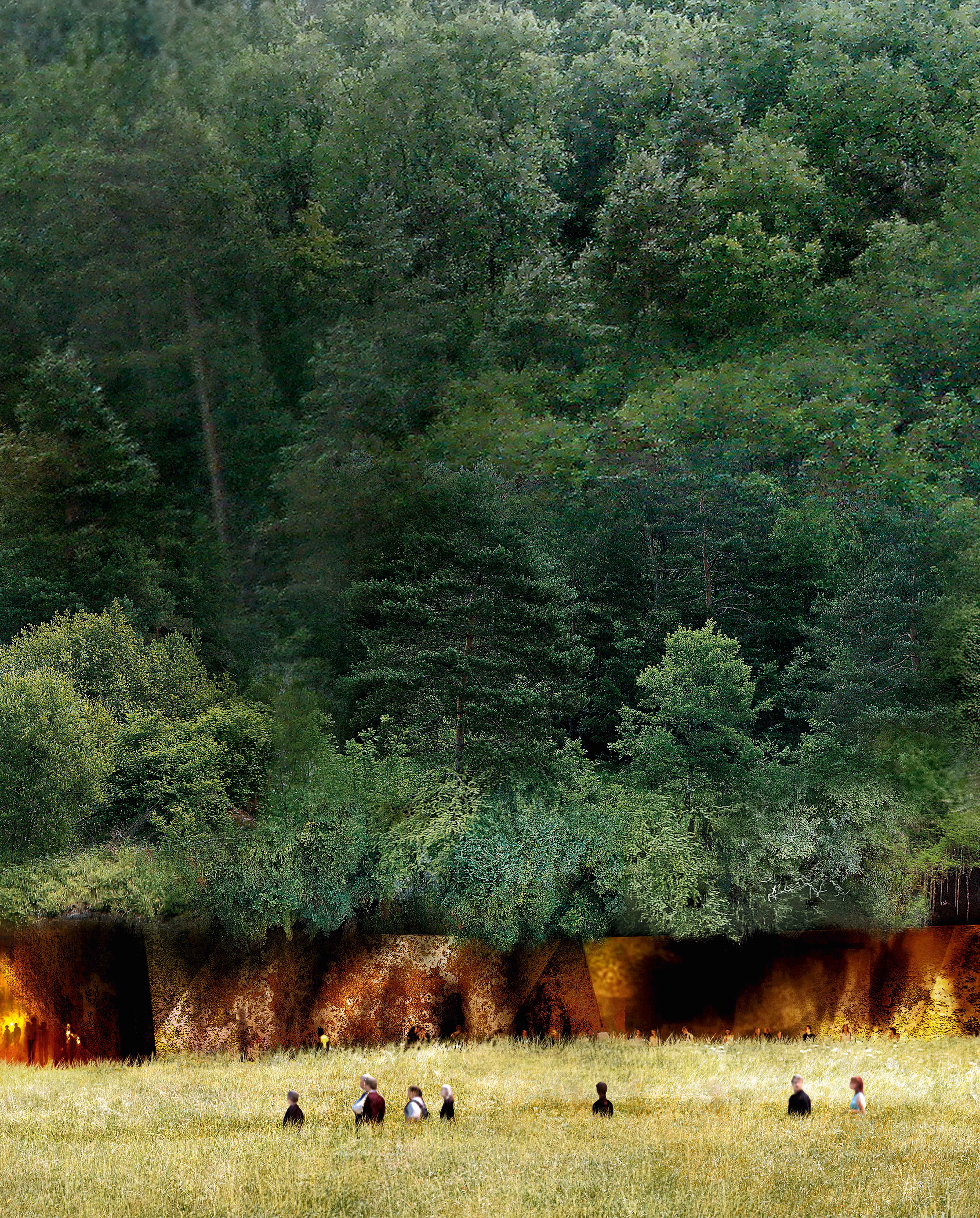 The proposal tries to reduce the presence of the building to a single artistic gesture. It conceals all the spaces under the forest except for a narrow band of 200 meters that at night lights up, taking on amber hues that herald its presence from the town...[+]