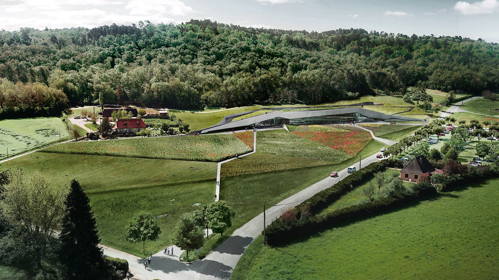 The museum is located in the Bordeaux region of southwest France, at the boundary of two divergent landscapes: a dense woodland, and the agricultural land of Vézère valley, which has been shaped by human activities and opens up to the sky. The museum serves as an interpretation center, informing visitors of the history of the Lascaux Caves, which are over 17,000 years old and have been closed to the public since 1963. The design also includes a 1:1 full scale replication of the Lascaux Caves for visitors to explore. The exterior, in tune with the cave concept, blends with the landscape, appearing as a crack between the hill and the valley. Facing north, the silhouette of the artificial incision is integrated into the profile of the hill containing it. Public spaces like the cafeteria or ticketing desk are connected to the exterior and the more brightly lit areas, while the museum is located in the darker interior spaces, recreating the experience of entering a cave. Visitors are handed an interactive ‘torch’ device for their journey through the recreated caves that will give additional information about the paintings.
