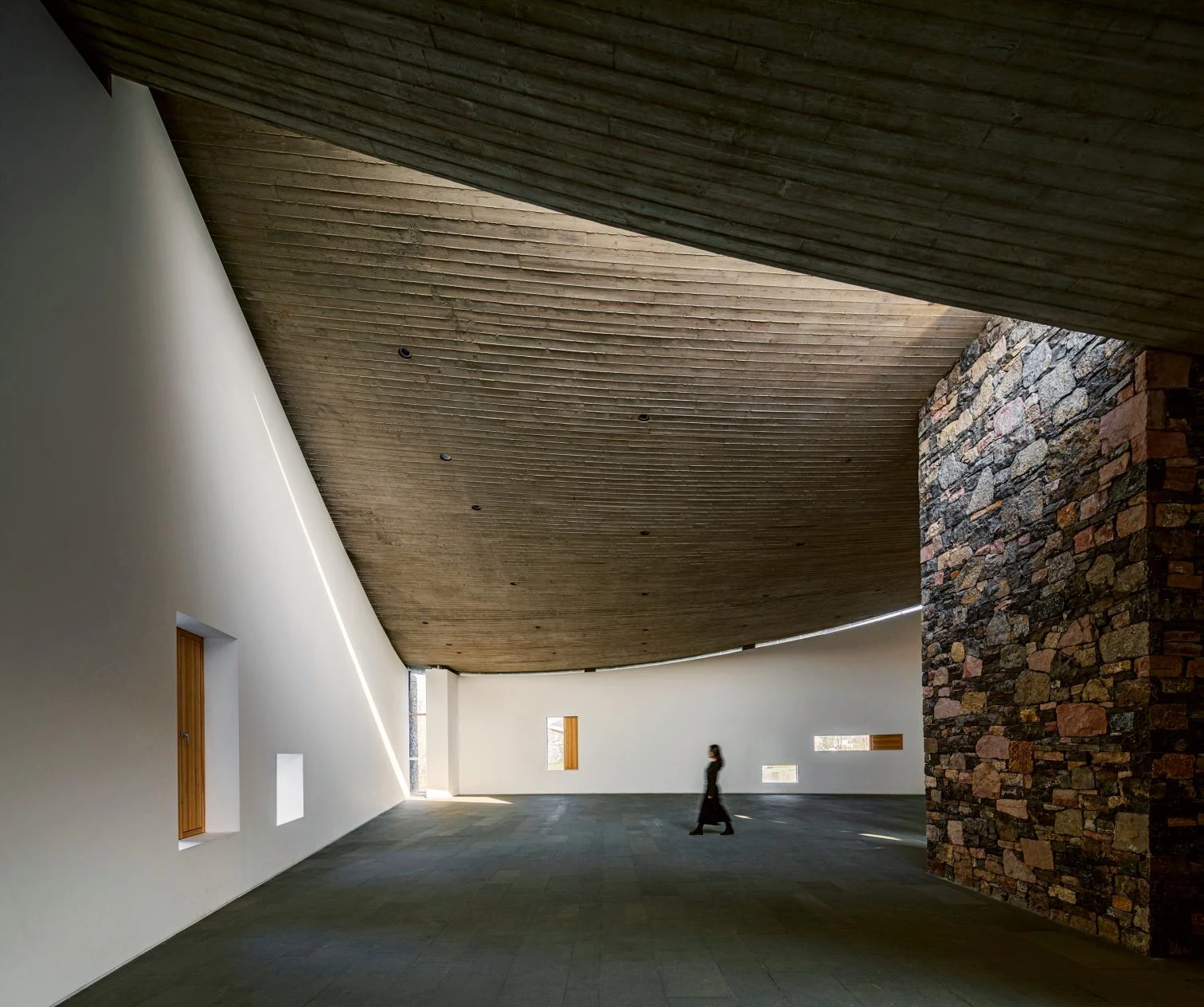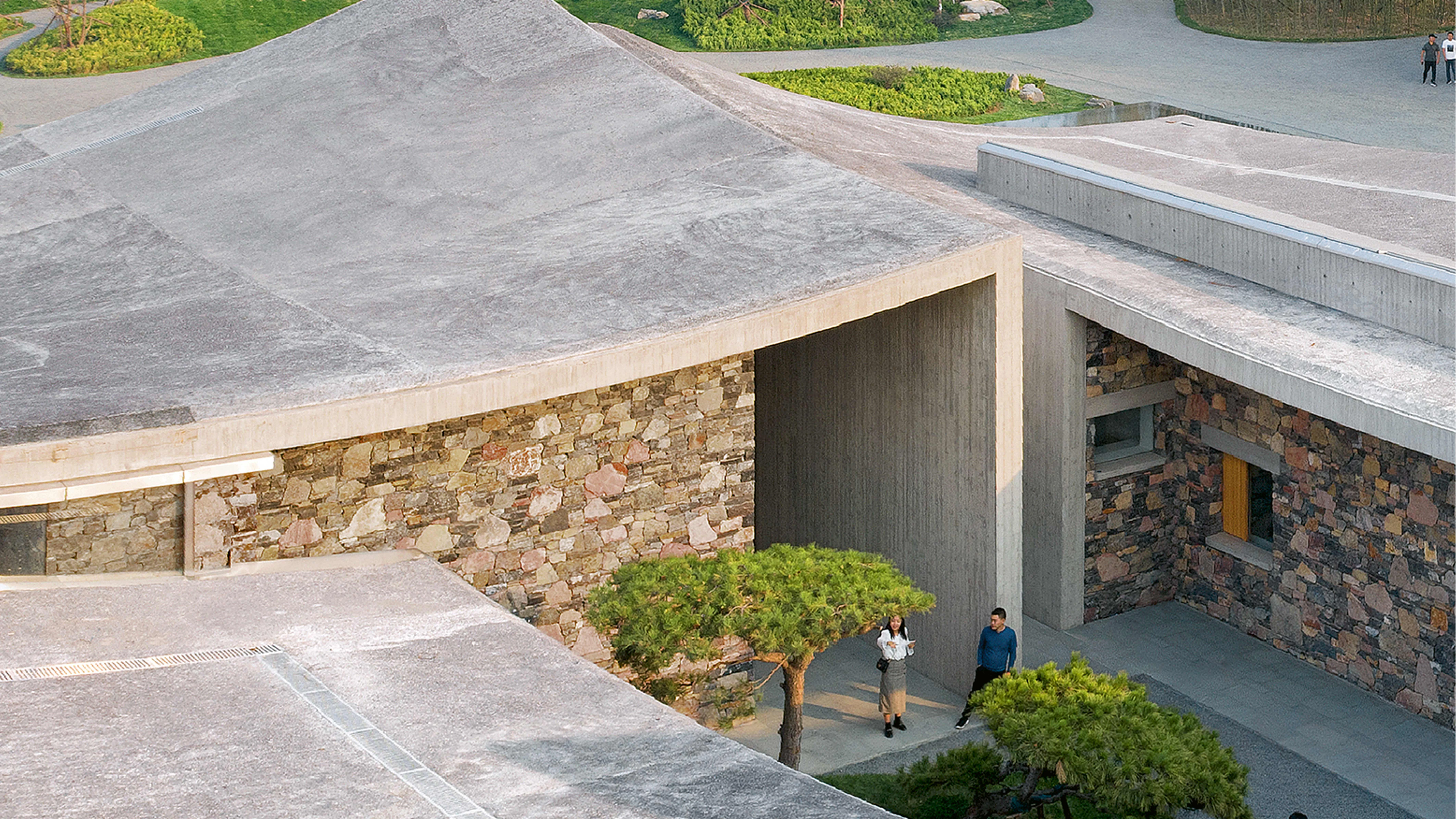 Resting on the stone walls that rise from a pool of water according to techniques common in northern China, some concrete roofs tense up the interior spaces with their gentle hyperbolic paraboloid forms.