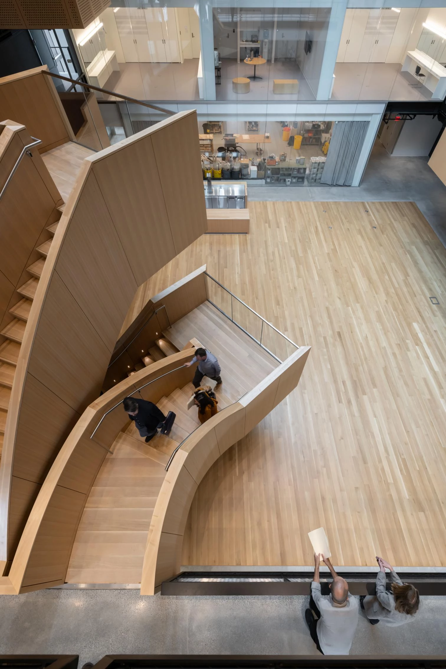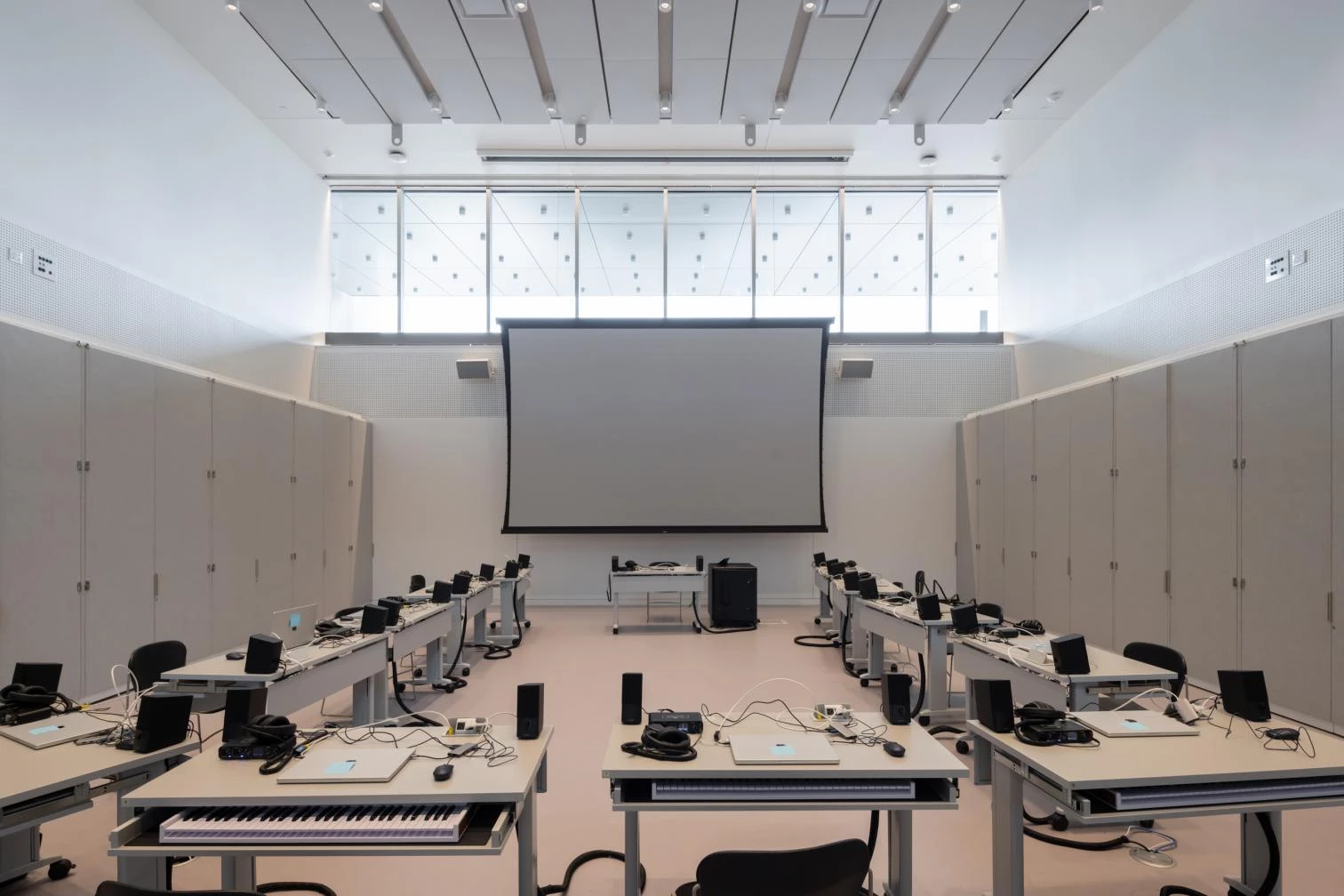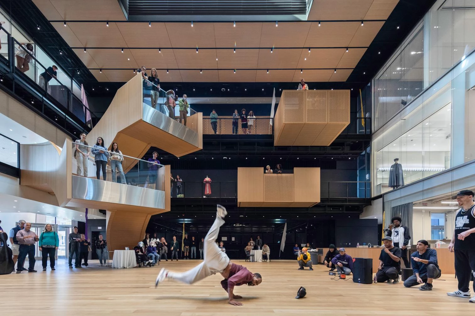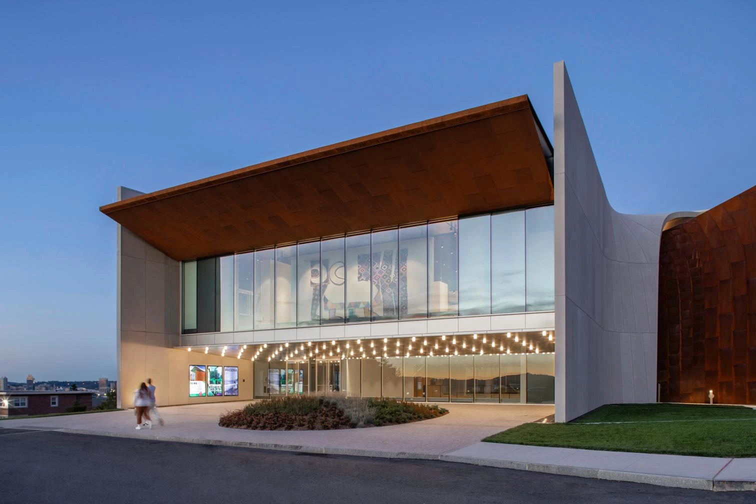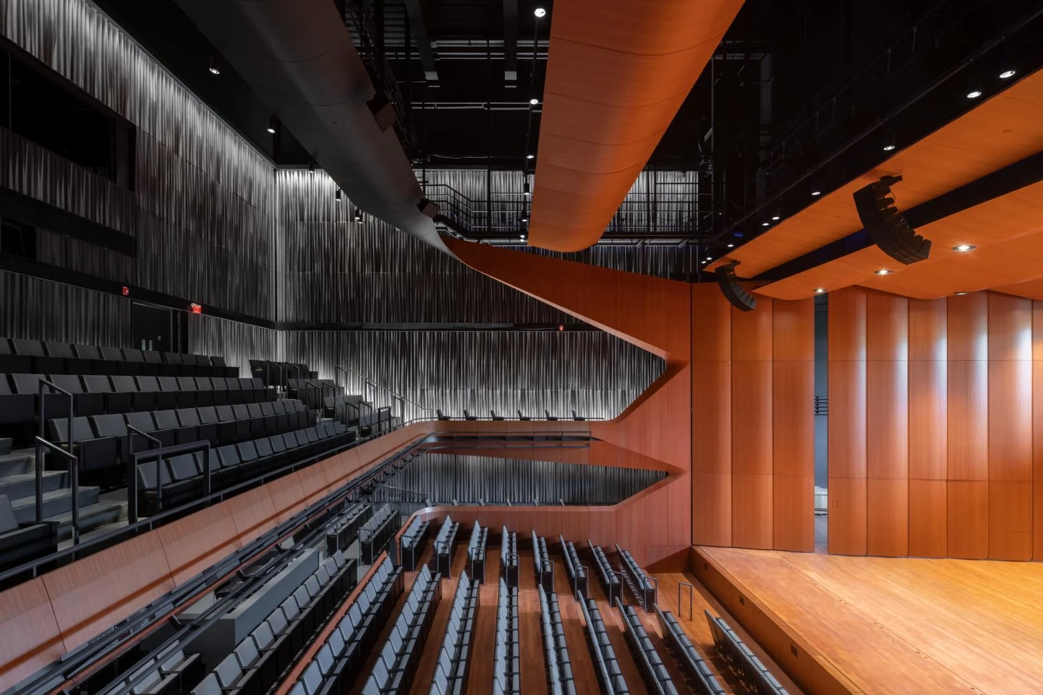 The 7,800-square-meter facility includes the Luth Concert Hall for an audience of 400, the flexible Boroughts Theater seating 400, and the relocated Iris and B. Gerald Cantor Art Gallery. Intended as an incubator for multidisciplinary learning and creativity, it also features recording studios, rooms for for lighting and set design study, and multimedia and multi-use facilities. Perched a hill, the building presents surfaces of prefabricated concrete and core-ten steel. On the outside, the fluid forms of both materials rise and intertwine, creating an arched entrance leading to the heart of the building.