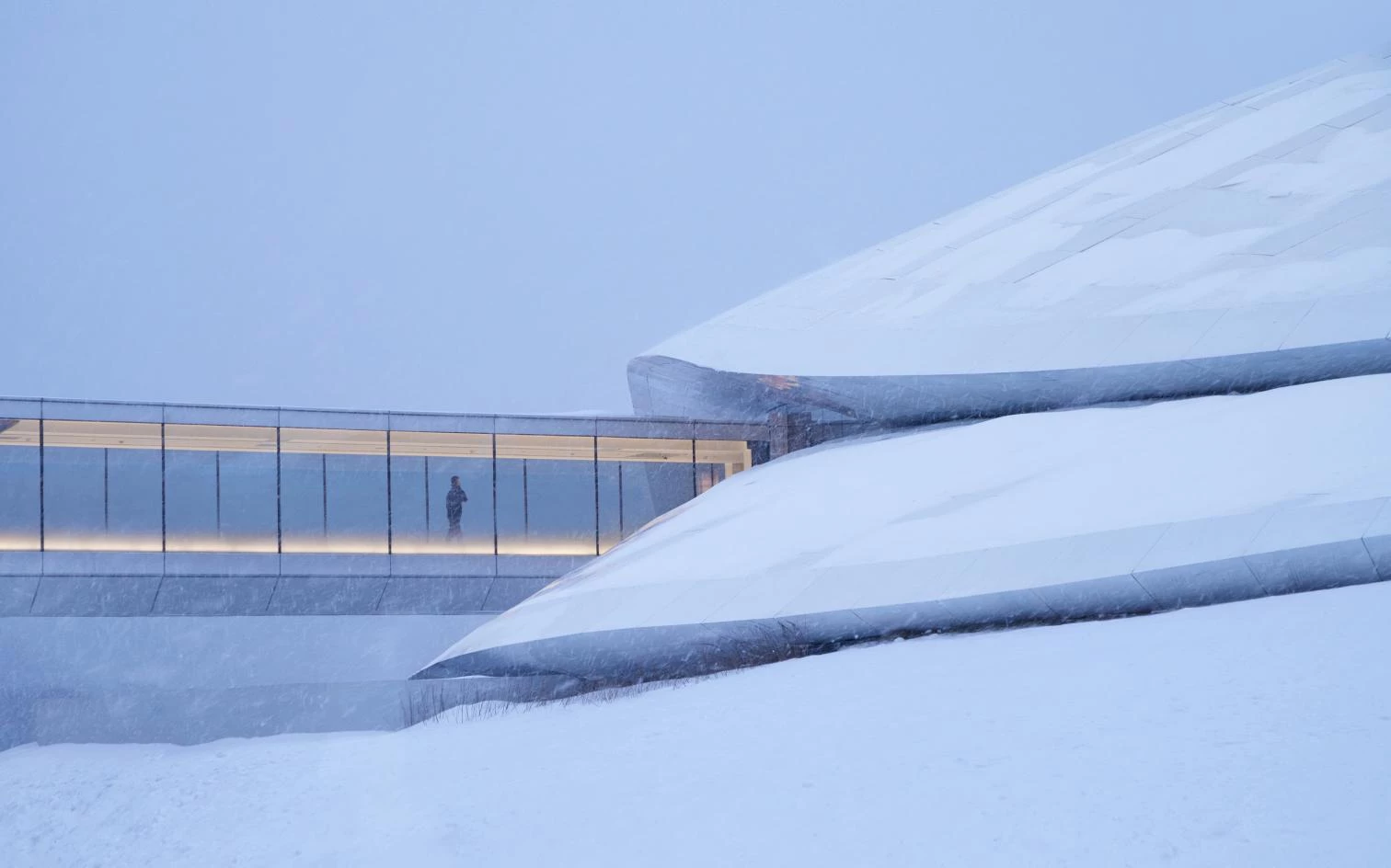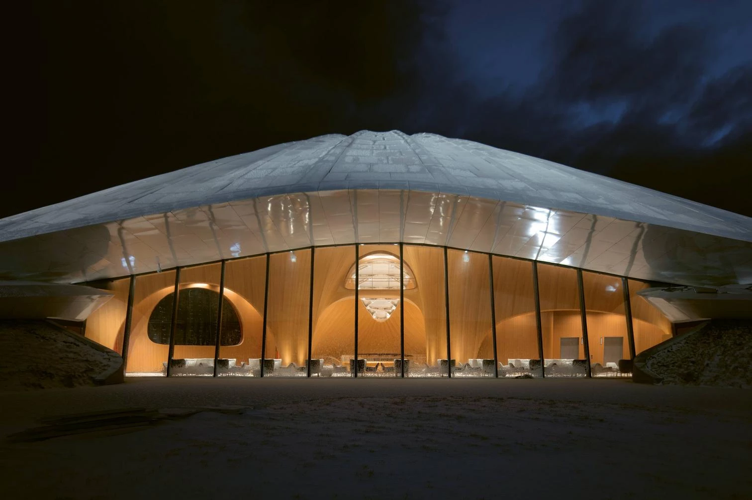With a structure resembling a tent of gently sloping lines, the building presents a white roof evoking the surrounding snow-coated hills. Containing 16,198 square meters in four floors and rising 23.3 meters, it includes halls for exhibitions and meetings. Windows all around give sweeping views of the mountainous landscape. Wood dominates the interiors, which are naturally lit in abundance through a large skylight.