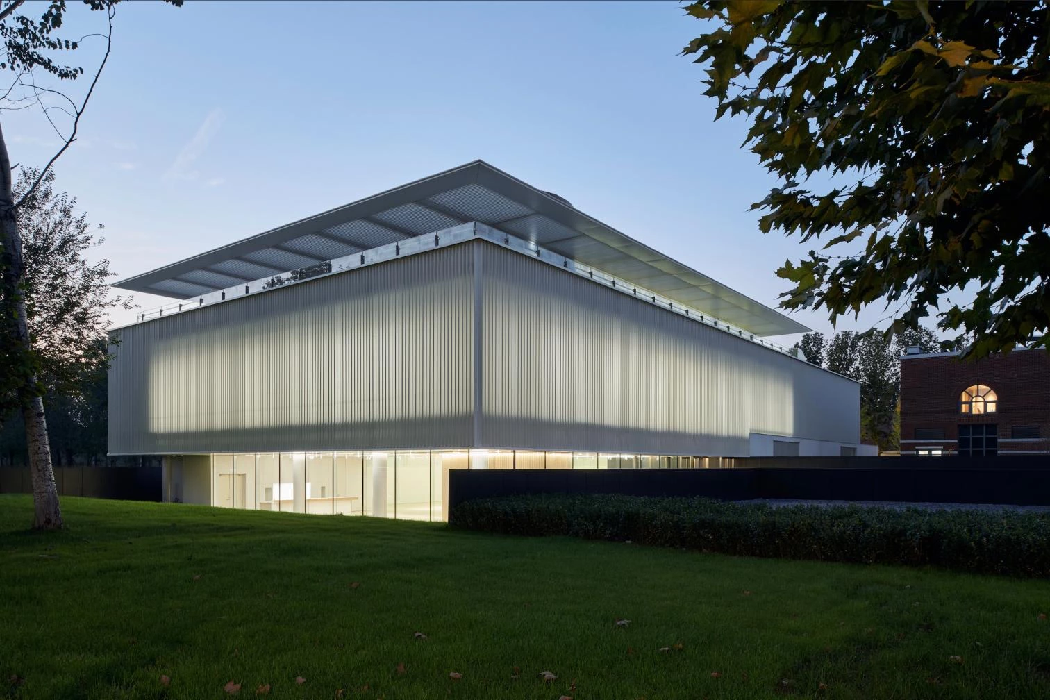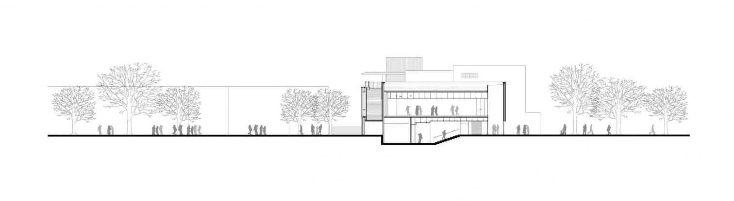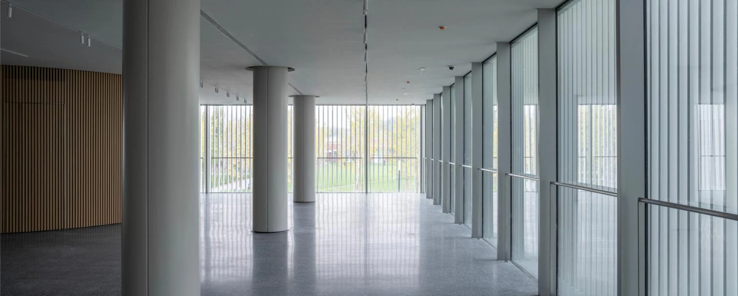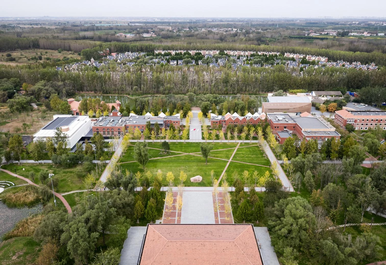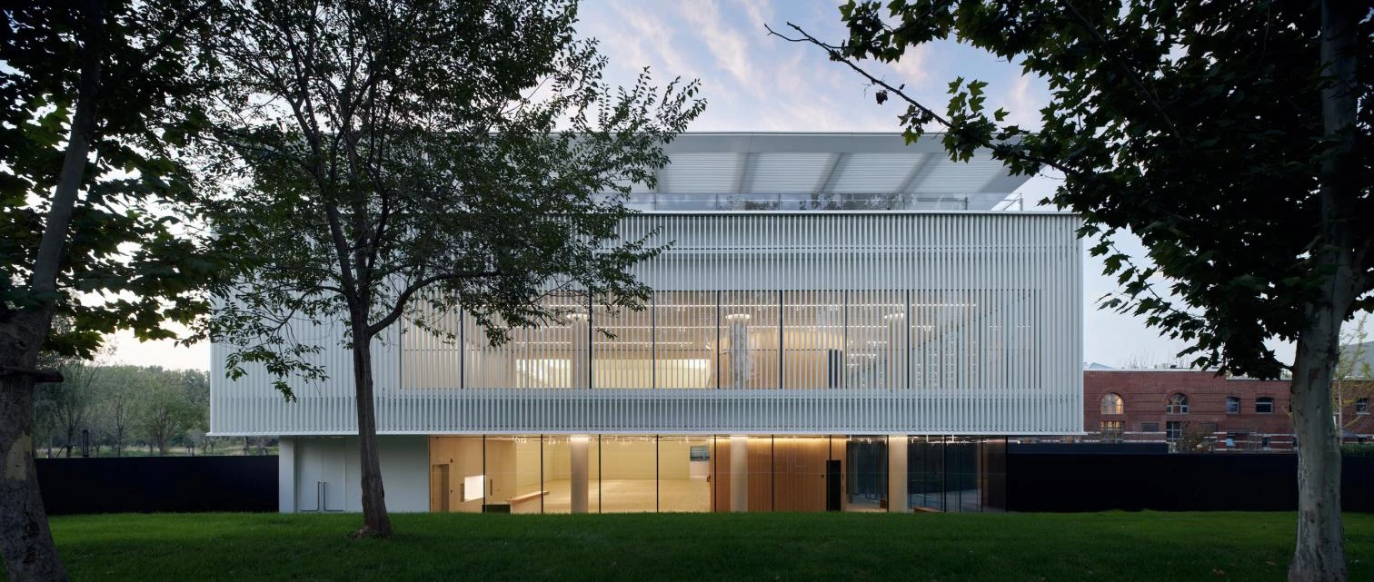 This new construction is located at the western end of the China Resources University campus, in Xiong’an New Area of Beijing. Surrounded by red brick buildings, the complex is sunken 1.5 meters into the ground to reduce its visual impact on the area. The palette of materials for the translucent facade was given careful thought, aimed at giving an impression of lightness. The double skin is composed of an inner layer of glass and an outer one of metal, with vertical pieces of alumnum providing rhythm. With a built area of 2,500 square meters and a rectangular floorplan, and rising 10 meters, the convention and exhibition center meets the needs of multiple functions. On top is a viewing deck offering panoramas of the campus.