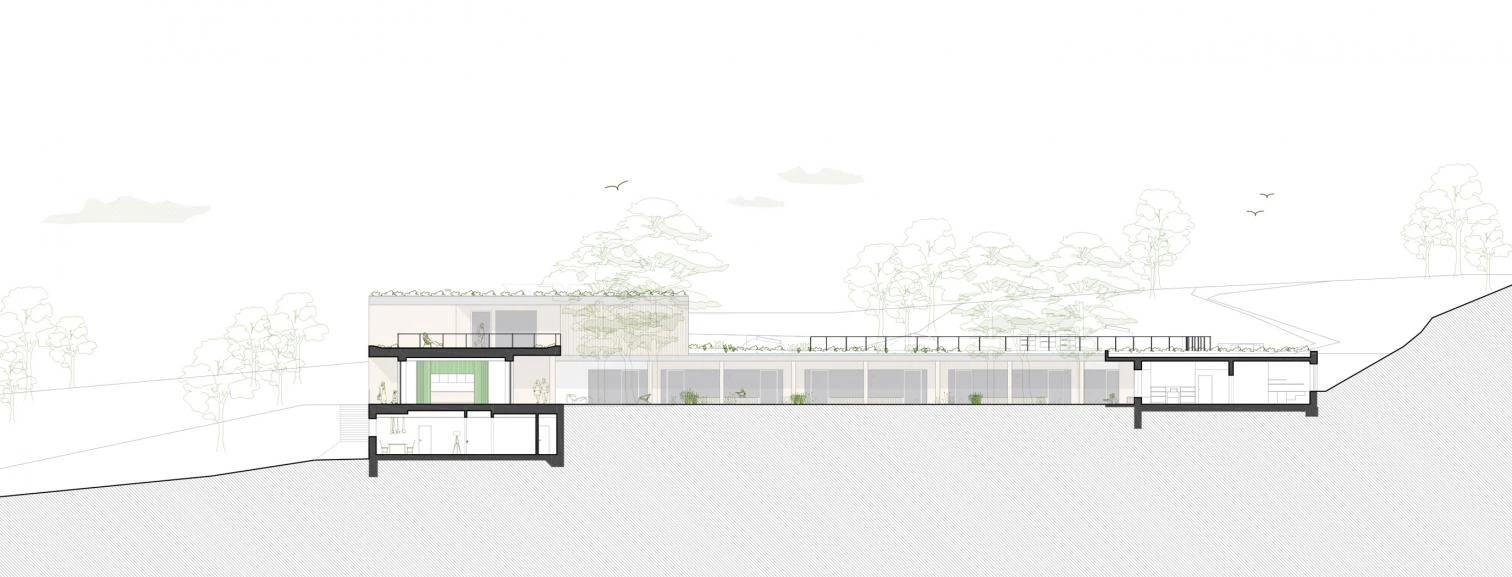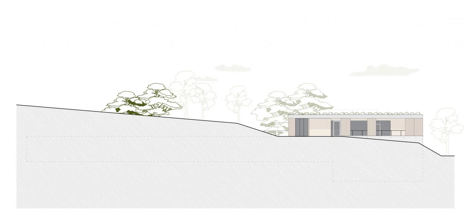 The level intended for families is deliberately set apart for privacy. The common room for informal meetings with other families has direct access to a terrace offering panoramic views. The underground part contains offices, storage, and technical facilities. Concrete is the main construction material, combined with glazed panels and larchwood.
