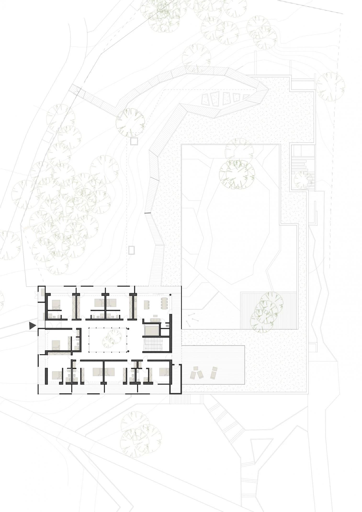 The main floor is organized around a central void, presenting four areas differentiated by function: daily activities (physiotherapy, art therapy, music therapy, a pool for watsu therapy or snoezehen, and a cinema) distributed in turn around a smaller courtyard; a public space for visitors; the patient rooms; and a separate space with a room for last farewells, with its own memorial atrium.