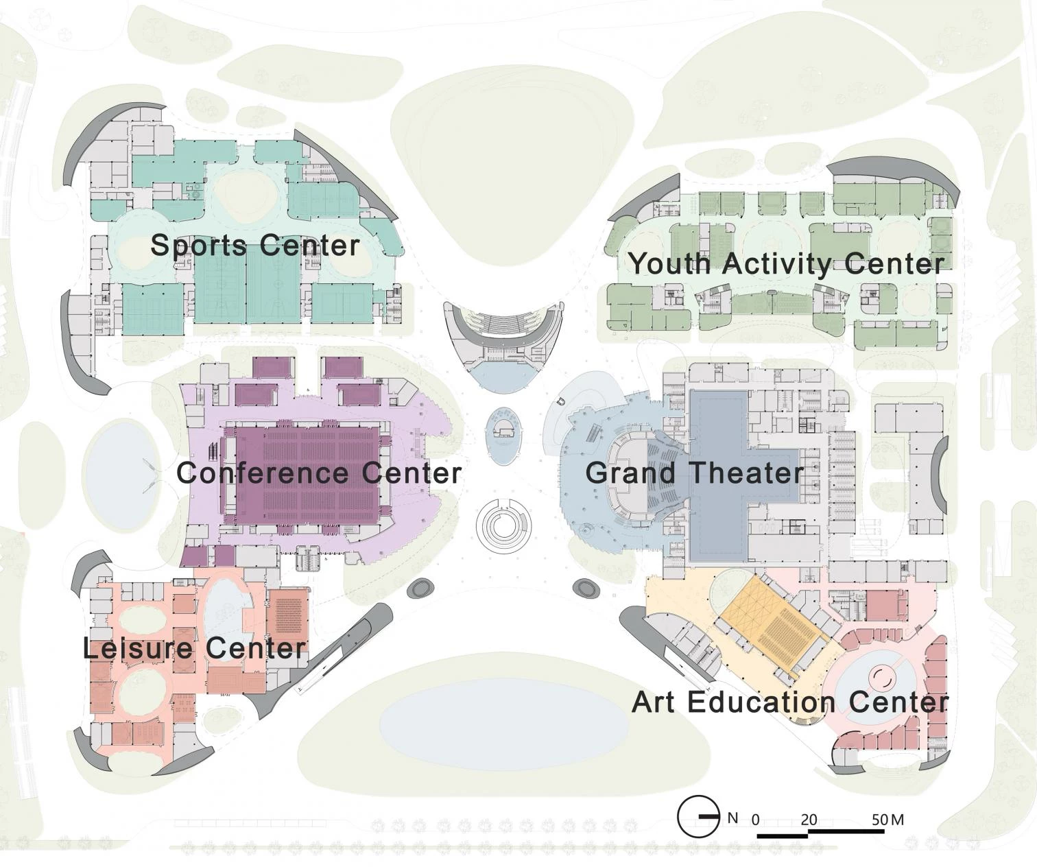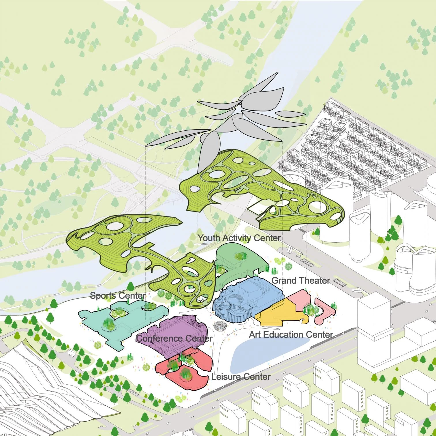 The firm MAD Architects, headed by Ma Yansong, has unveiled its design for a cultural center in Anji, located in southeast China’s Zhejiang Province and known as the country’s bamboo and white tea city. The 149,000-square-meter complex features a theater seating 1,300, an auditorium for conferences that will take in 2,000, a leisure center, sports facilities, plus spaces for youth activities and art education.