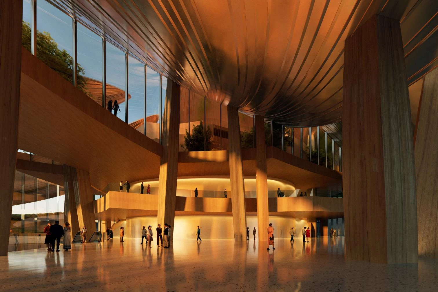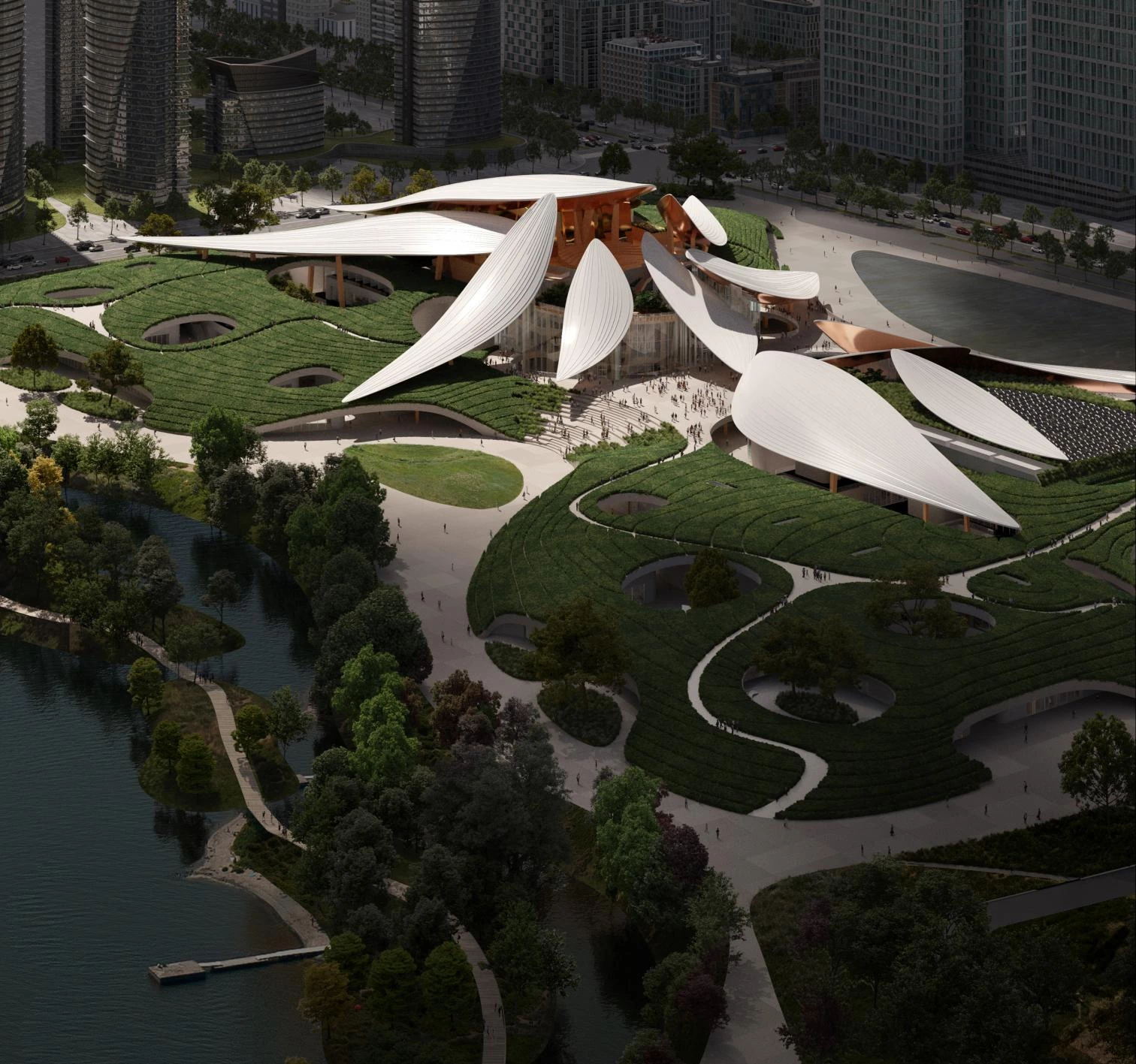 The roofs combine white metal pieces shaped like bamboo leaves with grass surfaces evoking tea plantations, with openings in between to let daylight in. The self-supporting glass wall of the main facade rises 17 meters. Construction has begun and completion is programmed for 2025.