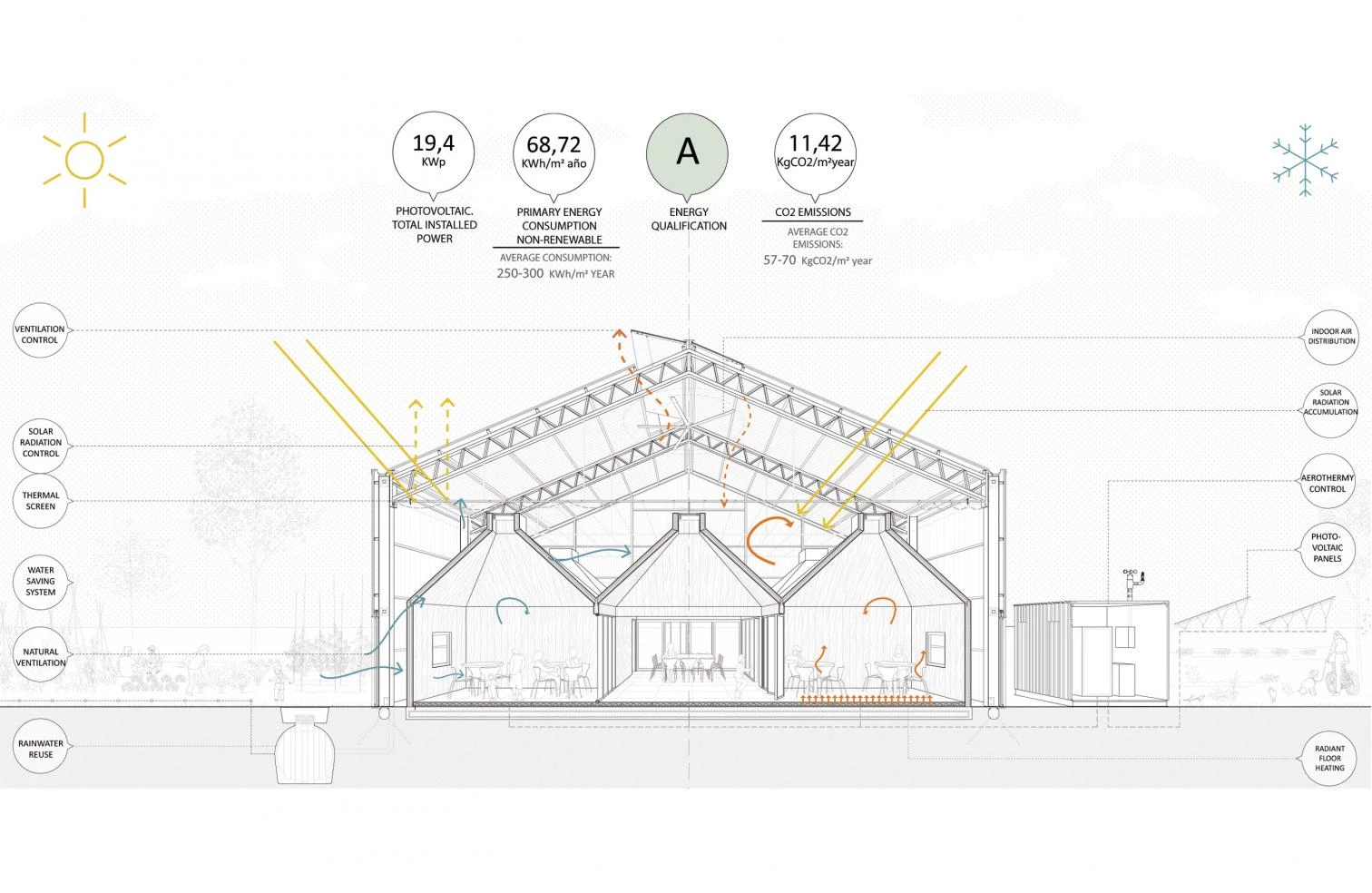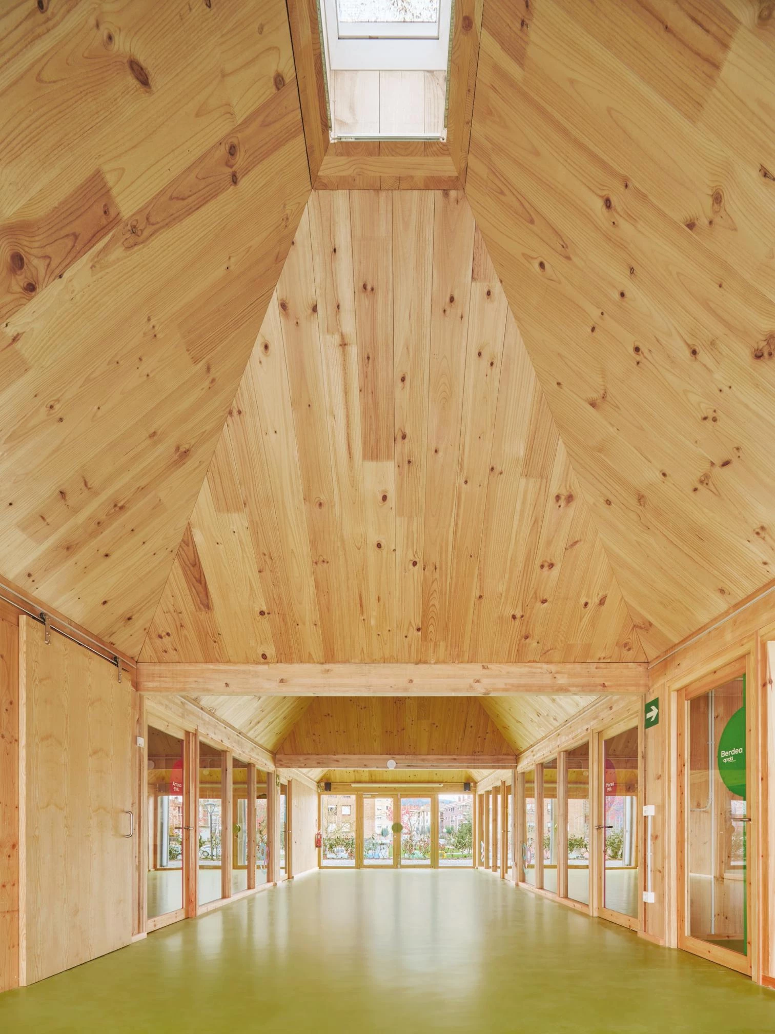 Built with steel and translucent polycarbonate, a greenhouse volume contains within it a series of modules clad in prefabricated panels of cross-laminated timber (CLT). With a bioclimatic enclosure, the building encompasses a large outdoor space that acts as a ‘square’ and a series of wooden modules for training activities, a multipurpose classroom, a living and resting area, a kitchen, and a dining room. The construction system is comparable to that of an agricultural farming greenhouse, with automatic opening and shutting devices regulating the intake of sunshine and air. Temperatures can thus be regulated to fluctuate between 16ºC and 30ºC, acting as a thermal cushion and helping to keep the wooden modules comfortable, with little energy consumption.