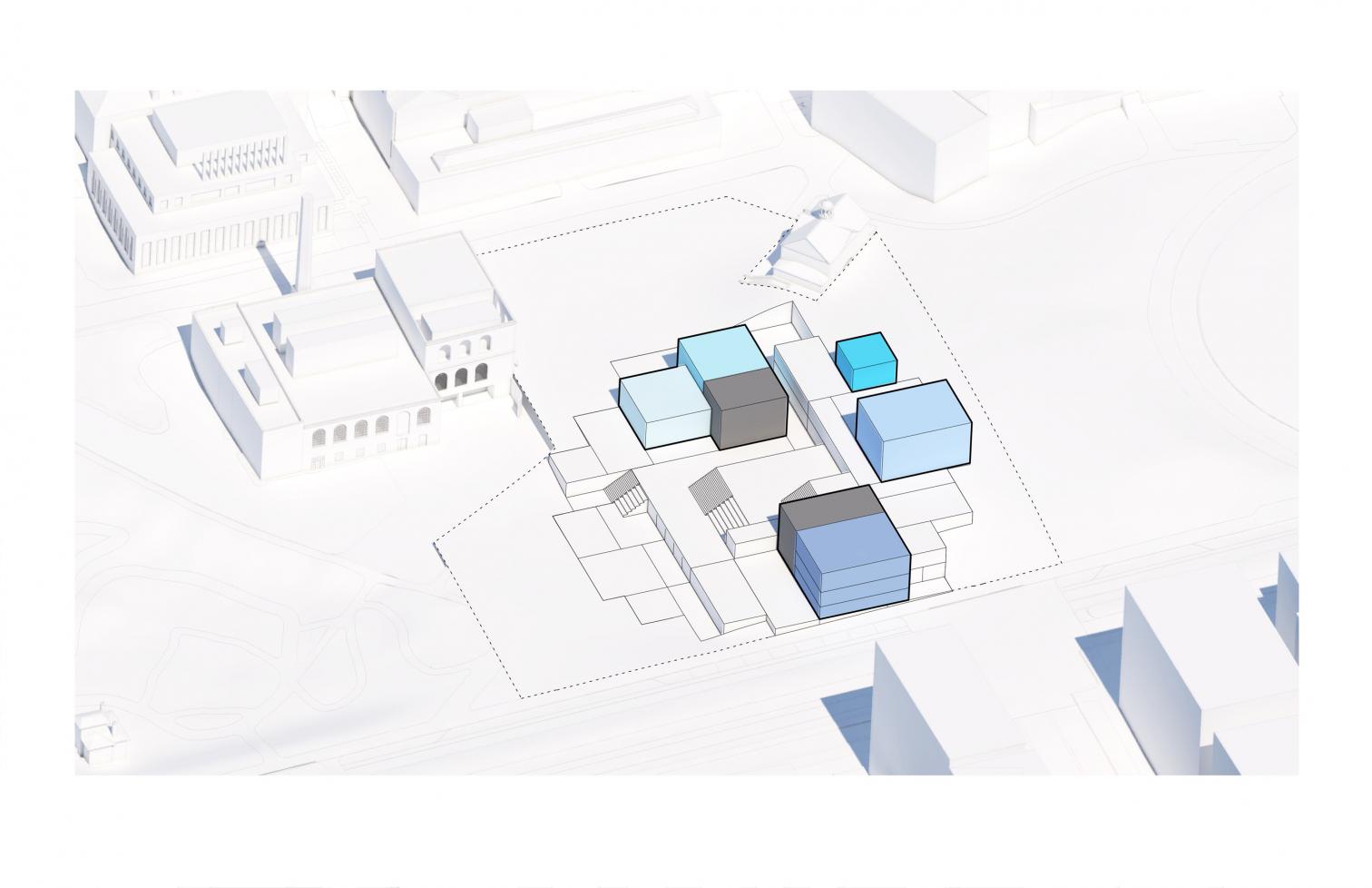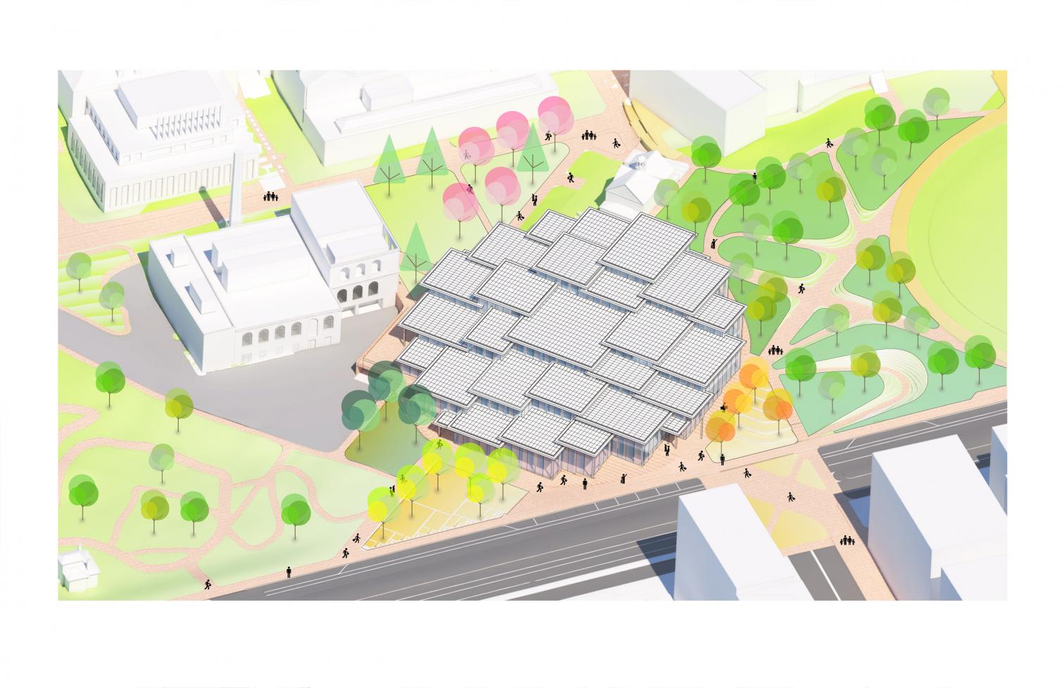 Inside, a large central atrium connects the different areas of the complex, which include an auditorium for 250 people, meeting and study rooms, as well as spaces for student associations.
