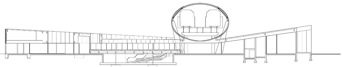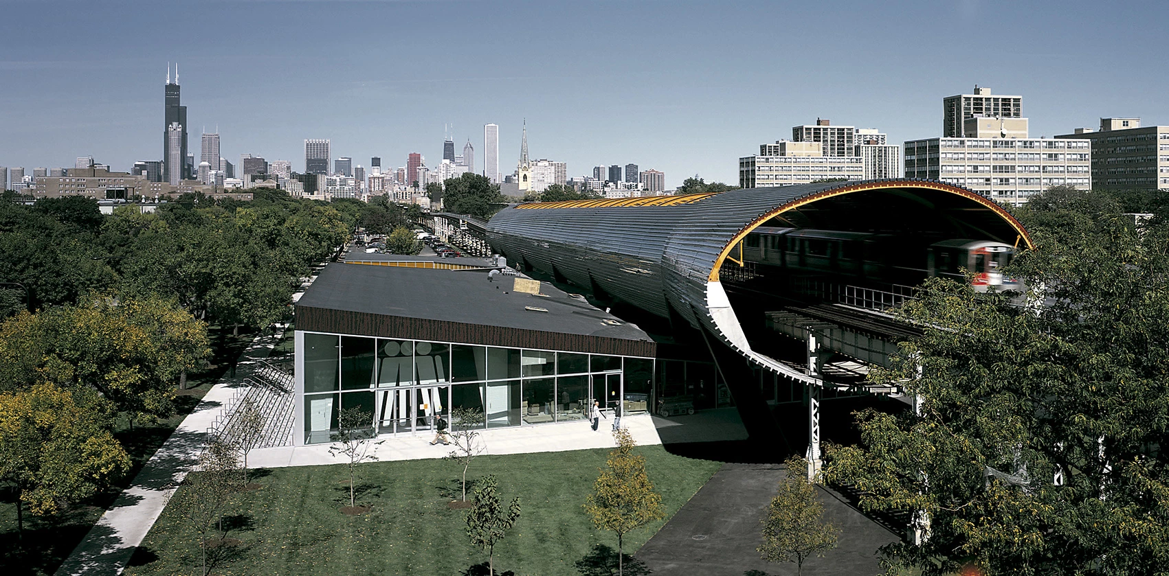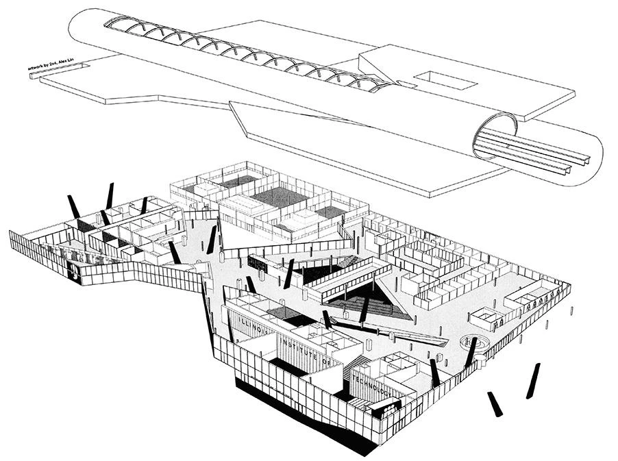 The aim of the project was to reinvigorate the IIT Campus, planned by Mies van der Rohe in the 1940s. Over the years the campus had sprawled but lost half its population, and was separated by elevated railway tracks. The competition called for a new center able to articulate two areas: residential to the east and academic to the west. Starting from the void open in the existing fabric, the project acts on the largest area possible with a minimum built volume. Most of the intervention falls upon two gestures: a docile roof, which slopes to dive into the elevated footbridge and is submitted to the structural weight of the road; and an ovoid tube, clad with stainless steel, that captures the space above where the train runs and brings it inside, like the vaulted ceiling in the recreational area.