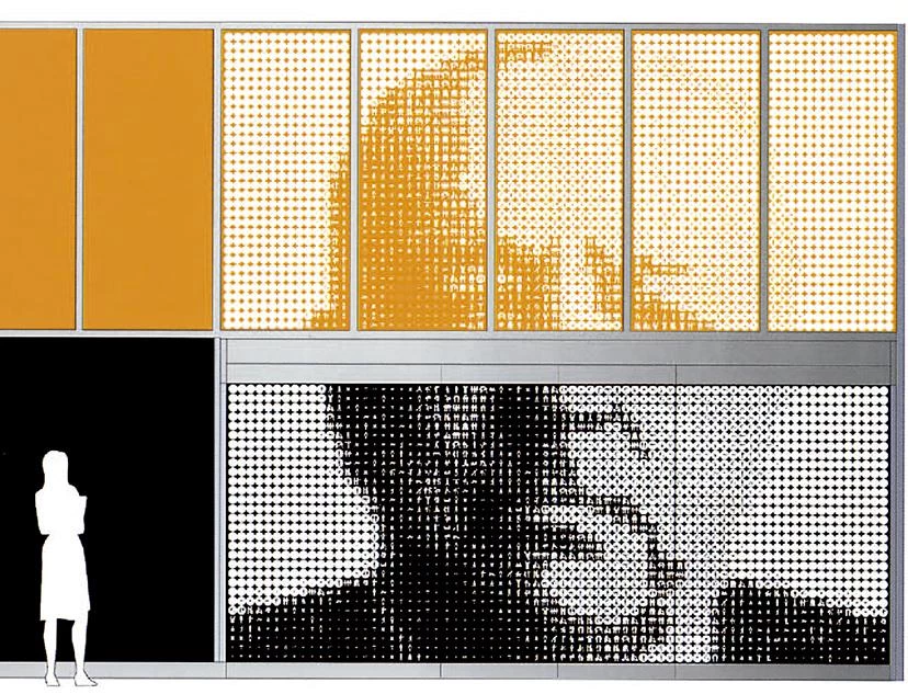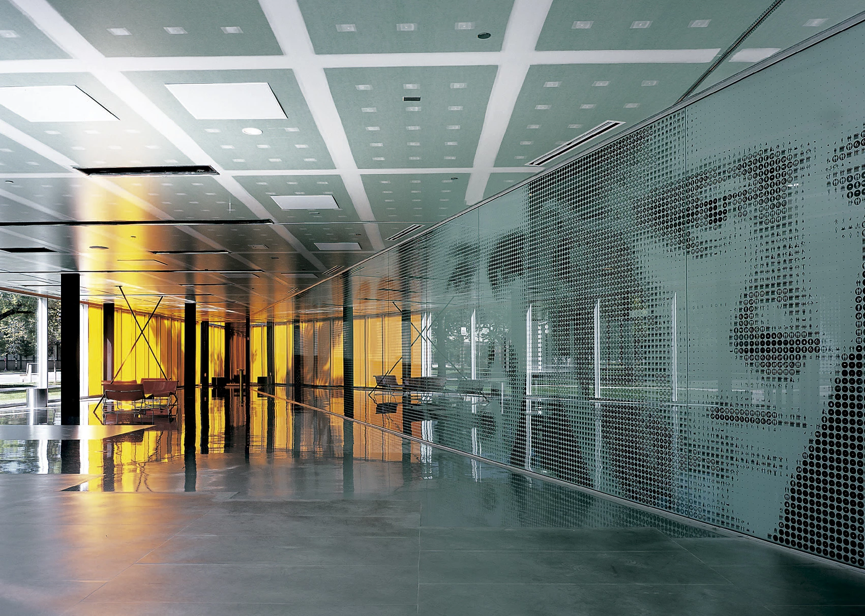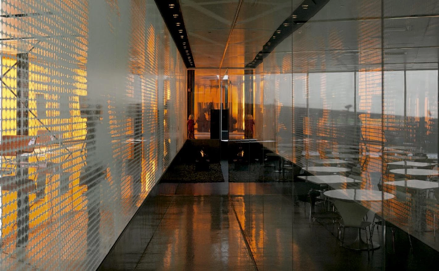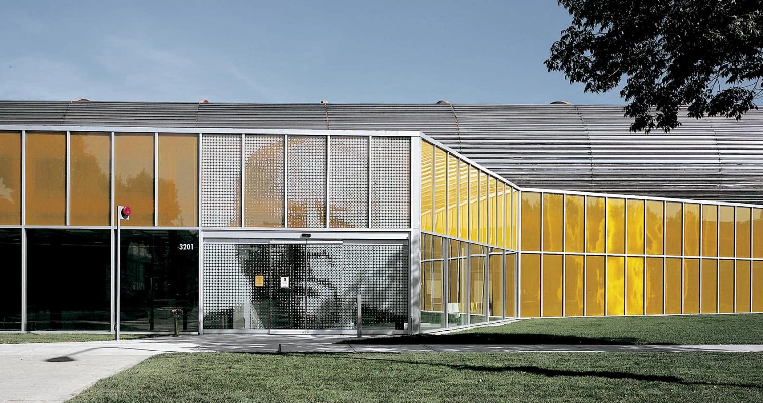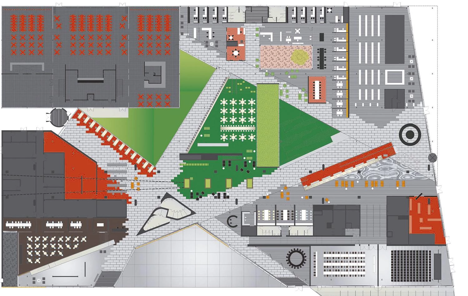 The center includes the Commons Building, built by Mies in 1954, which today includes a dining hall for students, forms a rectangle with the new center, and wraps up the northeast corner of the block. Multicolor at ground level, the different program elements are all encompassed by the roof, stratified to guarantee acoustic insulation.