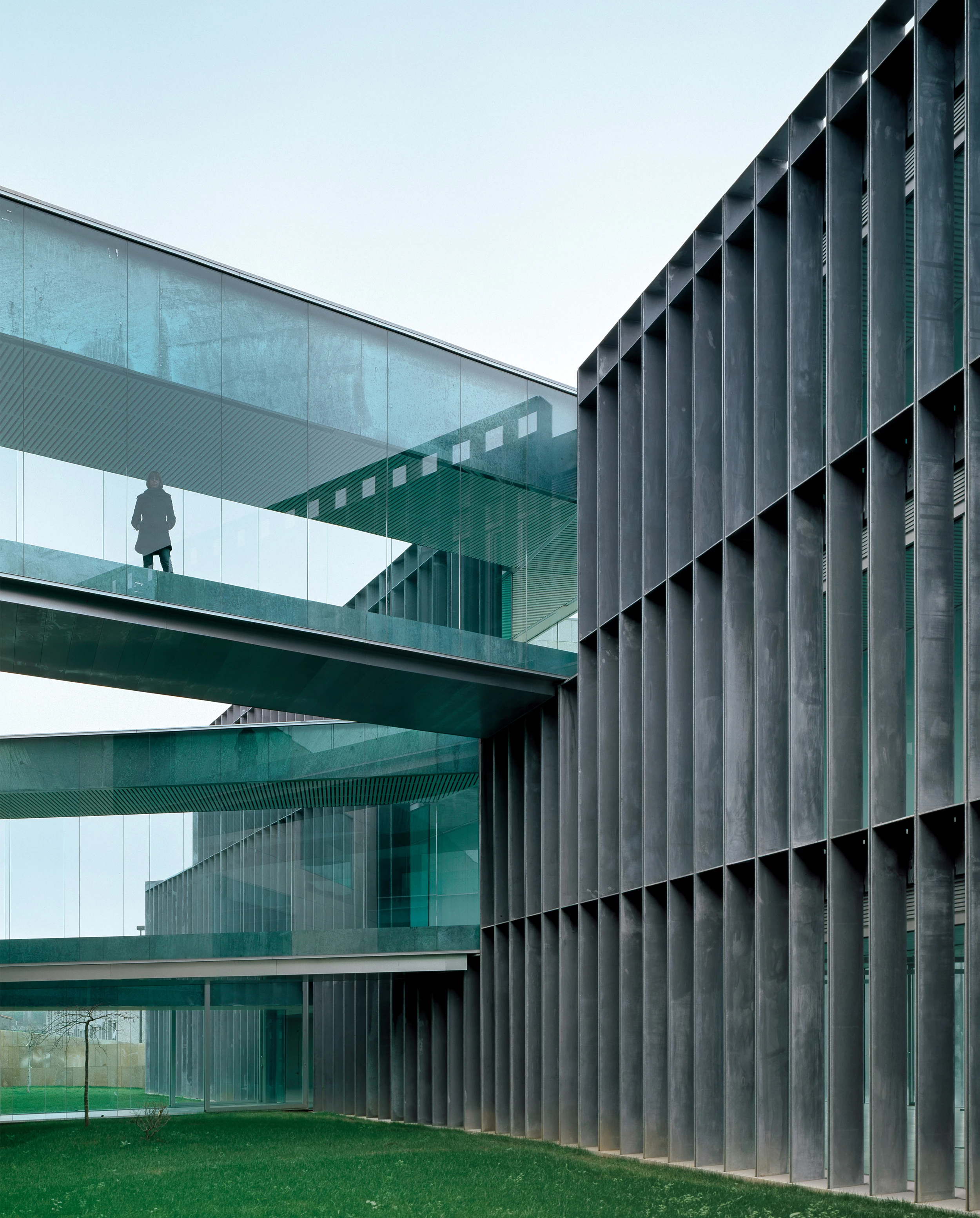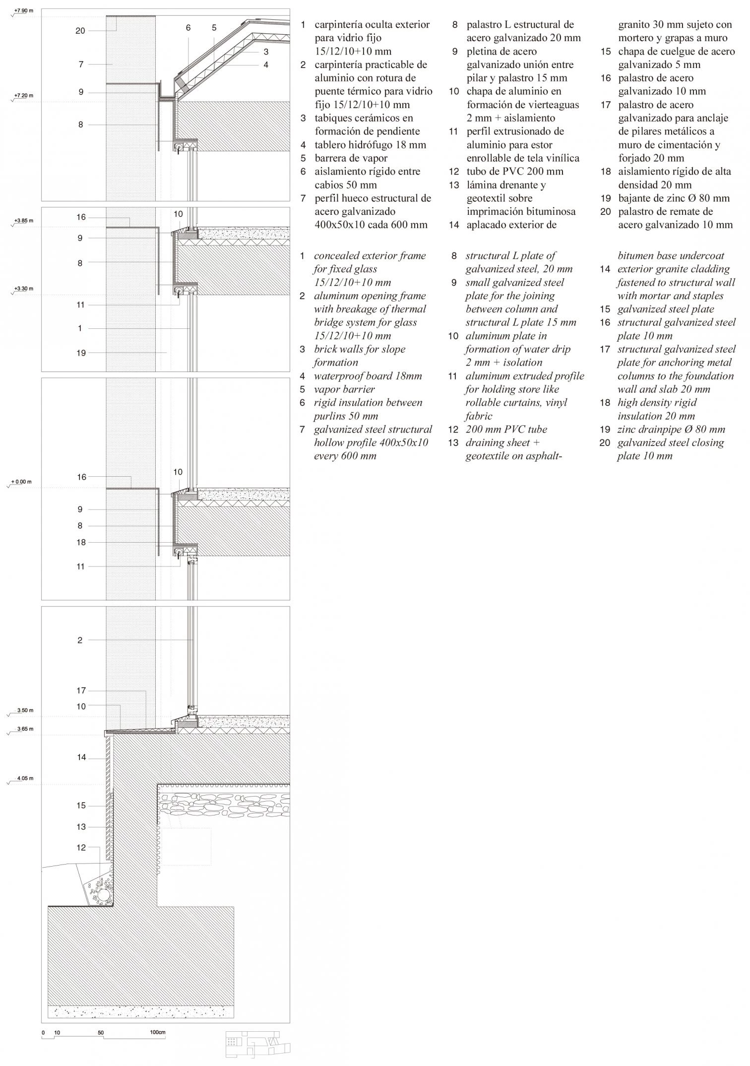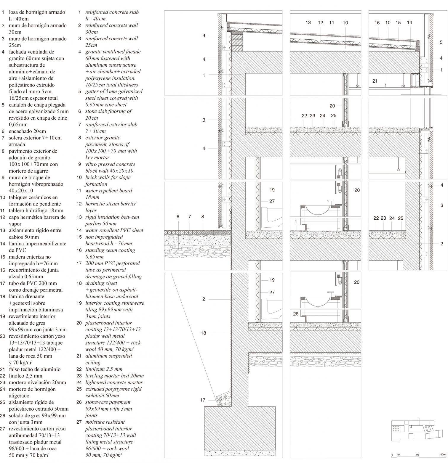 The structure is the project’s most important constructive consideration. The north volume is denser and the granite-clad concrete walls, some of them with a retaining function, play the leading role. But the south volume, lighter, is the one that takes on the task of pursuing a greater formal expressiveness through the structure. In this way, a series of profiles manufactured with thin steel plates – all galvanized and later screwed on following a meccano-like construction –, thus defying the slenderness limits, are built forming an independent ‘external’ shell upon which, once executed, the interior slabs rest. A clear tribute to Jean Prouvé.