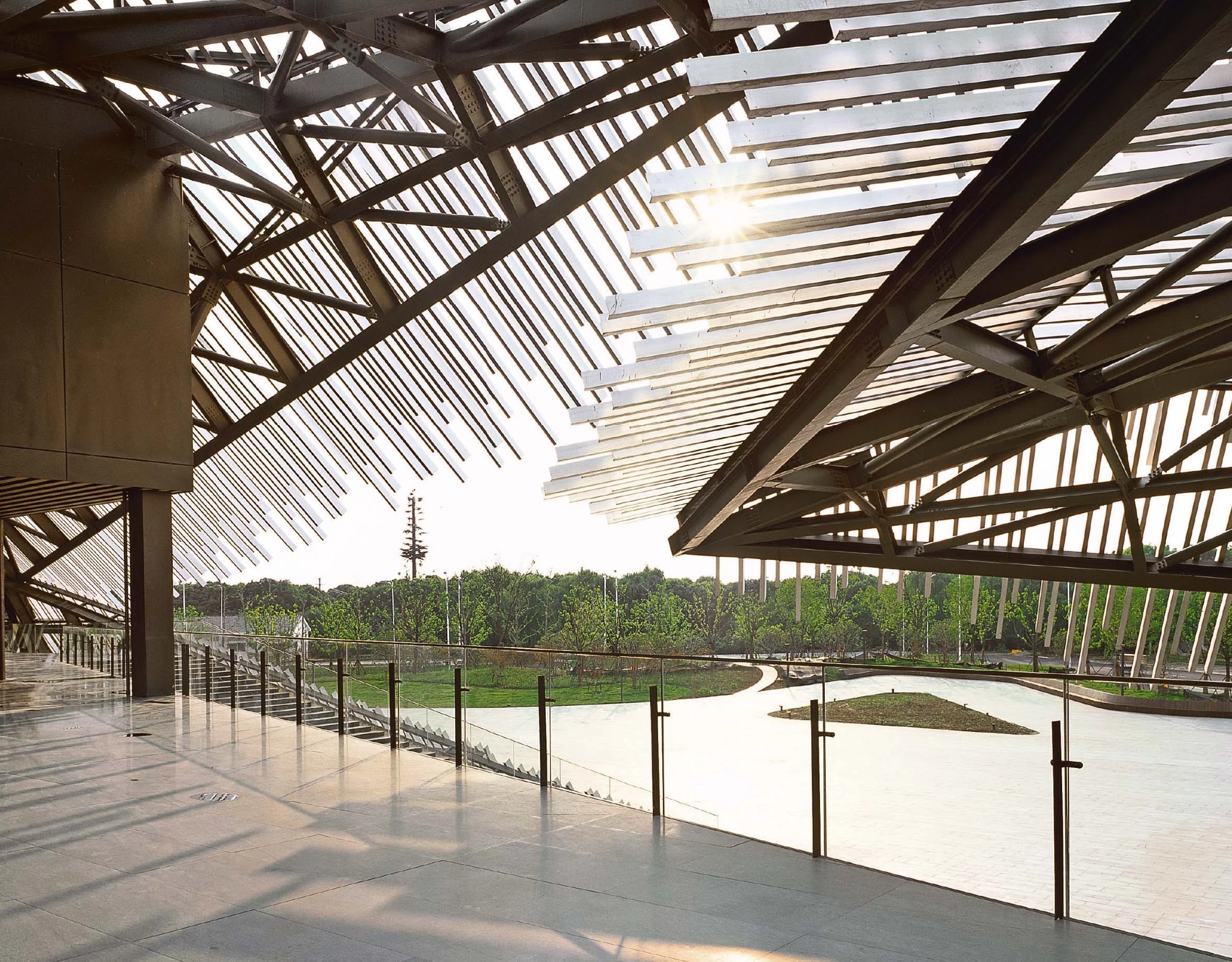 Two triangular roofs, connected by a footbridge, open up towards the lake, shaping the number eight in the Chinese letter, which means growing prosperity. The rooms with pyramidal form are clad with superposed aluminum profiles, which recreate the nuanced texture of the traditional thatched roofs using a modern material. Inside, this permeable structure filters sunlight creating a comfortable space in the shade. The slope and position of the different surfaces have been carefully studied to avoid interrupting the views of the lake.