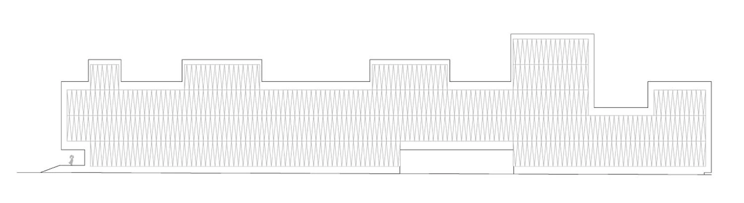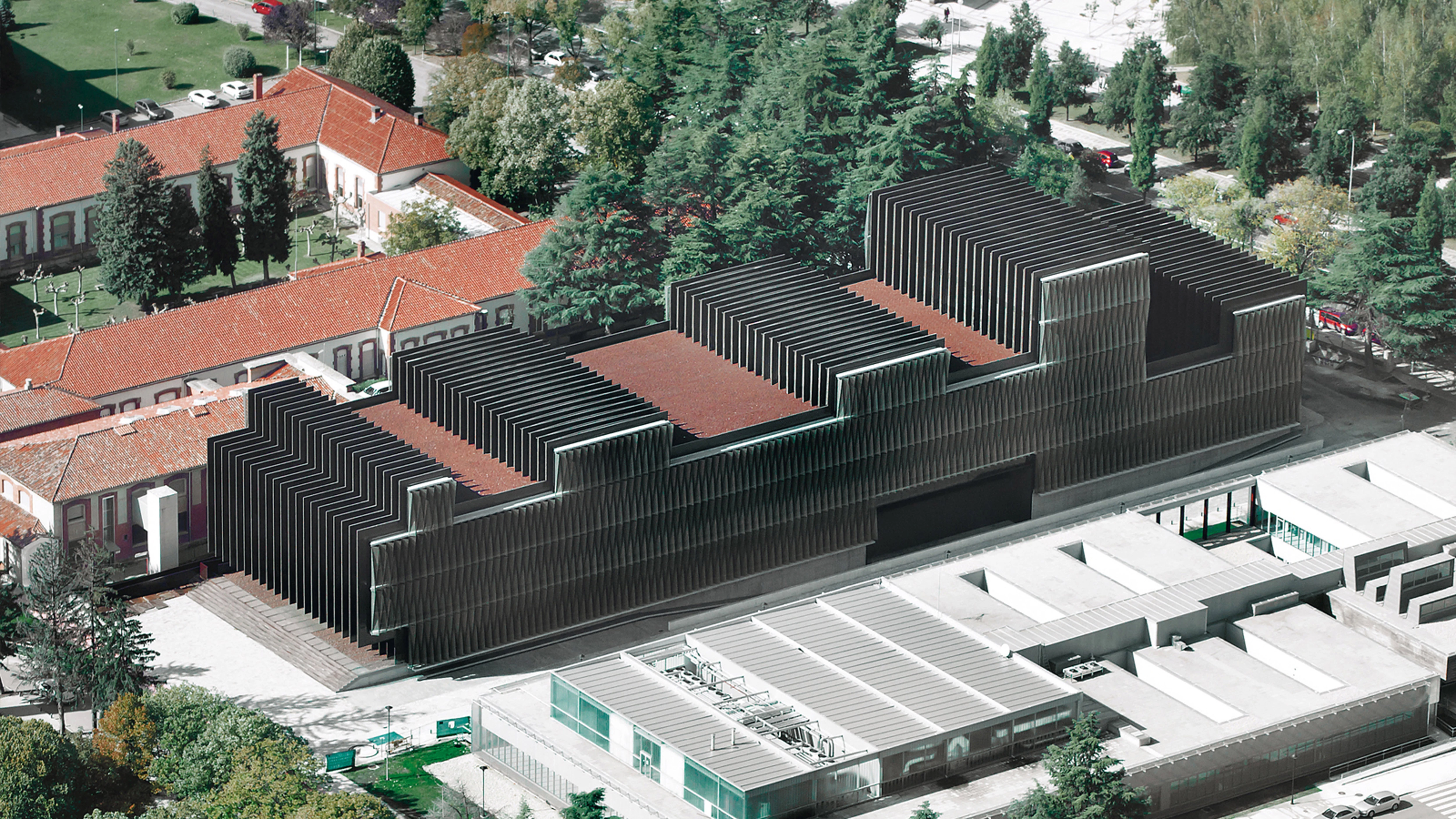 Rising amid pitched-roof brick pavilions, the volume of the center creates an original profile thanks to the variations in height of the ribs surrounding it. While the repetition of the structural ribs and the homogeneity of the skin covering the longitudinal facades bring all the pieces of the building together in one single volume, the geometric alterations in the solid mass address functional requirements of a very specific program that demands a high degree of technological sophistication. Hence, the distribution of the interior program pursues a logical distribution in which the ground floor is devoted to collective and management uses, the basement to animal lab and storage, the floors above grade to laboratories and technical areas, and the roof for systems. The inclusion of the systems in the ribs that wrap the volume generates its characteristic broken section. A large opening opposite the main access separates the technical volume of deposits from the rest of the building and also establishes a secondary access.