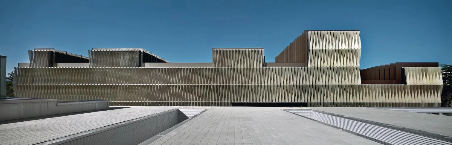 The origami system that geometrizes the anodized aluminum sheets creates triangulated planes and resistant edges, which increases the rigidity of the exterior latticework that works as a solar protection for the labs.