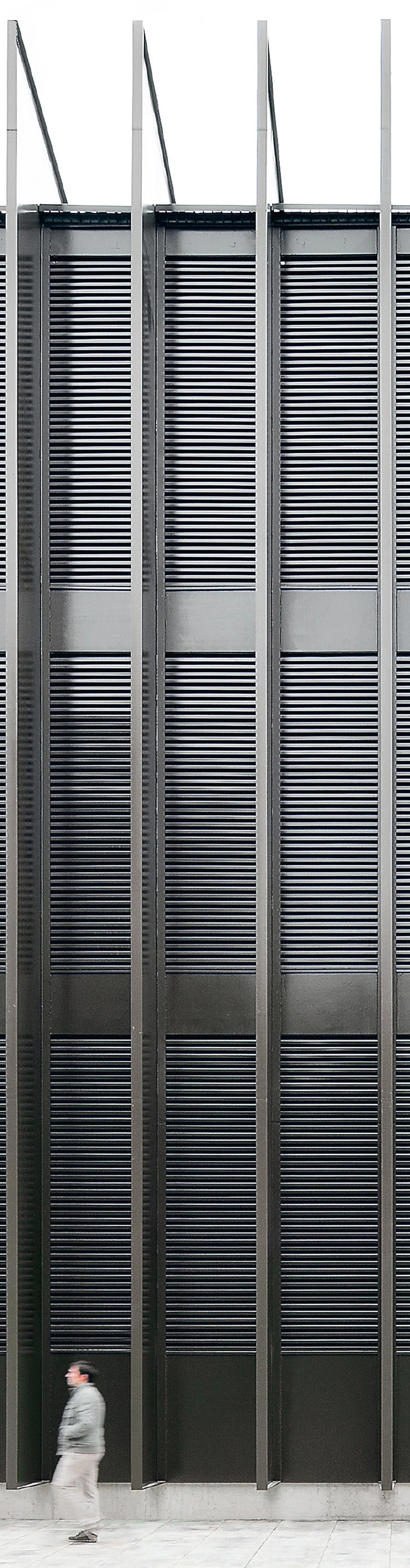 A system of triangulated folds increases the rigidity of the slender perforated sheets of anodized aluminum of 4.5 meters and 3 millimeters in thickness, eliminating in this way the need for a supporting substructure. Aside from making the skin lighter and controlling sunlight, the sheet perforations generate the exterior perception and texture of the building, with a dynamic effect throughout the day depending on the impact of sunlight and the weather conditions.