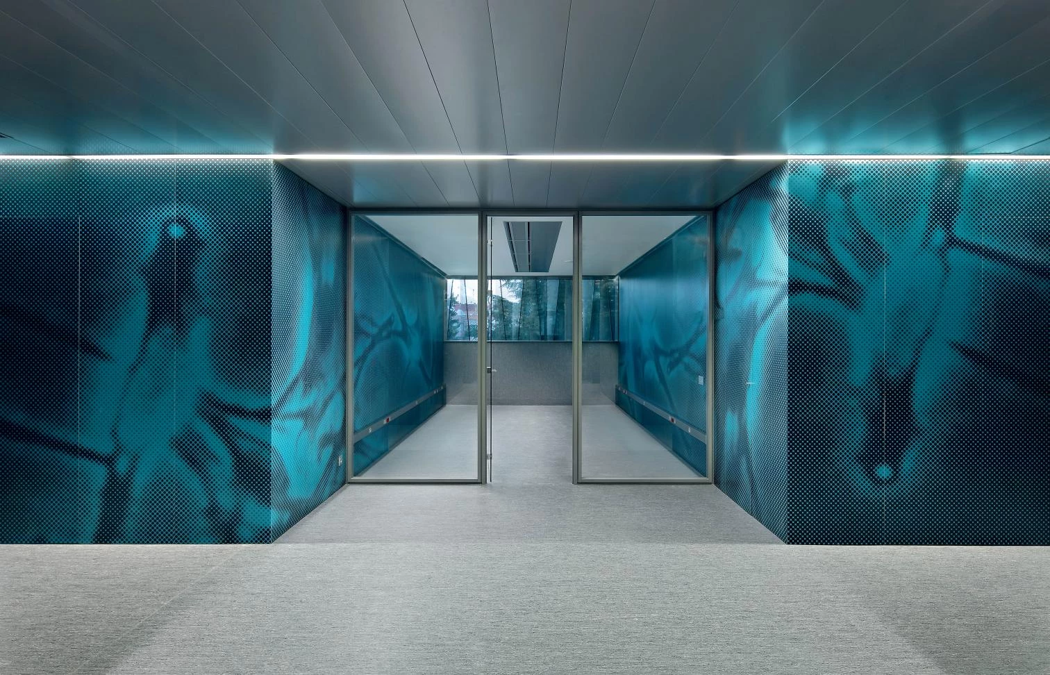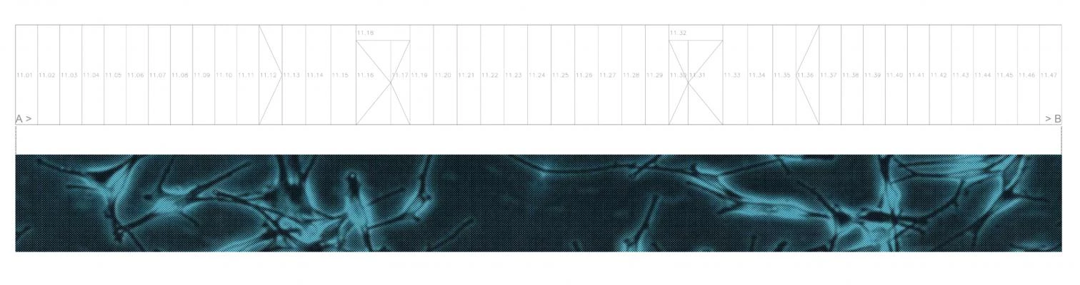 A different surface treatment defines each area of the building. The interior partitions, carried out with high-pressure laminates, reflect enlarged cellular images that give uniform coverage to the surfaces.