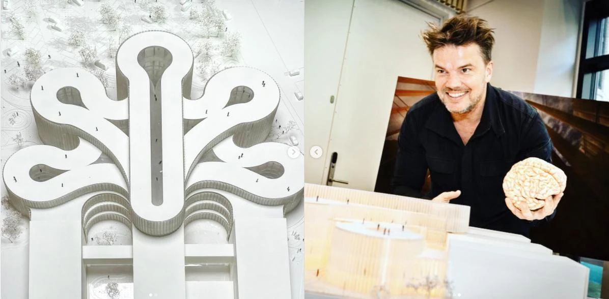 BIG Bjarke Ingels GroupThe Danish firm led by Bjarke Ingels has unveiled its design for a new facility at the university hospital of Aarhus which combines scientific research – in psychiatry and the neurosciences – with medical care for people suffering physical and mental ailments related to the brain, the spinal cord, and the nervous system. Containing 19,000 square meters in six floors arranged around a central atrium, the building imitates the folds of the cerebral cortex, and this results in optimal efficiency of the limited space provided by the plot. To avoid fragmentation and foster interaction among departments, the project organizes them in accordance with shared functions. The biomimetic scheme presents concrete panels of red tones on the outside, so the new facility blends in with the existing brick buildings of the hospital campus. The new center is programmed to open in 2026.