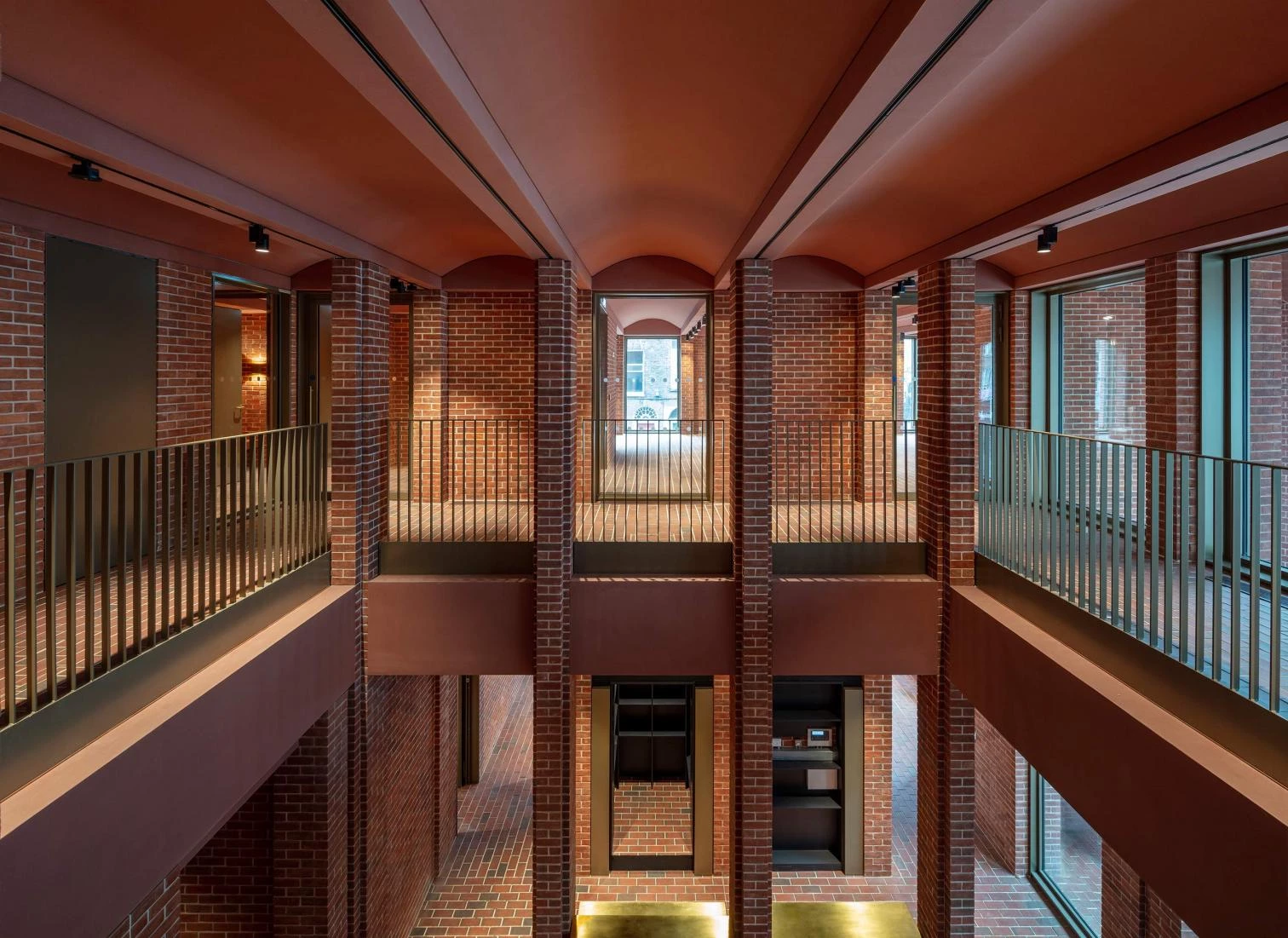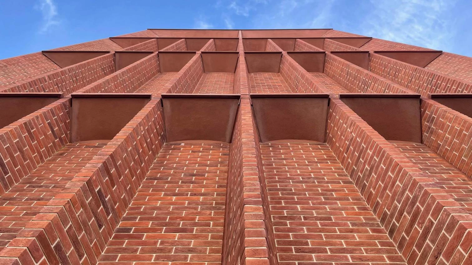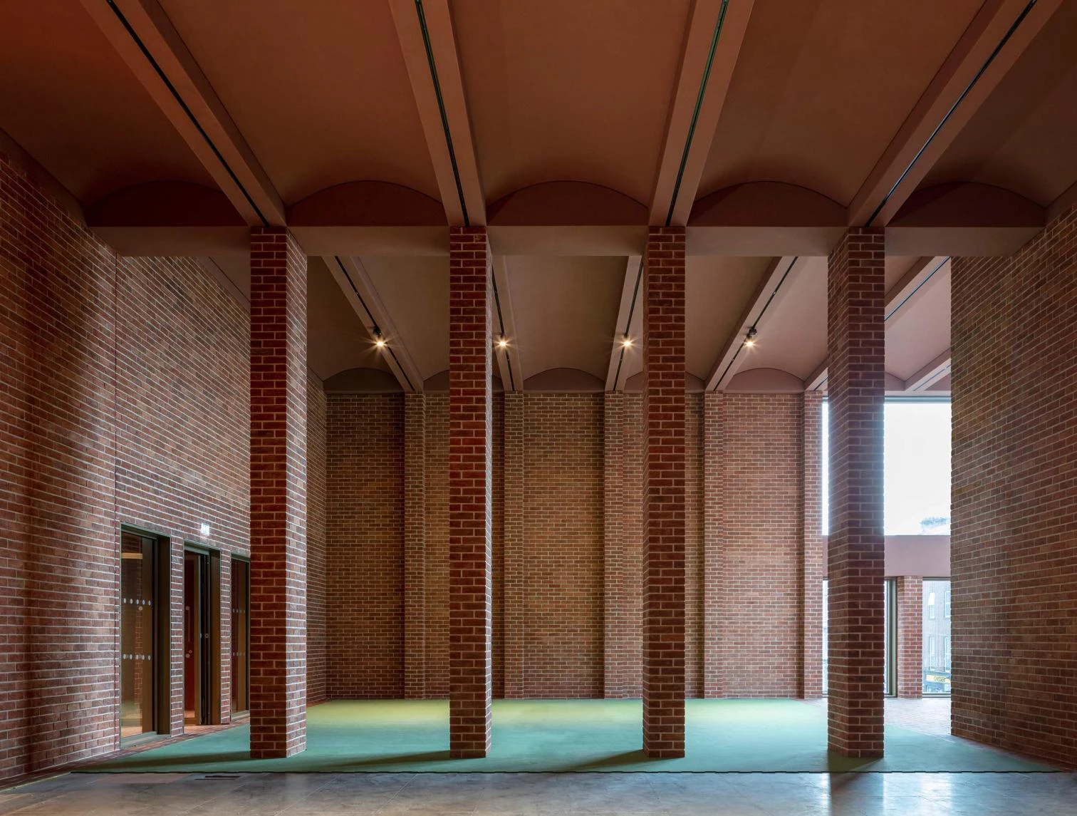 The facades take on a sculptural presence thanks to the reddish-toned brick pillars, in between which stretch horizontal elements of prefabricated concrete. The balance of openings and solid walls is adapted to functions housed indoors. Providing a protected public space, a large portico marks the entrance into the building, the interior of which combines bricks and vaulted ceilings. Upstairs, a public hall with double-height windows gives panoramic views of the city.