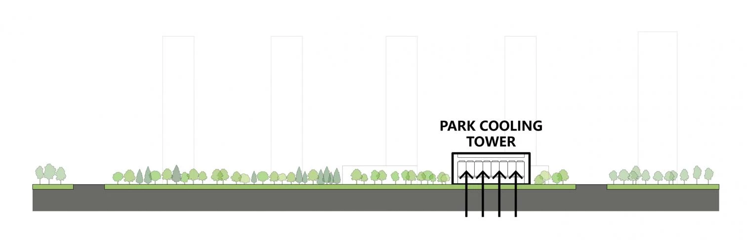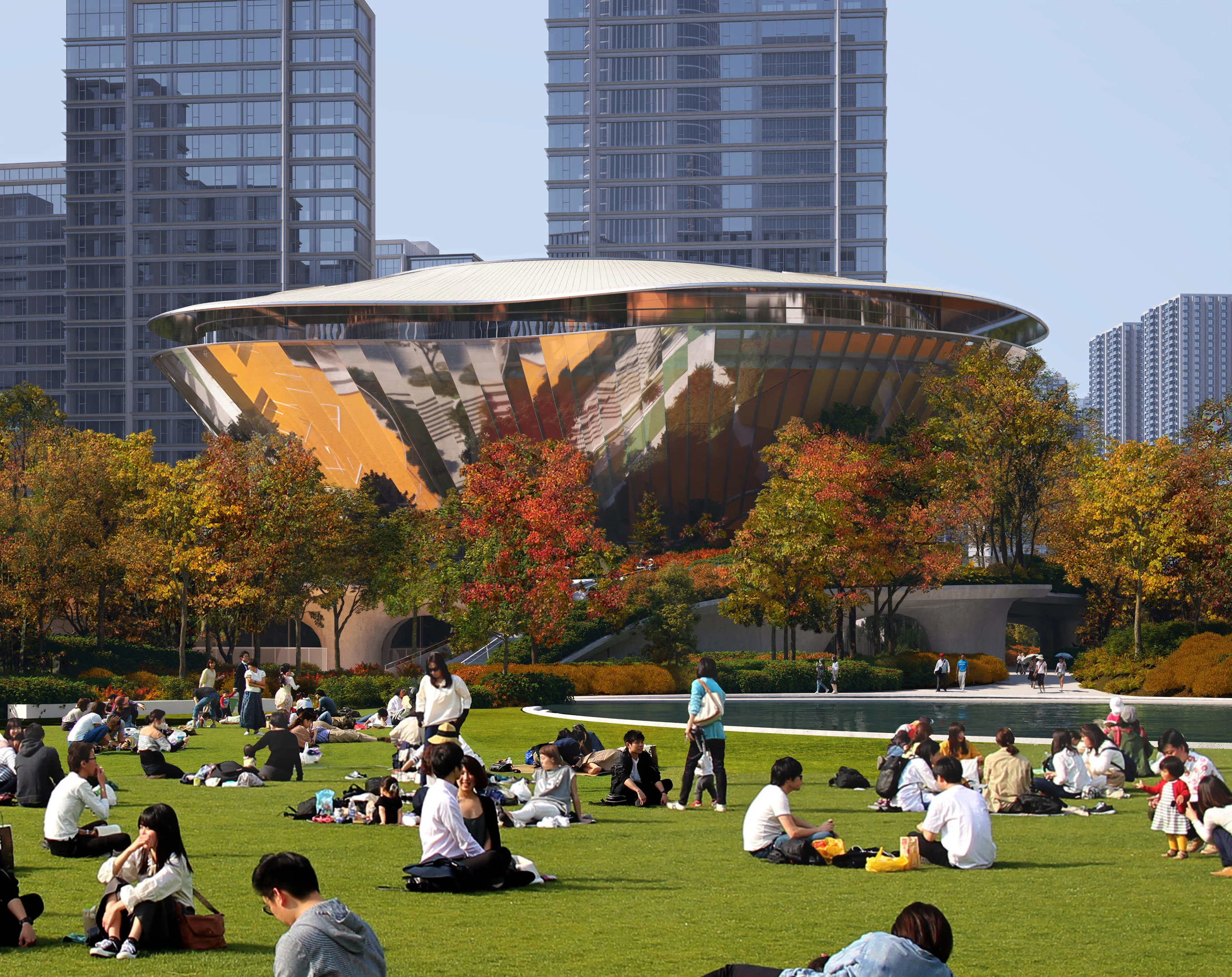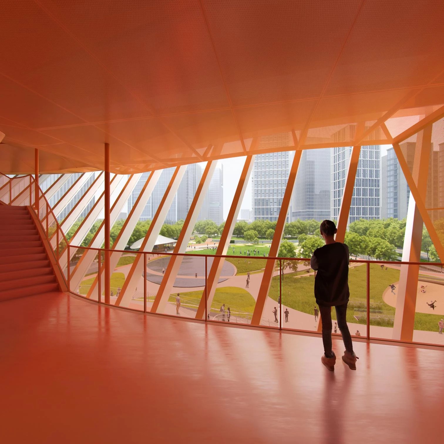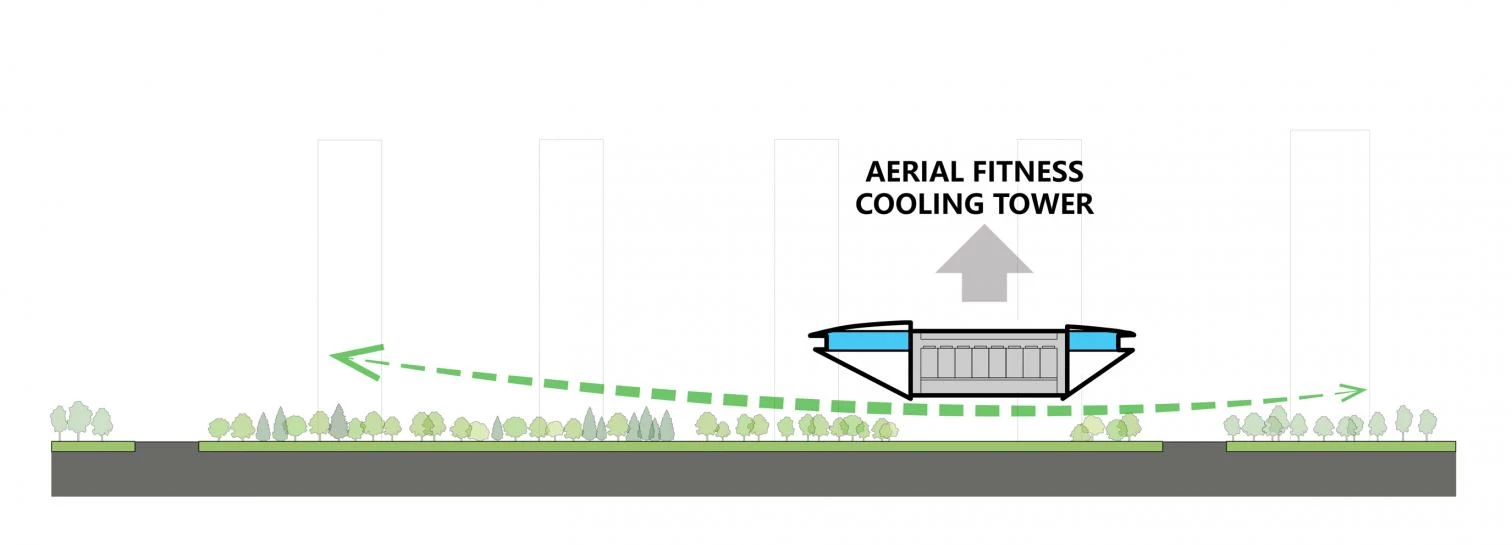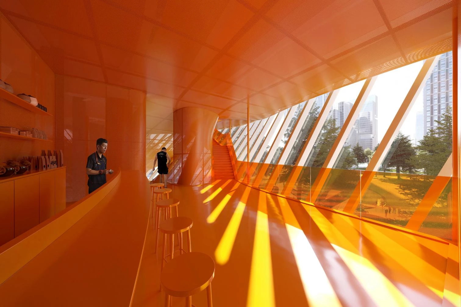 The facilities include a gym, indoor and outdoor tennis courts, an athletics track, a bar, and an observation deck for panoramic views, besides green roofs and landscaped areas that help to blend the complex into the environment, in the manner of the extension of an existing park. The exterior of the building is clad in a translucent ETFE membrane material with a metallic coating, reflecting the surroundings. Further enhancing the functionality and sustainability of the complex are cooling towers stategically situated on the second level, which solve the problem of ventilating the subsoil and optimize air circulation.